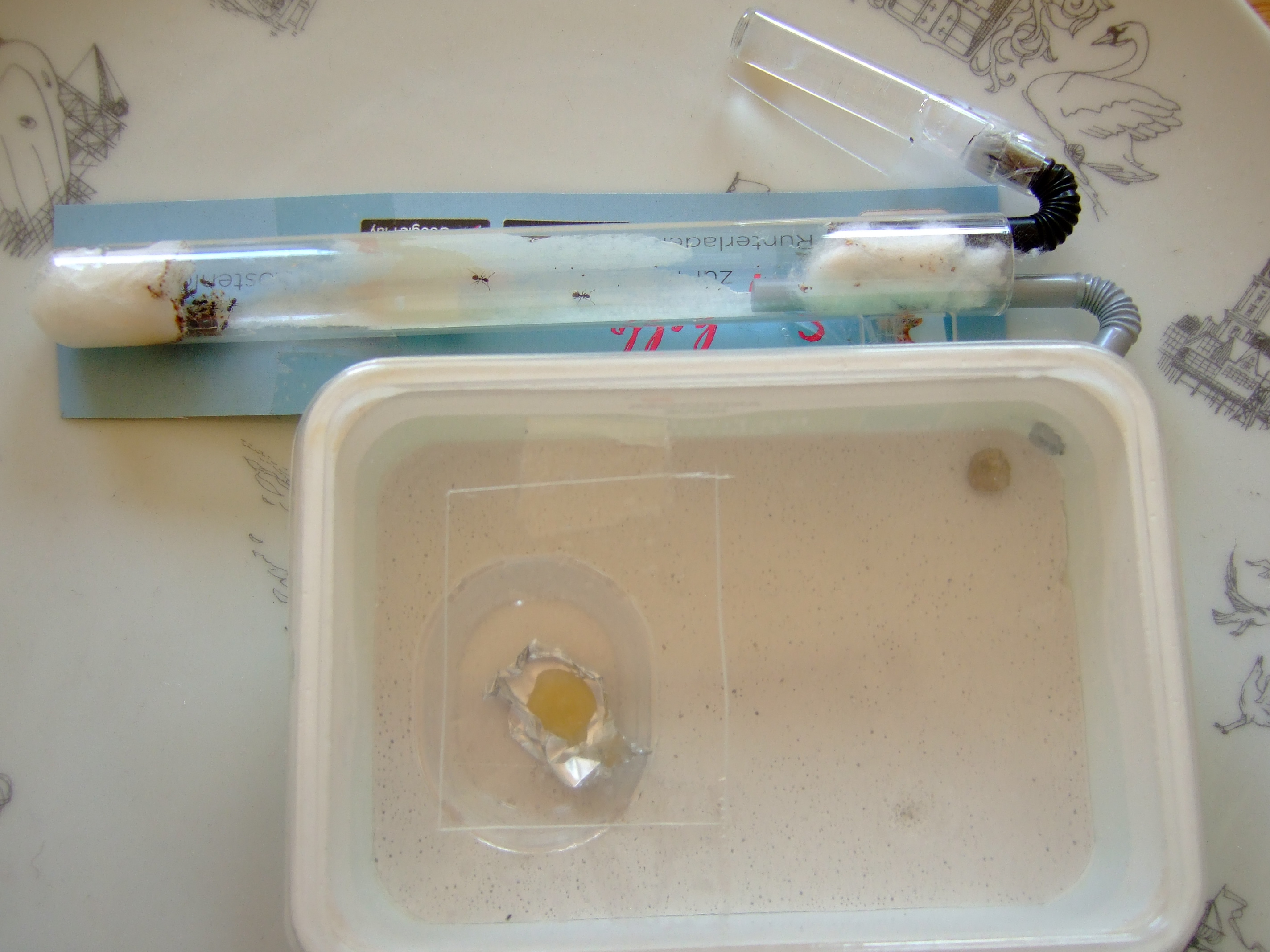 Eben gerade saßen zwei Ameisen am Honig. Es sind ĂŒbrigens 17 Kleine bis jetzt geschlĂŒpft :)