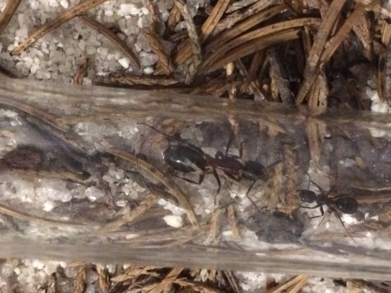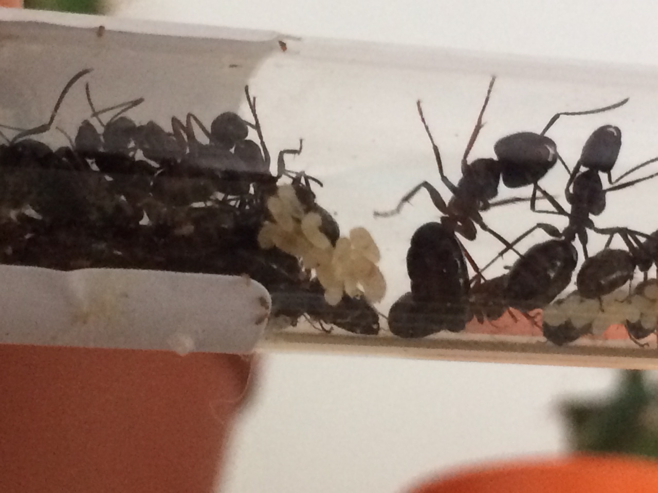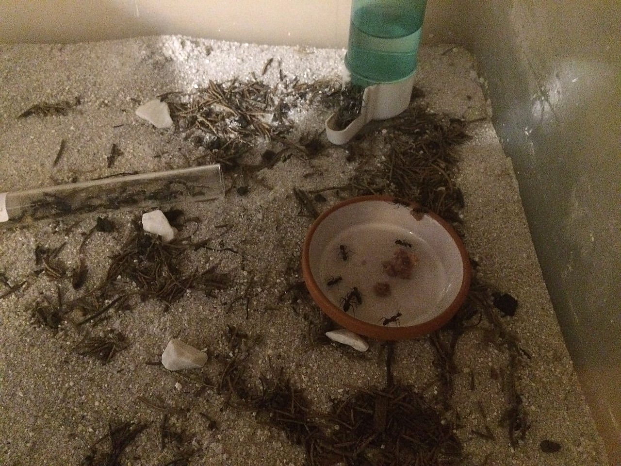 Diese Kolonie entwickelt sich prächtig. Mittlerweile sind 3 deutlich größere Major Arbeiterinnen darunter, von denen 2 zusammen mit 3-5 kleineren die Futterstelle bewachen und eine meistens den Eingang zum Reagenzglas. Weitere 5 Arbeiterinnen sind fast immer beim Wasser. Insgesamt sind es ca 50 Arbeiterinnen und Brut in allen Stadien, also ist das Reagenzglas inzwischen sehr eng. Ich probiere in den nächsten Tagen, ob ein größeres Reagenzglas akzeptiert wird, denn eigentlich wollte ich erst nächste Saison ein großes Nest organisieren.