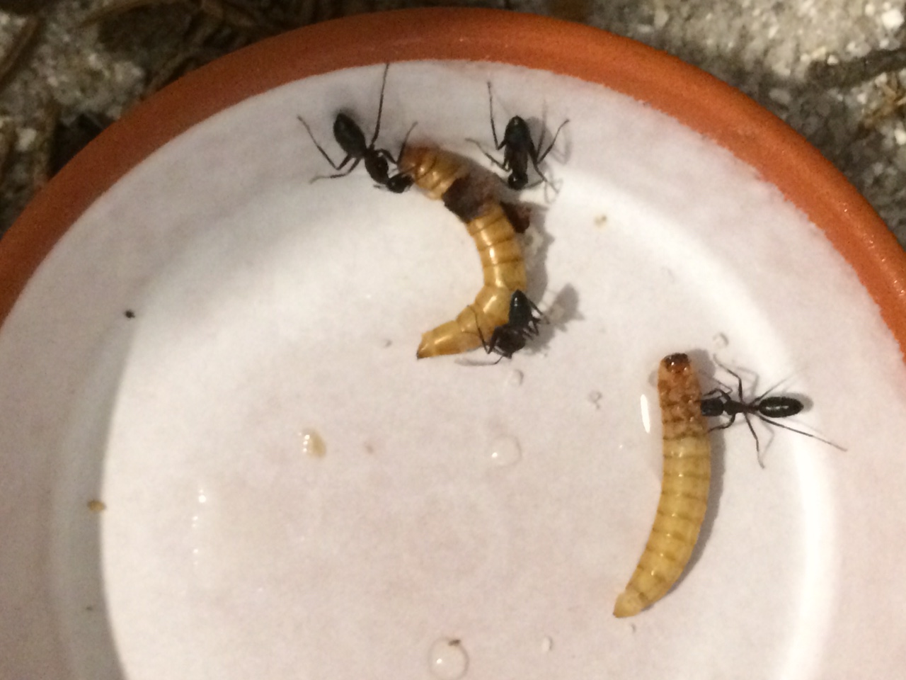 Jetzt höhlt eine einzelne Arbeiterin genüsslich den Mehlwurm aus und läuft zwischen Nest und Futterplatz hin und her: