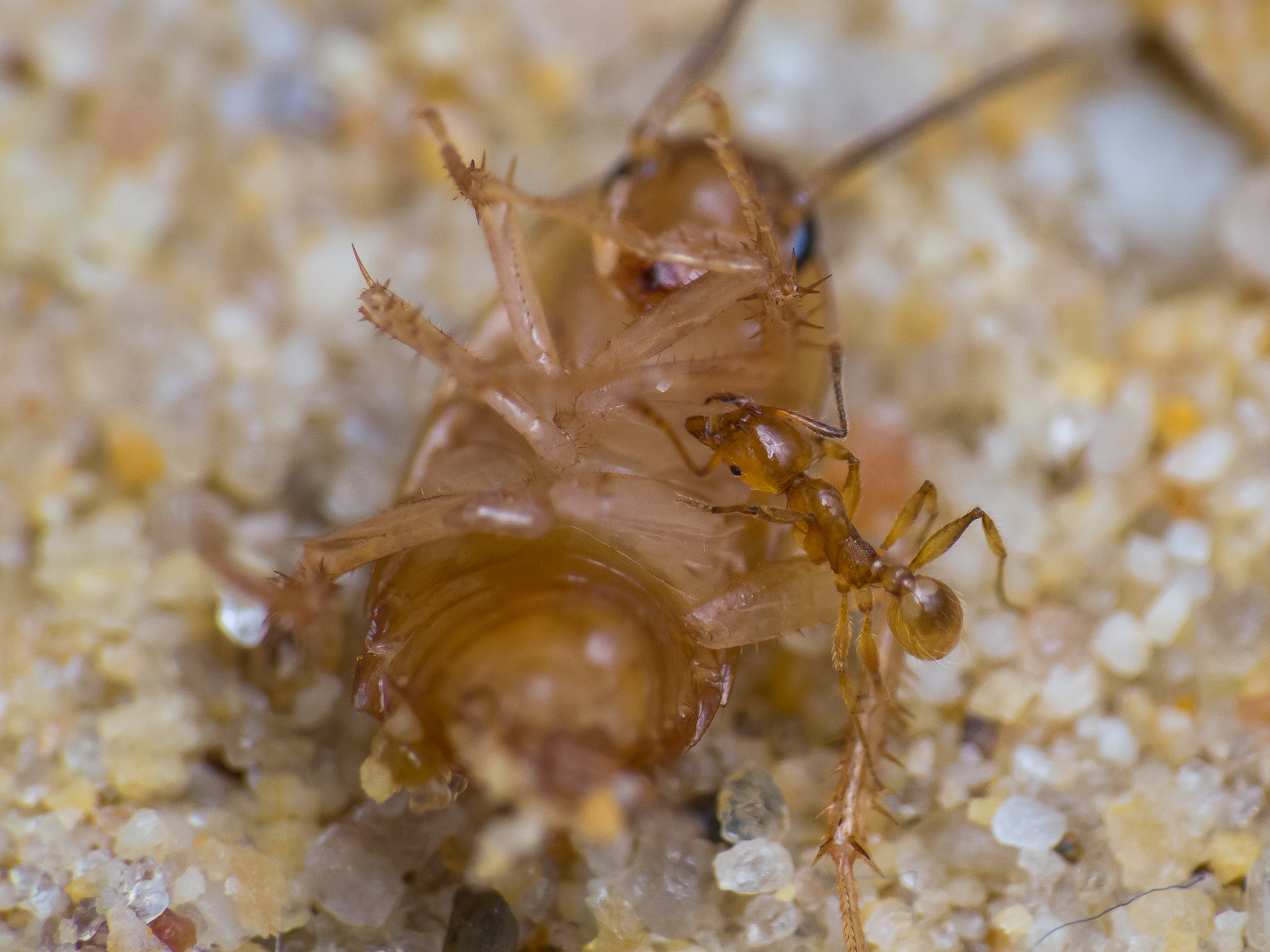 Bei der Schabennymphe, die ich dann heute verfüttert habe, kam es leider zu keiner großen Rekrutierung, weil die Minor-Arbeiterin meinte sie schafft es die Schabe alleine ins Nest zu ziehen (und das schaffte sie erstaunlicherweise auch):