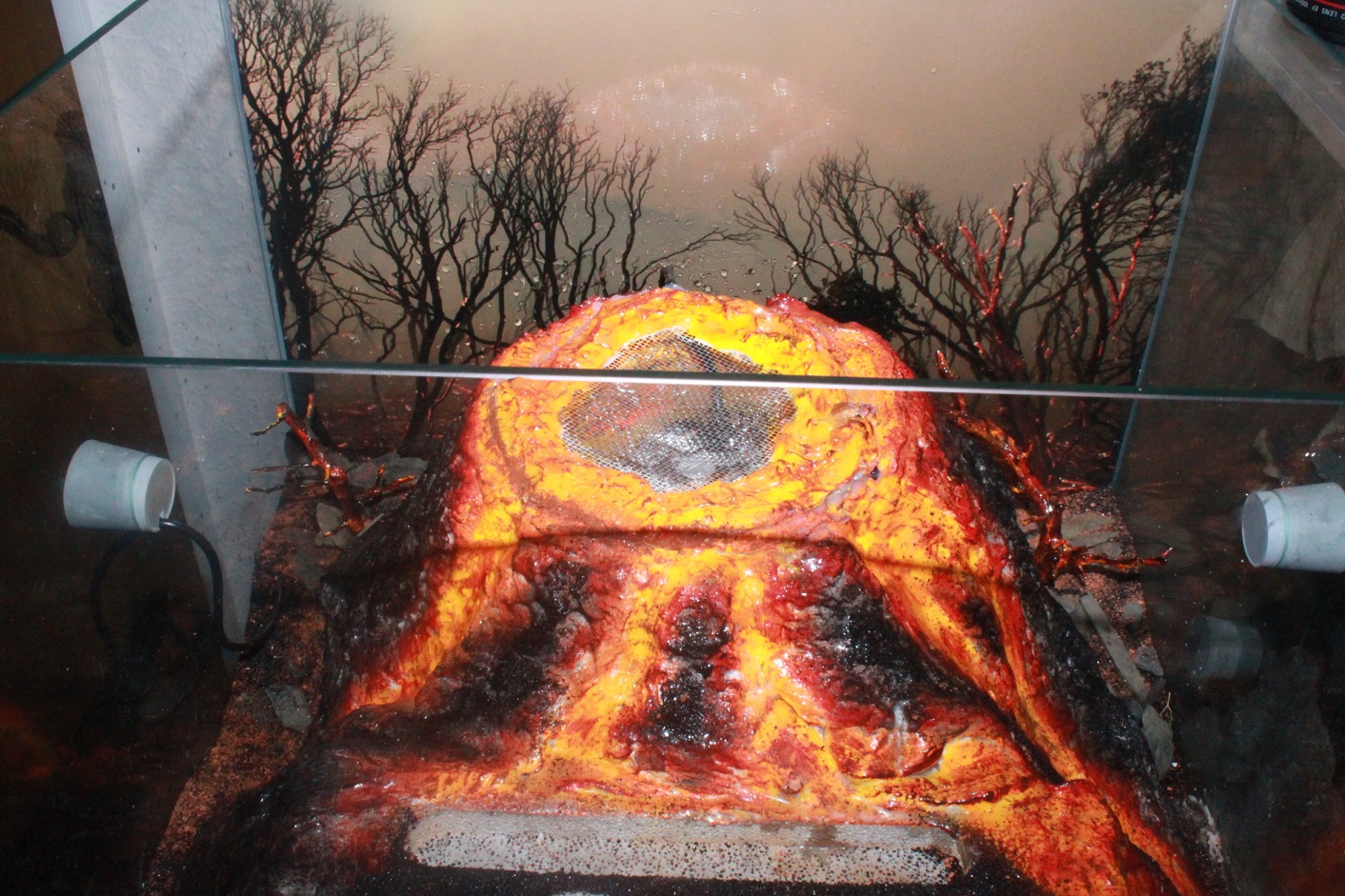 . Die Lava wirkt brennend heiß und spätestens, wenn der Nebler im Einsatz ist und auch noch Musik dazu gespielt wird, hat das Ganze bestimmt Gänsehautcharakter. Welche Art wird oder wurde denn darin gehalten? Es macht den Anschein, als wäre auf den oberen Rand, ein Streifen Talkum als Ausbruchschutz aufgetragen. Der kann doch nicht lange beständig bleiben bei den wiederkehrenden Vulkanausbrüchen oder wie handhabst du das?