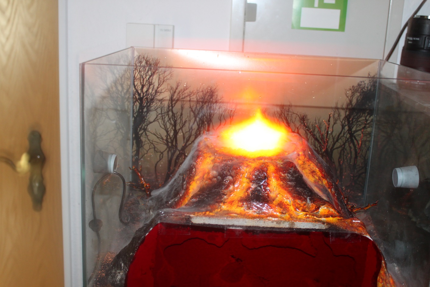 Der Vulkan ist handmodelliert. Das Thema ist eigentlich erst in meinem Kopf gereift, nachdem ich ein Poster gefunden habe (Rückwandbild) und mir dachte, daraus kann man doch was machen. Ich habe zuerst kleine Äste gebastelt und angemalt um zu gucken, wie nah komm ich an die Bäumchen im Bild ran. Das hat ganz gut funktioniert, also dachte ich mir irgendwas muss ich basteln, damit man auch weiß wieso es brennt, so entstand dann der Vulkan. Mittels Nebler und Beleuchtung habe ich dann meine eigene Befeuchtung im Terrarium geschaffen. Der Vulkan bricht täglich um 18 Uhr einmal aus. Ich habe mittlerweile auch eine Stereobox angesteuert, die gleichzeitig einen entsprechenden Sound des Ausbruchs startet.