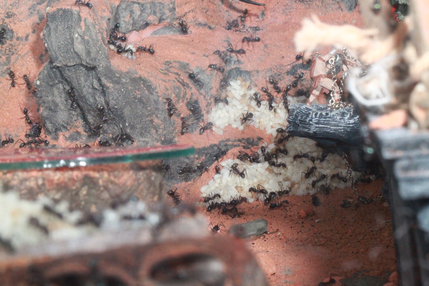 Vor den Camponotus haben hier meine Iridomyrmex gelebt, denen ich immer noch nachtrauere. Es war eine meiner allerliebsten Kolonien. Sehr volkstark so dass ich 2 weitere 80x50x50 Terrarien anschließen musste, da ich trotz Ausbruchschutz sonst den Deckel nicht mehr heben konnte. Leider ist die