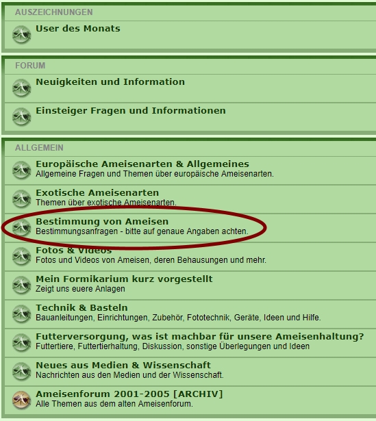 Für unser Szenario wählst du das Unterforum "Bestimmung von Ameisen" aus und klickst dieses an.