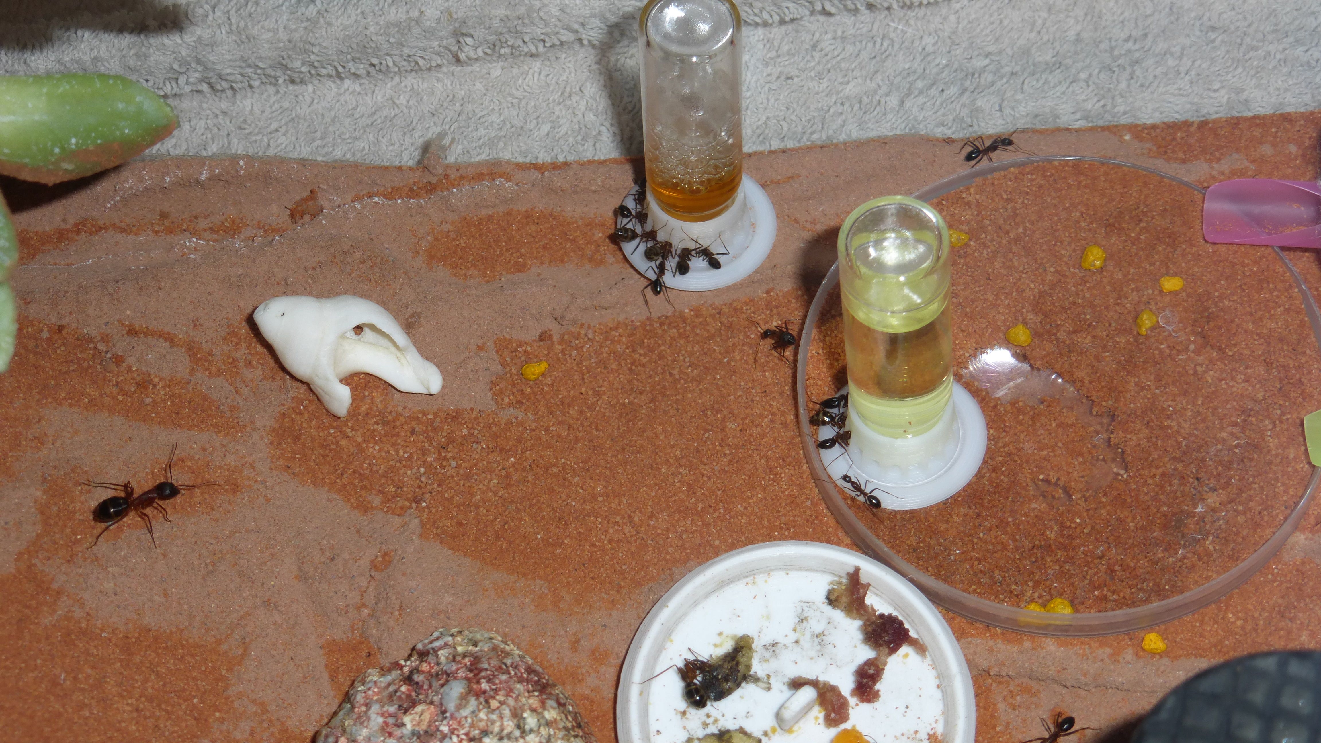 Die Fruchtfliegen in der Gefriertruhe sind leider schlecht geworden (hab aus versehen über Nacht die Gefriertruhe offengelassen und die Fruchtfliegen waren ganz vorne, zum Glück ist der Bienenbrut nichts passiert), also musste ne neue Box her. In den letzten zwei Tagen haben die Ameisen ungefähr 200 Fruchtfliegen verputzt, zusätzlich zu der Bienenbrut und etwas Hackfleisch.