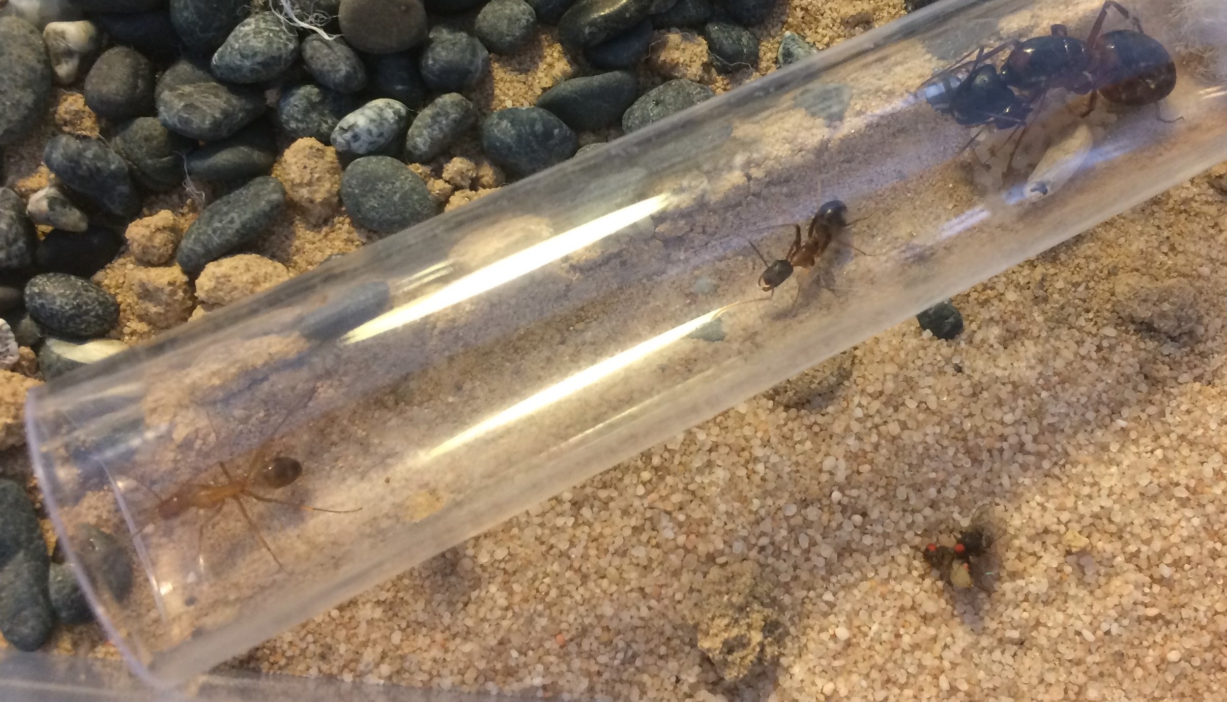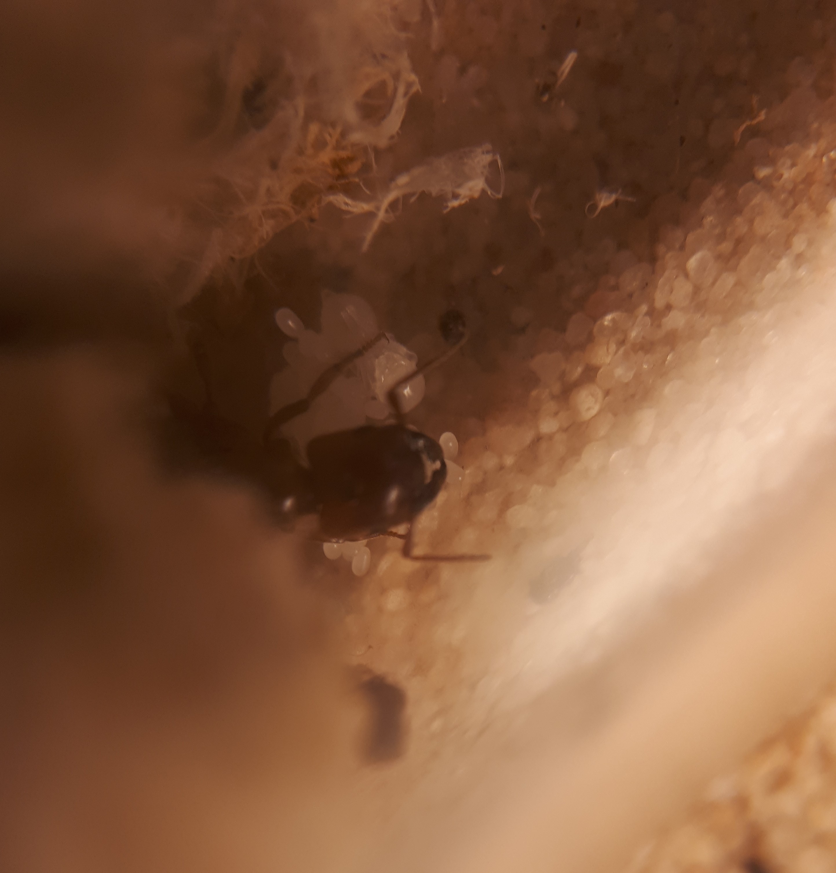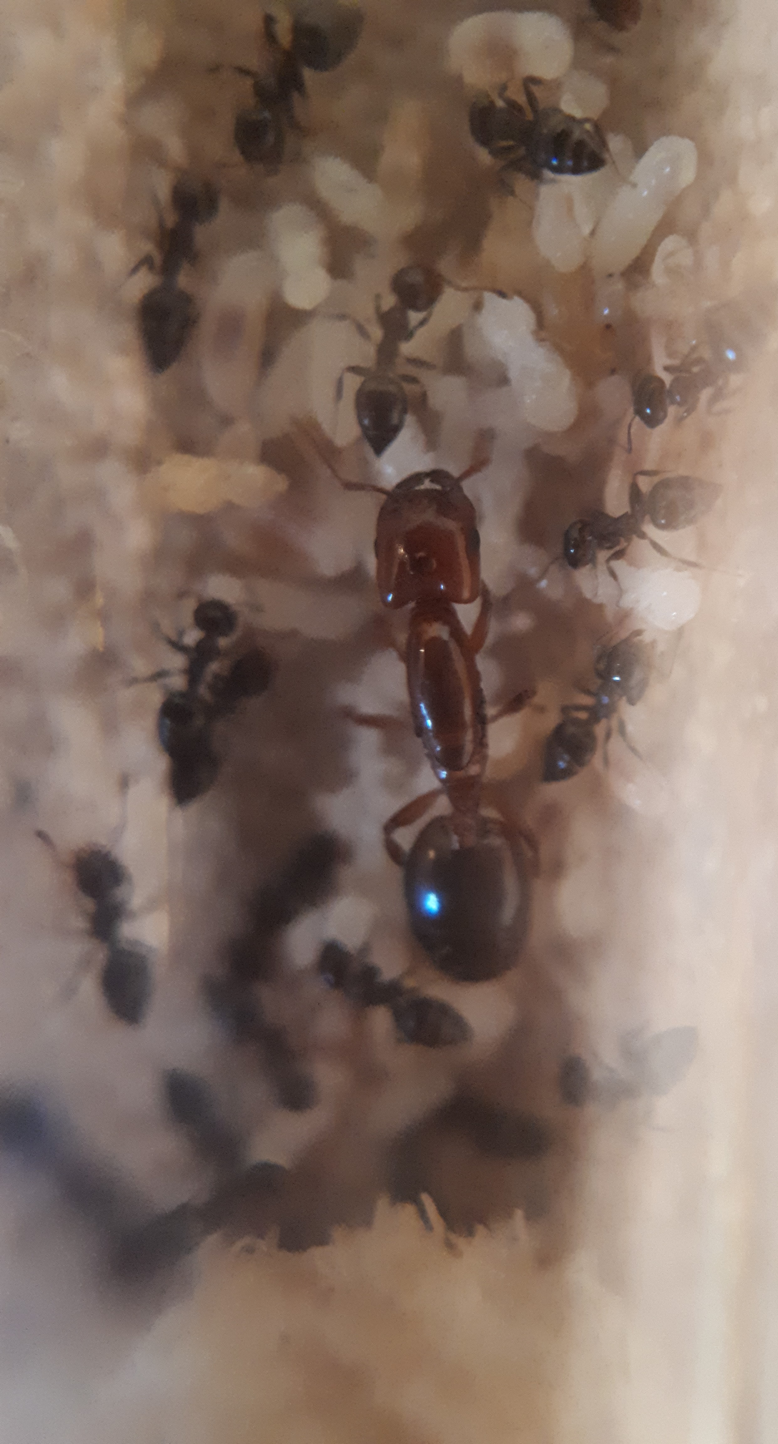 - So sieht es jetzt aus. Wie auf dem Bild zu erkennen ist, fehlt die Nacktpuppe, die glaube ich wieder gefressen wurde. Warum die Ameisen das tun weiß ich nicht. Füttern tue ich eigentlich genug. Der kleine Rote Punkt im Hintergrund ist das Auge einer Obstfliege.