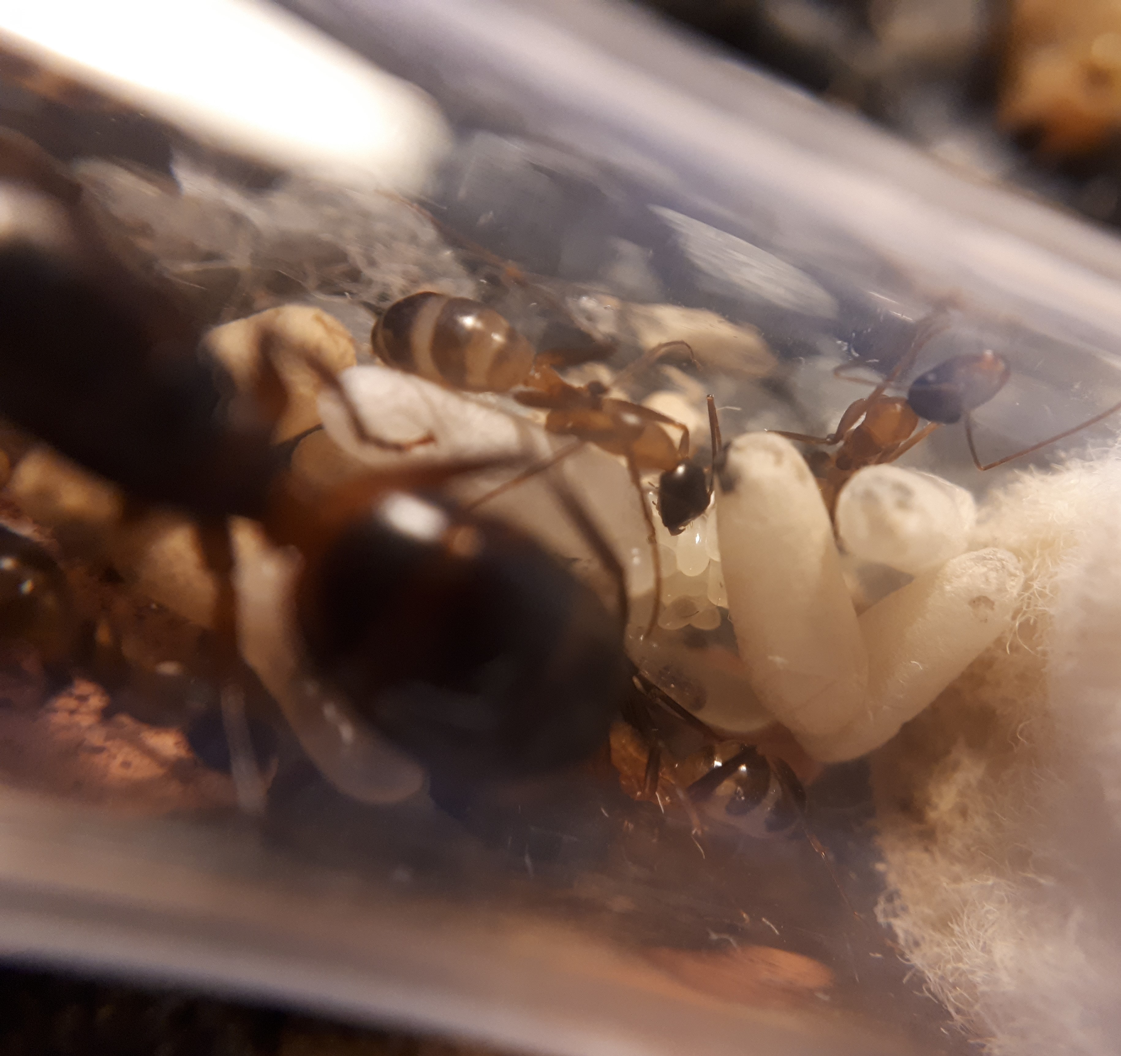 - Ein Bild der Kolonie, als sie schon nur eine Arbeiterin hatte. Die beiden Larven haben sich zu Nacktpuppen entwickelt.