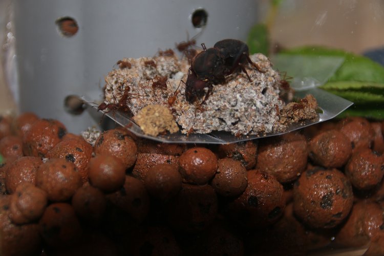 Der Pilz war durch den groben Transport in allen möglichen kleinen Brocken auseinandergefallen. Ich konnte diesen Pilz nicht auf die Tongranulate übertragen. Dann würde es dazwischen fallen und es wäre verloren. Ich nahm dann eine Plastikplatte und schnitt sie so, dass sie in den Nest passte. Ich habe auch einige Rillen gemacht, damit die Feuchtigkeit und die Arbeiter auch von unterhalb an der Pilz kommen können. Dann habe ich vorsichtig alle Pilz mit den Arbeiterinnen auf die Plastikplatte im Nest gelegt. Die Arbeiterinnen begannen sofort, all diese losen Teile zu sammeln und in ein paar Stunden eine ganze Pilz herzustellen.