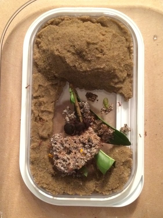 Mit einem Lötkolben habe ich 3 kleine Belüftungslöcher im Boden der Box (die auf dem Kopf stand) geschmolzen und in der Seite einen etwas größeren Nesteingang. Dieser Nesteingang war jedoch so klein, dass dieGyne das Nest nicht verlassen konnte. Ich legte feuchten Sand auf eine Seite des Deckels (der jetzt als Boden diente). Zum Beispiel wurde der Innenraum kleiner und ich konnte dem Sand Feuchtigkeit über eine Spritze verabreichen, sodass die Feuchtigkeit gut erhalten blieb.