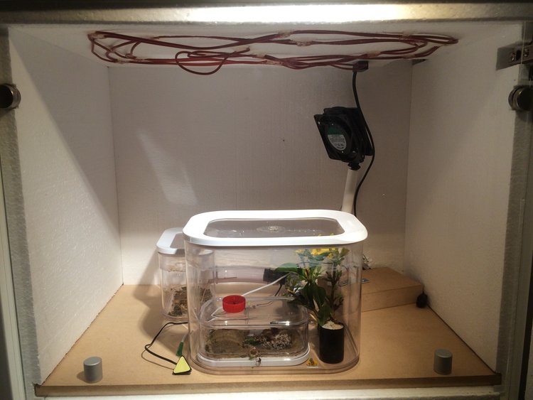 Im Folgenden sehen Sie, wie ich das Setup ursprünglich geplant habe. Zuerst habe ich ein paar Tage getestet, um zu sehen, ob ich Feuchtigkeit und Temperatur auf dem richtigen Niveau halten kann.