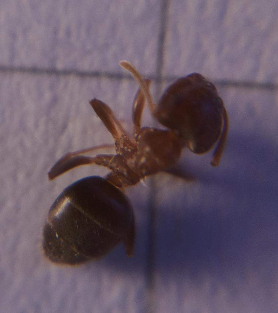 diese Arbeiterin habe ich in einer Wohnung gefangen. Sie wirkte nicht gerade schreckhaft, kann aber recht schnell laufen, wenn sie MenschenhÀnden zu entkommen versucht. Sie ist brÀunlich gefÀrbt und etwa 5 mm lang. Der BehÀlter, in dem ich sie transportiert habe, war etwas staubig.
