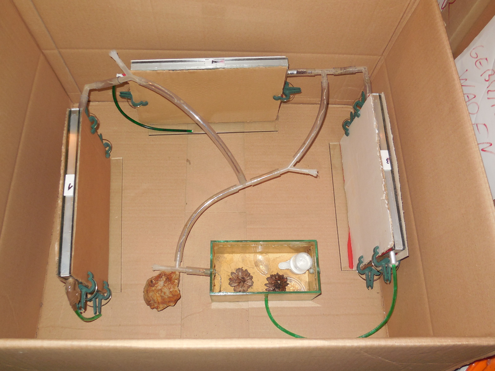 Nachdem es laut Wetterbericht nun wärmer werden soll und ich gestern die erste Ameise in freier Wildbahn habe krabbeln sehen, wanderte meine Kolonie heute vom Kühlschrank in den Keller. Dort herrschen ca. 13-14 Grad. Beim Aufstellen der Anlage gab es auch gleich den ersten Todesfall, als ich eine Ausgebüxte mit der Federstahlpinzette zerquetschte. Ansonsten verlief alles ohne Probleme. Da ich nicht richtig aufgepasst habe, stehen die Farmen 3 und 4 dieses Jahr vertauscht.
