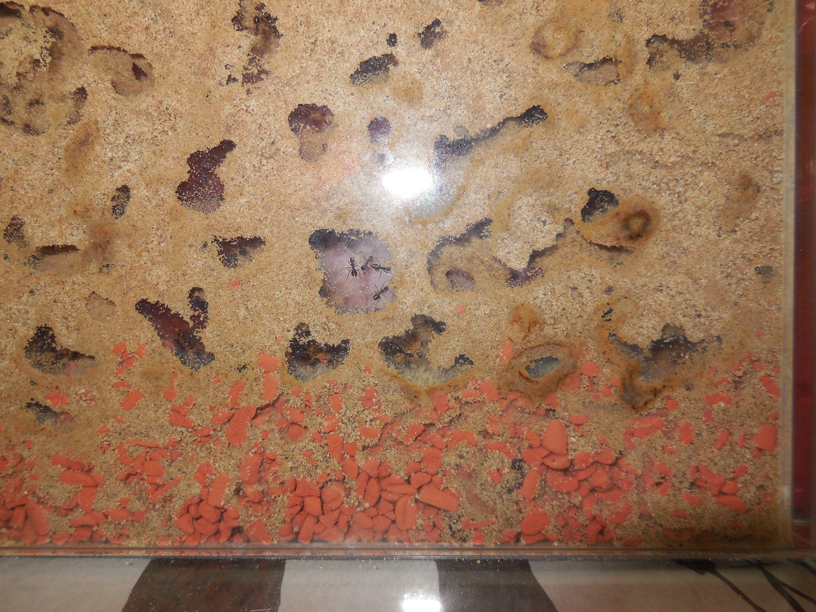 Im Keller waren es dann auch Tiere aus Farm 3, die bereits nach wenigen Minuten die Farm verließen. Einige Stunden später war die Arena gut besucht und der dort angebotene Honig heiß begehrt. Allerdings schien es sich fast ausschließlich um Tiere aus Farm 2 und 3 zu handeln, im Schlauch zu Farm 1 befand sich nur 1 Ameise.