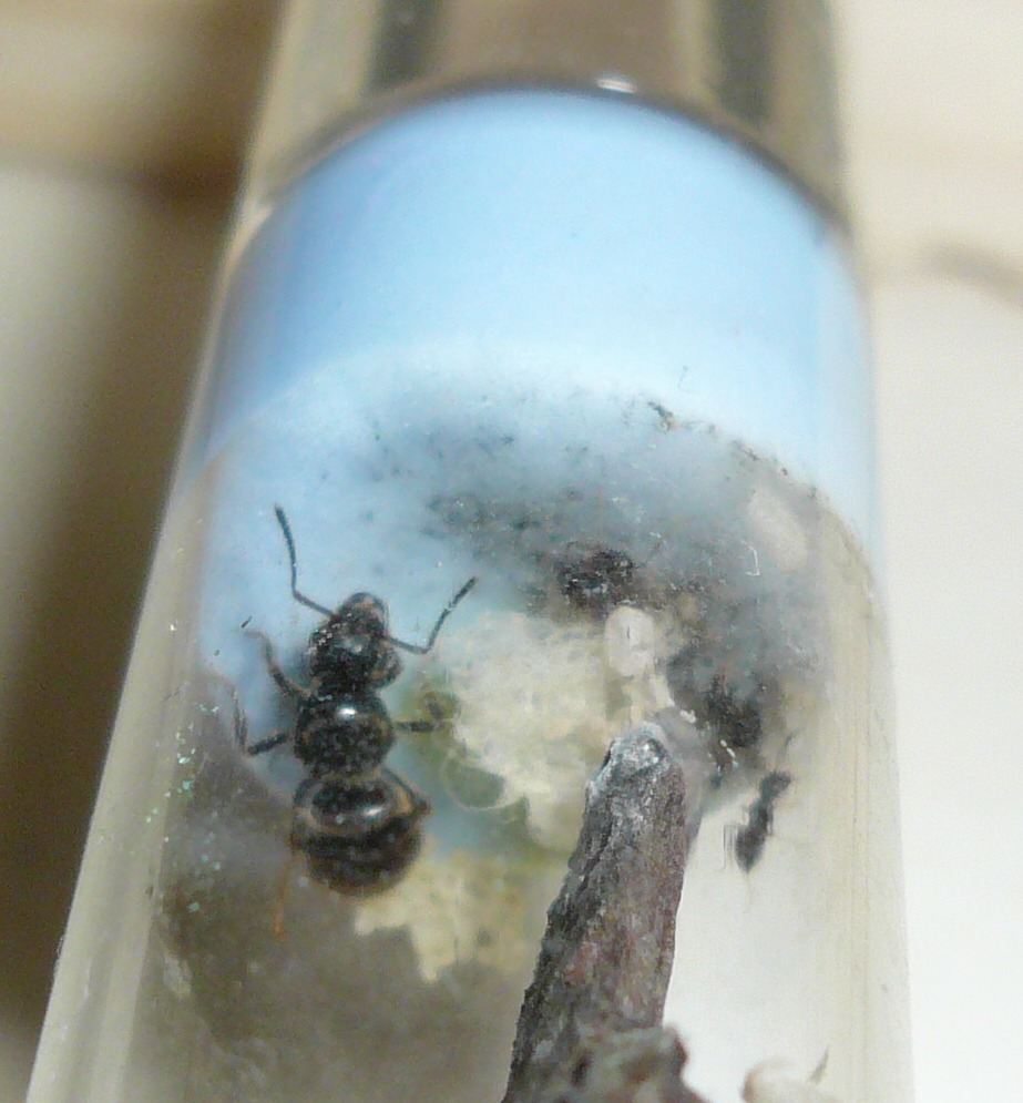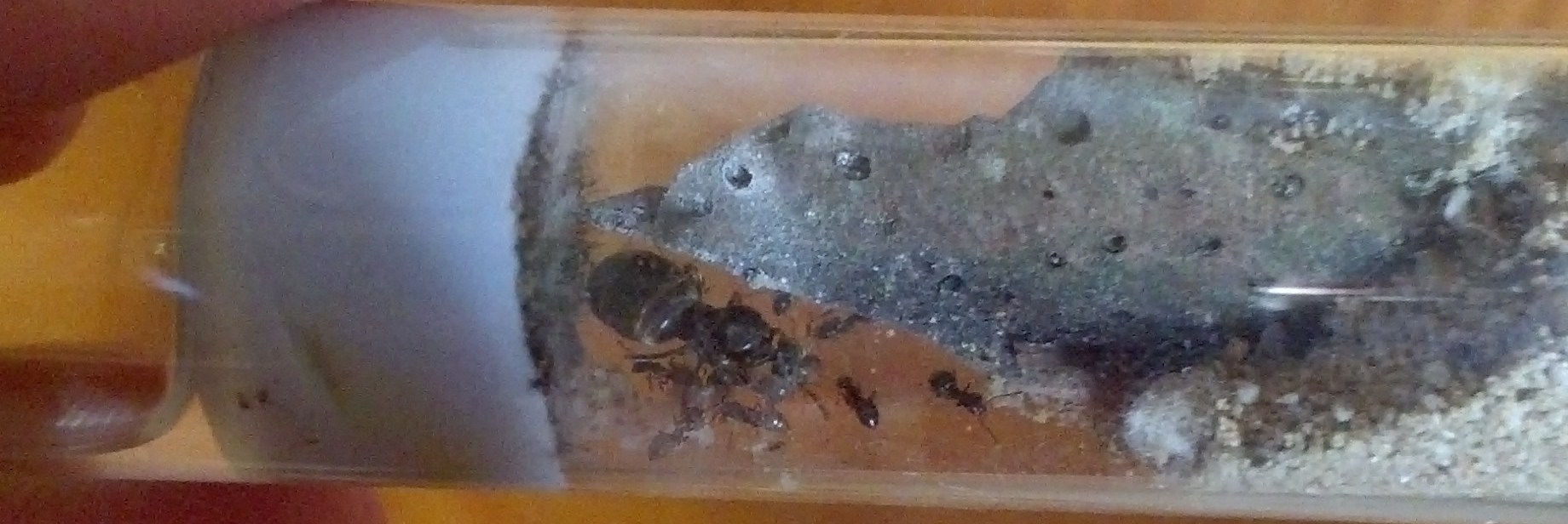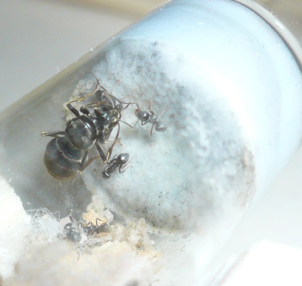 Die Camponotus herculeanus, die ich beim letzten Update gefangen hatte, grĂŒndete prĂ€chtig, immerhin hatte ich ihr schön viel Zeit und Ruhe gelassen. Zu viel Zeit und Ruhe, wie es scheint, denn als ich nach privatem Stress endlich wieder nach meinerKönigin sehen wollte, saĂ diese mit einer lebenden und mehreren Toten sowie sehr wenig Brut da. Ich hĂ€tte wohl doch frĂŒher mit FĂŒttern anfangen sollen, wirklich sehr Ă€rgerlich. Mal sehen, ob aus den beiden noch was gröĂeres wird ^^