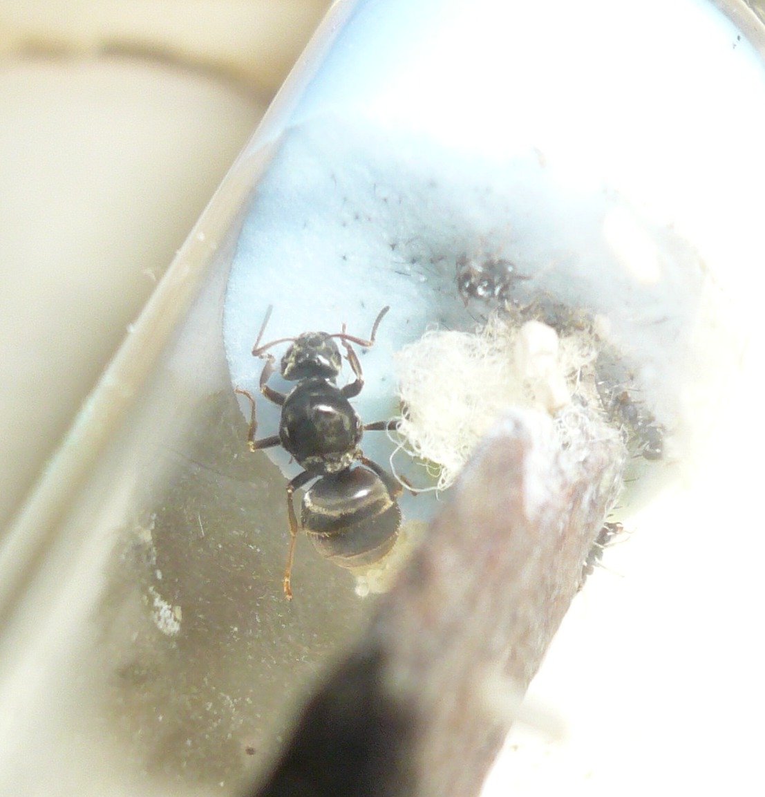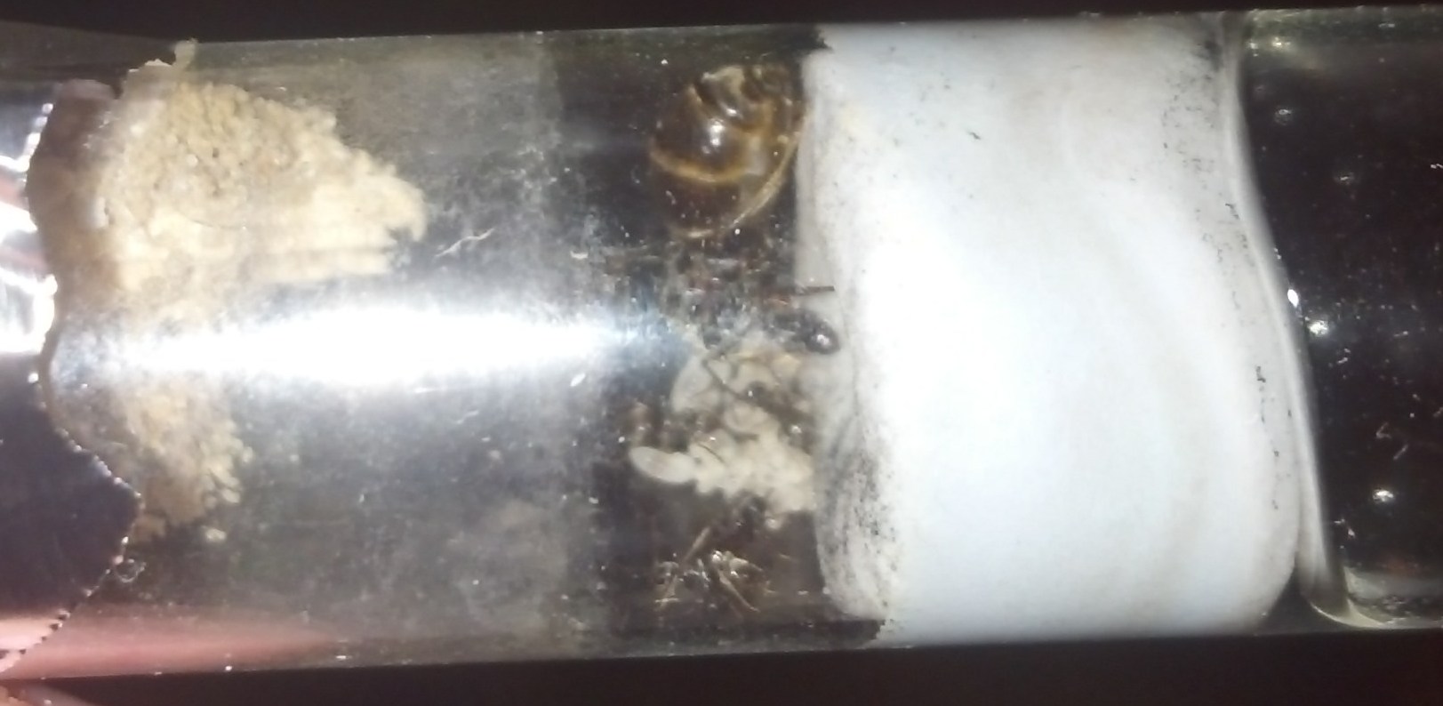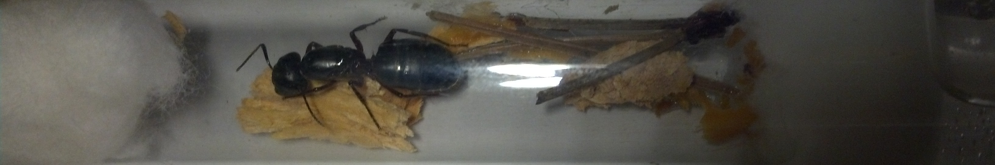 Die Camponotus herculeanus, die ich beim letzten Update gefangen hatte, grĂŒndete prĂ€chtig, immerhin hatte ich ihr schön viel Zeit und Ruhe gelassen. Zu viel Zeit und Ruhe, wie es scheint, denn als ich nach privatem Stress endlich wieder nach meinerKönigin sehen wollte, saĂ diese mit einer lebenden und mehreren Toten sowie sehr wenig Brut da. Ich hĂ€tte wohl doch frĂŒher mit FĂŒttern anfangen sollen, wirklich sehr Ă€rgerlich. Mal sehen, ob aus den beiden noch was gröĂeres wird ^^