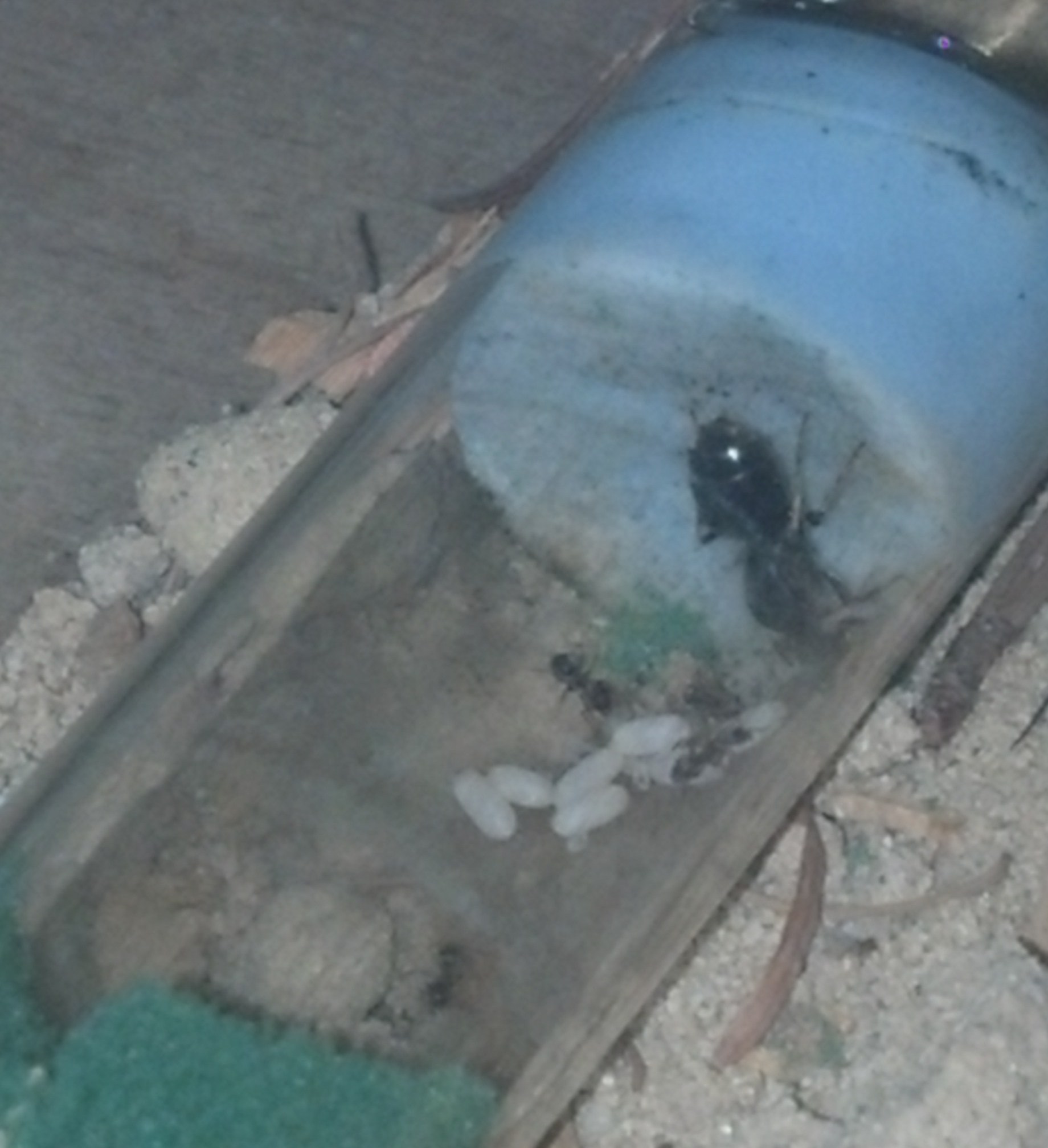 Ich habe gesehen, dass sie teilweise Schwierigkeiten mit Glas haben und auch den Boden ihres RGes mit Sand ausgekleidet, das hat mich dazu bewogen, der neu gefangenen Camponotus-Gyne ein bisschen Holz mit ins RG zu geben.