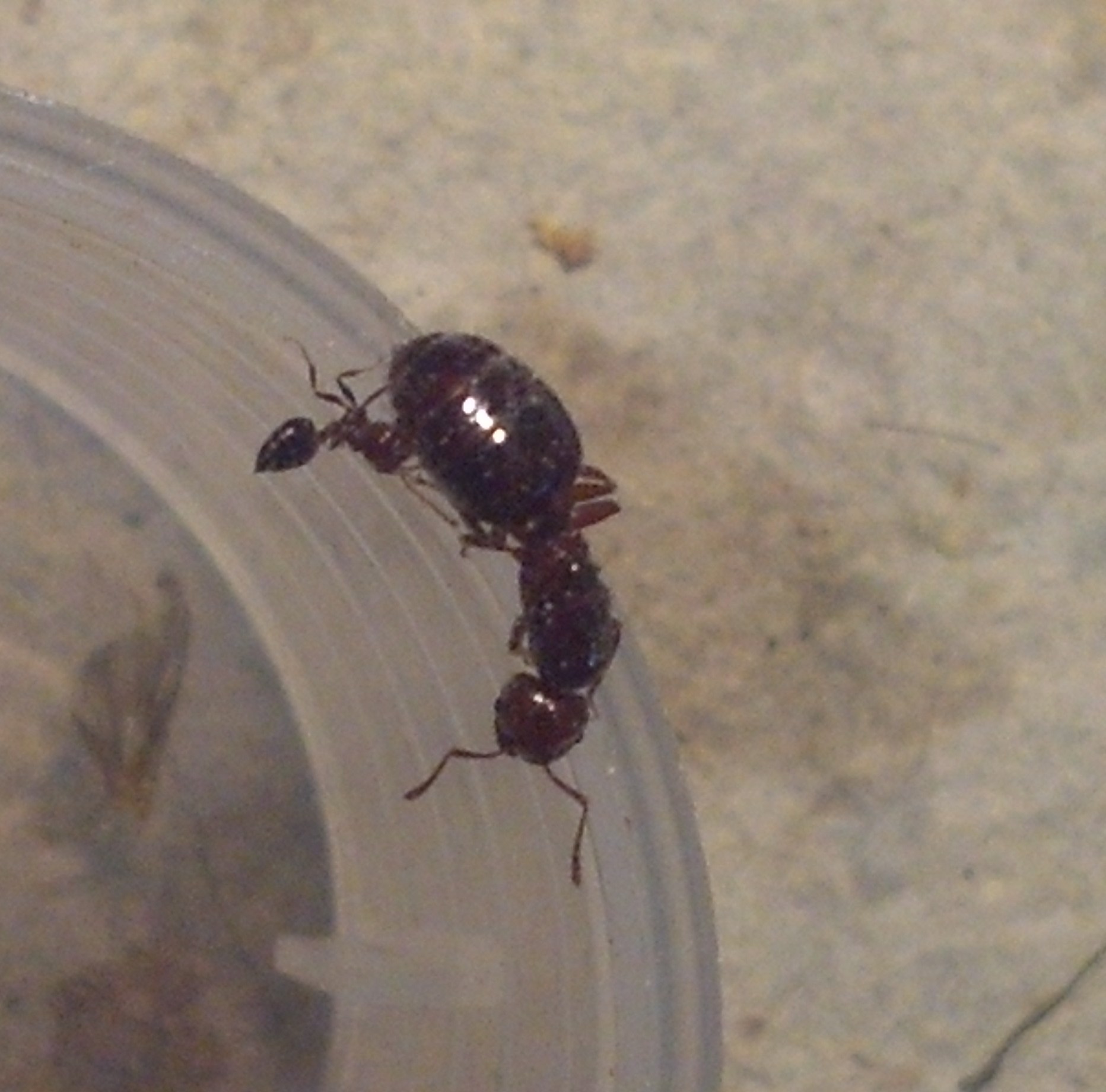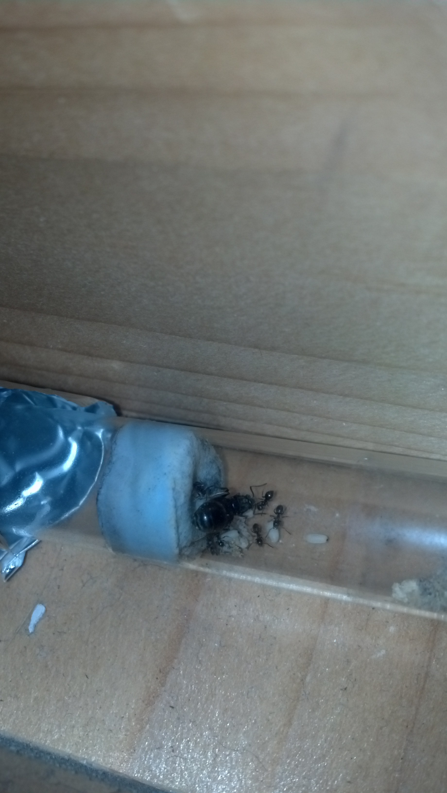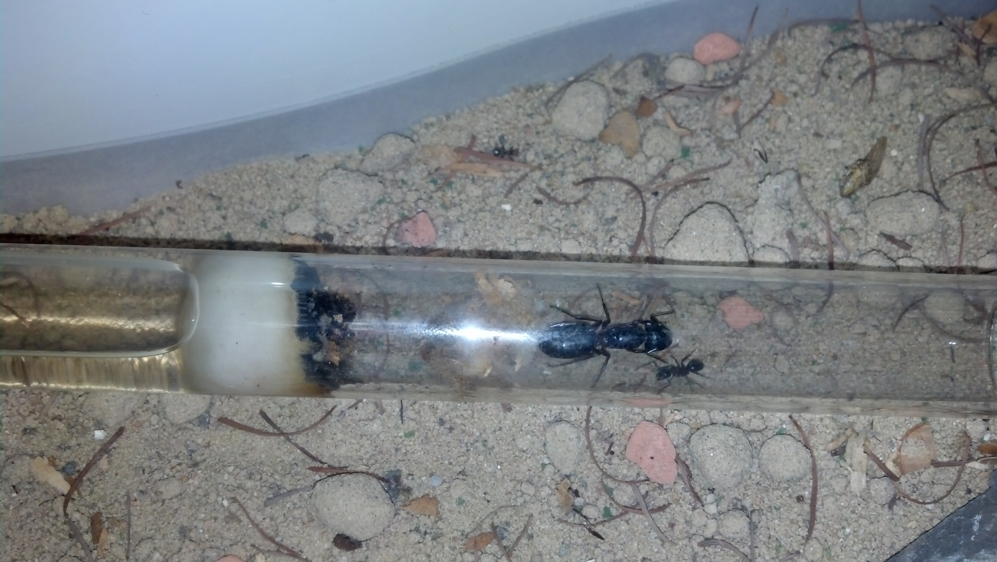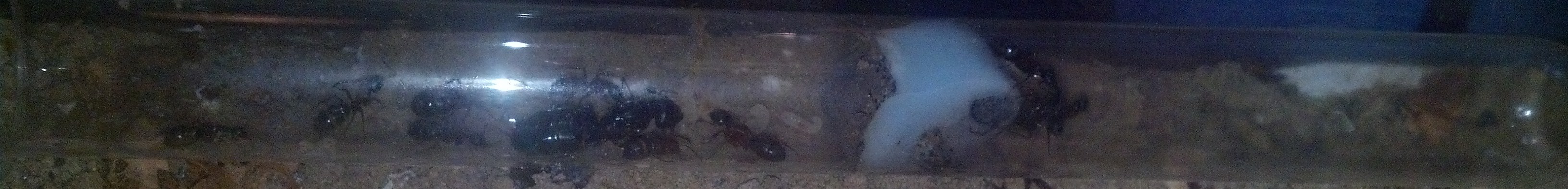 Die Camponotus lateralis sehen den Schlauch, der Arena und Nest verbindet, offenbar auch als Nest an, sie lagern gerne ihreBrut drin und haben den Schlaucheingang in der Arena verengt. Bilder habe ich keine brauchbaren, sorry!