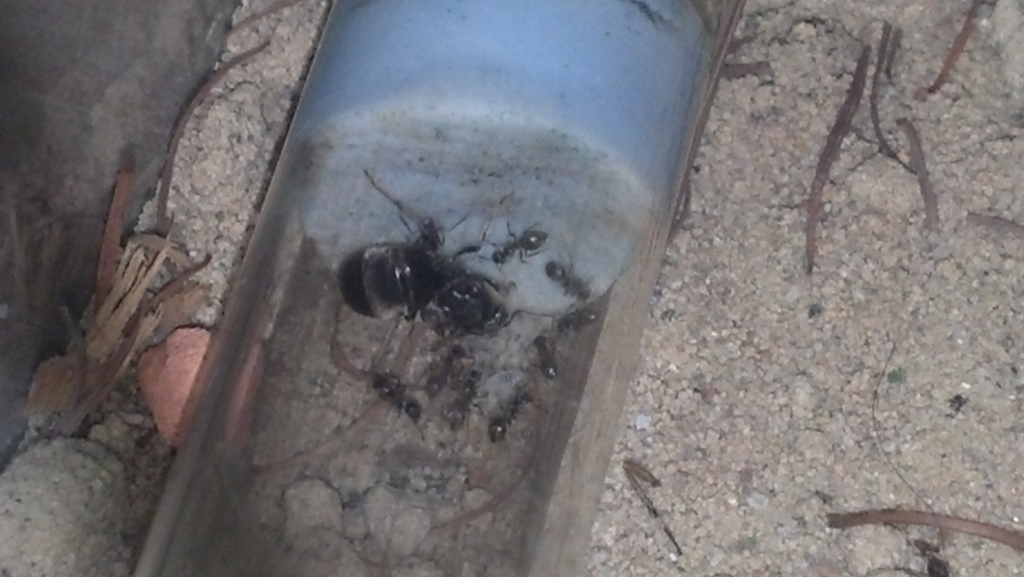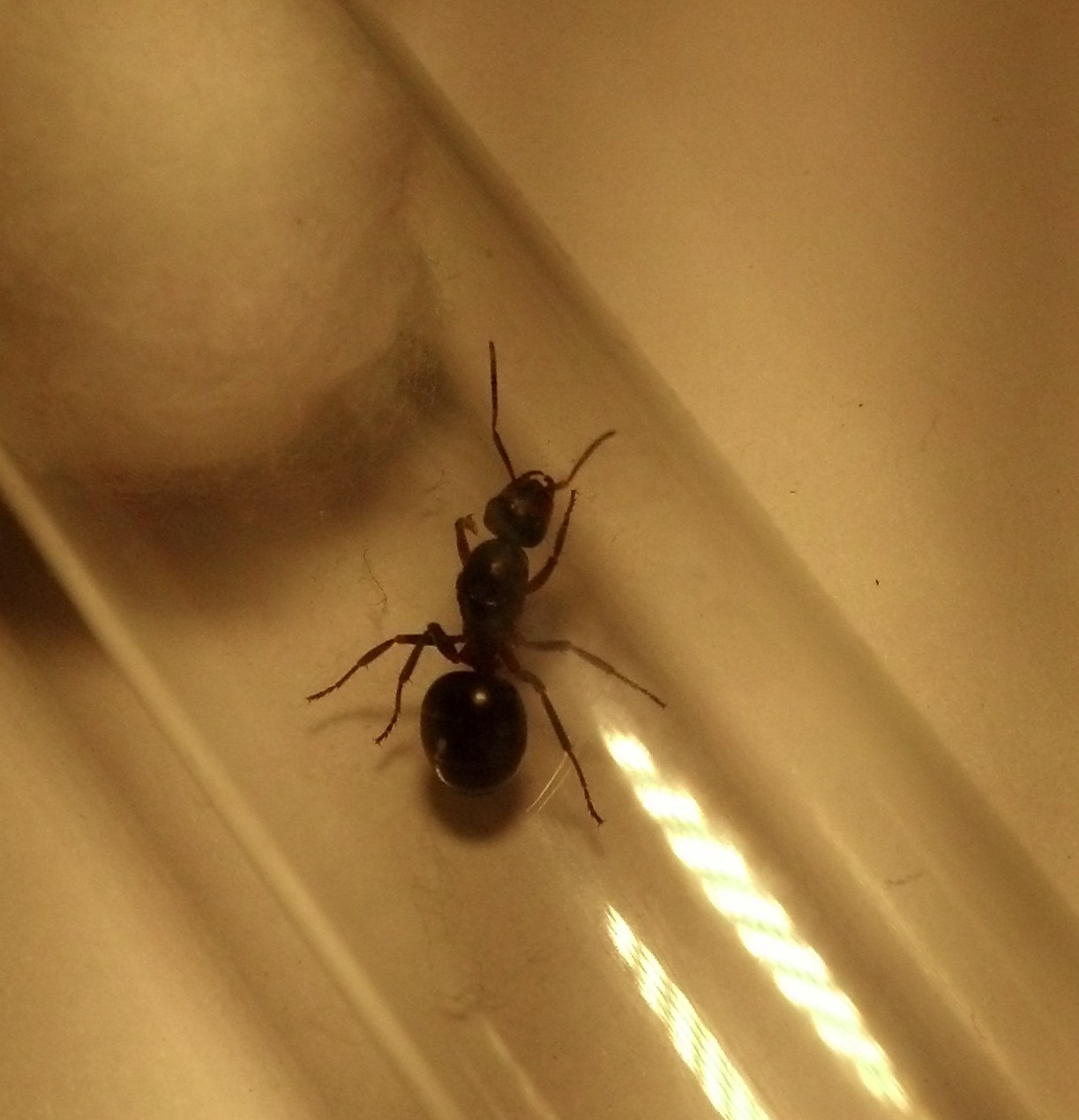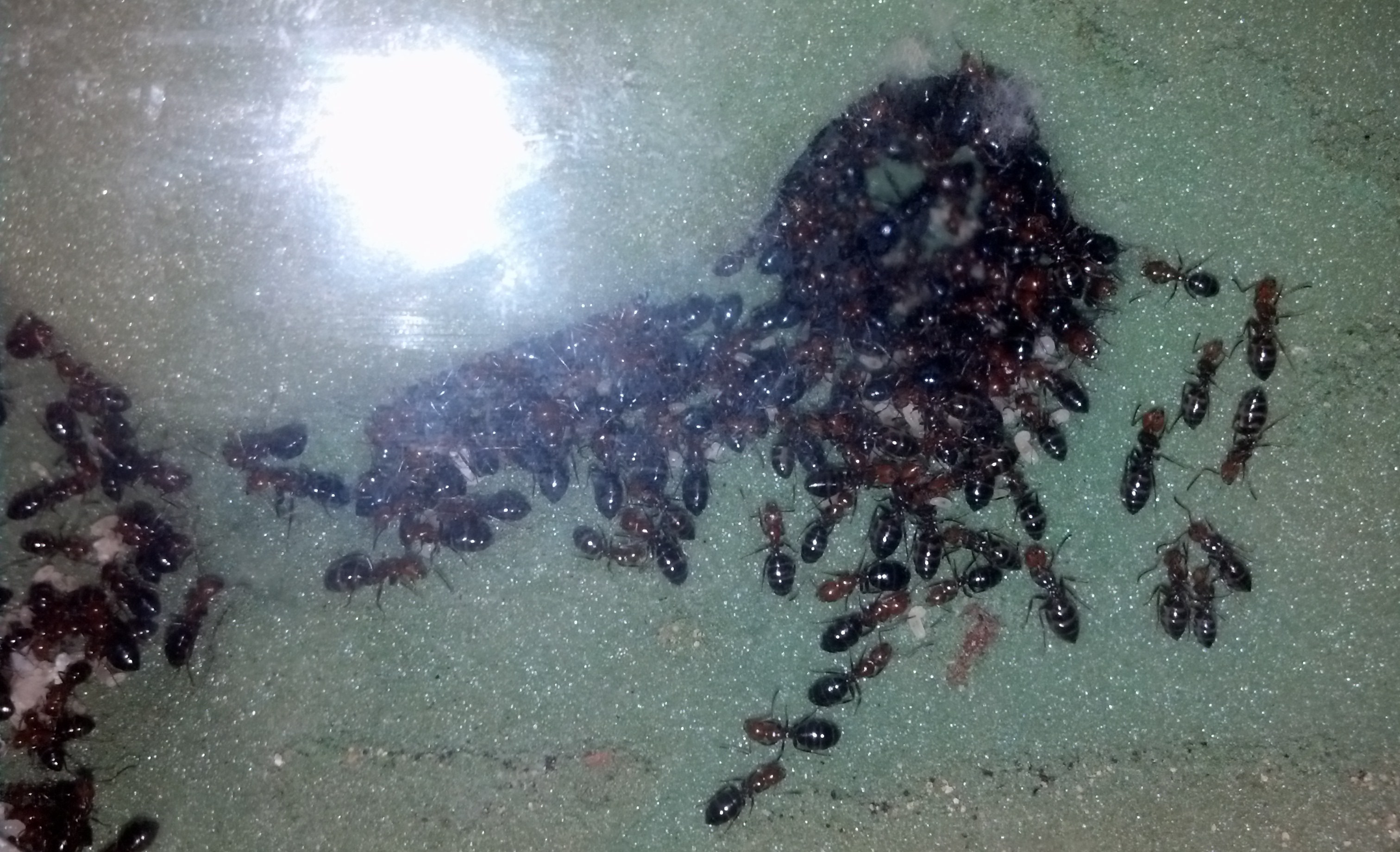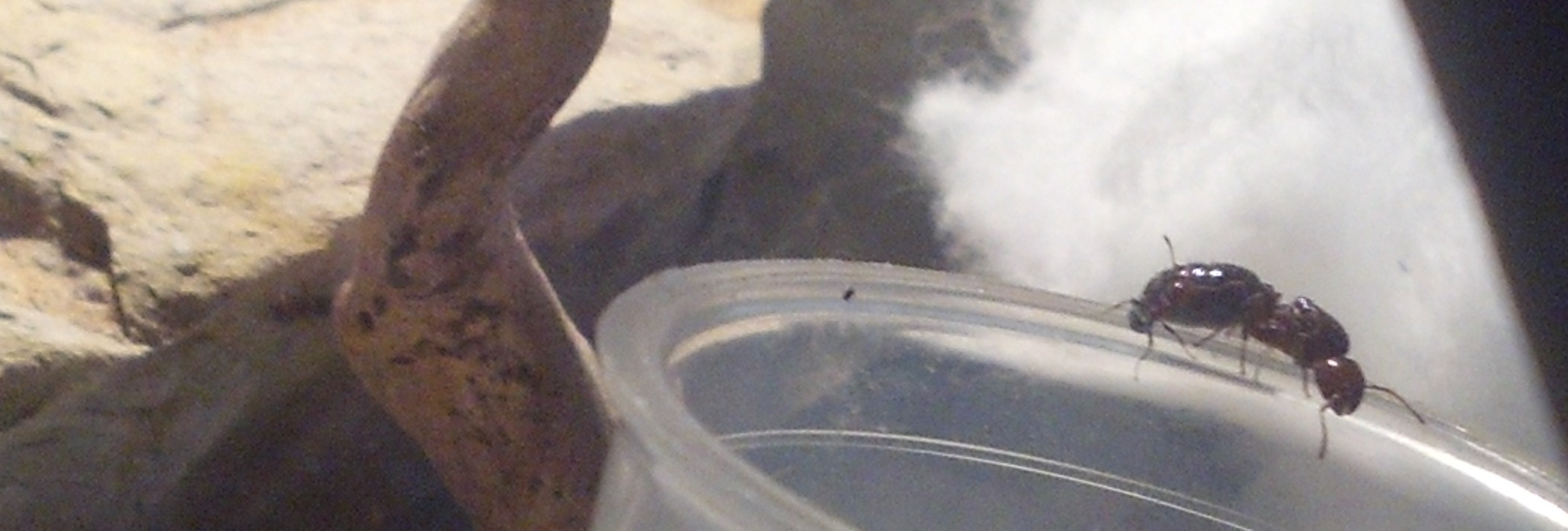 Die Camponotus lateralis sind wirklich aktiv und es lĂ€uft alles sehr gut, aber es kommt mir so vor, als wĂŒrden sie nicht zu viele werden wollen, denn sie versuchen mit allen Mitteln, sich irgendwie zu ertrĂ€nken. Egal, ob ich Kiesel, Watte oder SchwĂ€mme vor die TrĂ€nke tu, sie finden einen Weg durch und in den Freitod. Selbst ein Tropfen Zuckerwasser an der Scheibe wird um eine Tote erweitert.