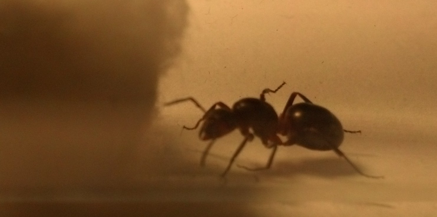 Umso mehr ist dafĂŒr bei den Crematogaster schmidtis passiert. Ich hatte ja zuvor schon immer wieder mal kleine AusbrĂŒche, bei denen ein paar Arbeiterinnen auf mir unbegreifliche Art aus dem Formi kamen. Doch als ich nach vier Tagen Urlaub nach meinen Ameisen sehen wollte, war das Formi leer. Keine einzige Ameise lieĂ sich finden, bis ich neben das Formi sah. Eine muntere AmeisenstraĂe zog sich ĂŒber die SchrĂ€nke, auf denen meine Formis stehen, vom Boden irgendwo hinter einem Regal zur untersten Schublade eines der SchrĂ€nke.