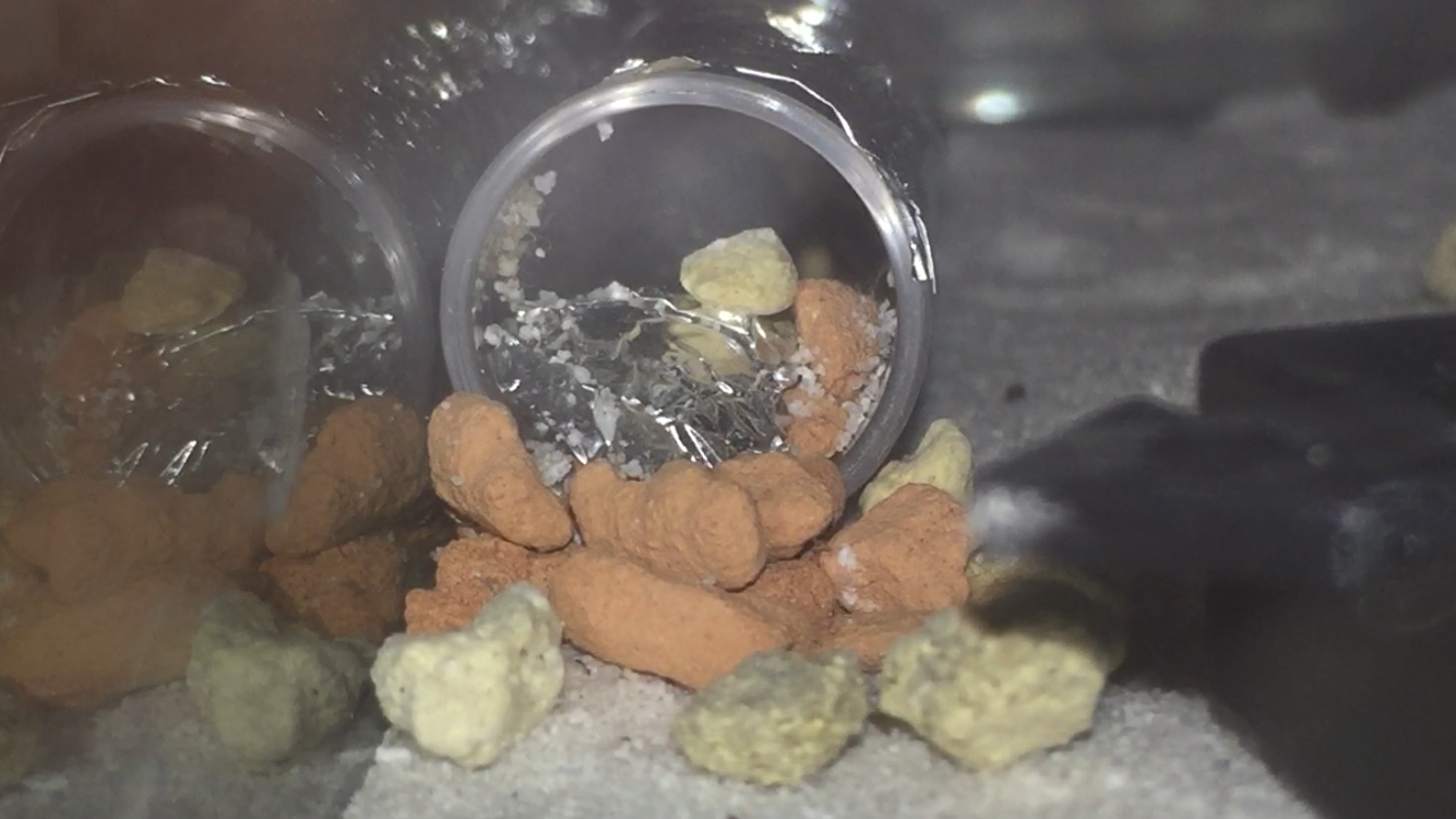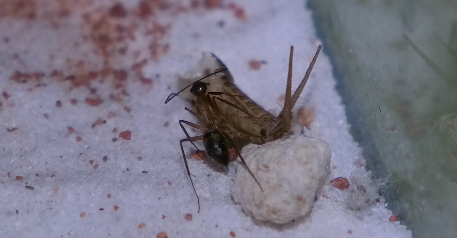 Sie sind etwa 7 bis 8 mm lang. Es waren 3 mittelgroße bis große Als Arena dient vorerst ein kleines Glasbecken, dass erstmal nur recht simpel mit weißer Sand-Lehm Mischung als Bodengrund, und einigen kleinen Steinchen eingerichtet ist. Außerdem ist es natürlich noch mit einem Thermometer und einem Hygrometer ausgestattet. Unter einem Teil des Beckens befindet sich eine Heizmatte. Somit herrschen am kühlen Ende des Beckens etwa 24°C und in der wärmste Ecke an die 30°C. Nachts ist die Heizung ausgeschaltet, wodurch die Temperatur etwa bei 22-23°C liegt. Die Luftfeuchtigkeit liegt meist bei etwa 45 bis 60%.