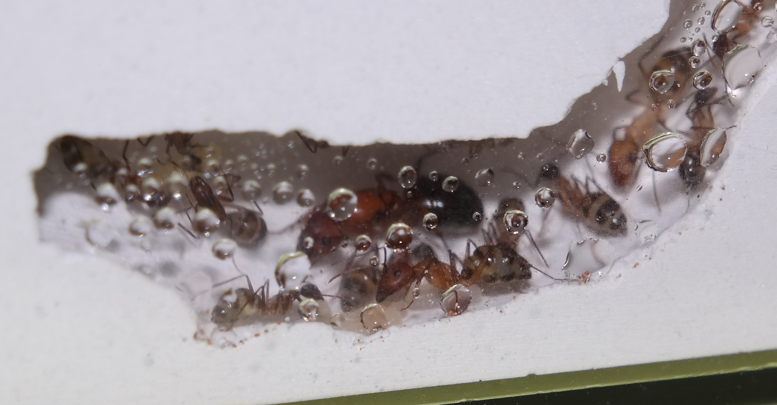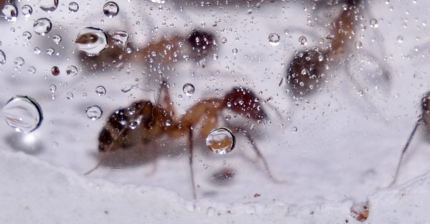 Nachdem ich das geöffnete Reagenzglas in die Arena gelegt habe, sind sofort vier Arbeiterinnen auf Erkundungstour gegangen, und haben sich mit Honigwasser vollgepumpt. Einige frisch tote Fruchtfliegen, die ich angeboten habe, wurden ignoriert.