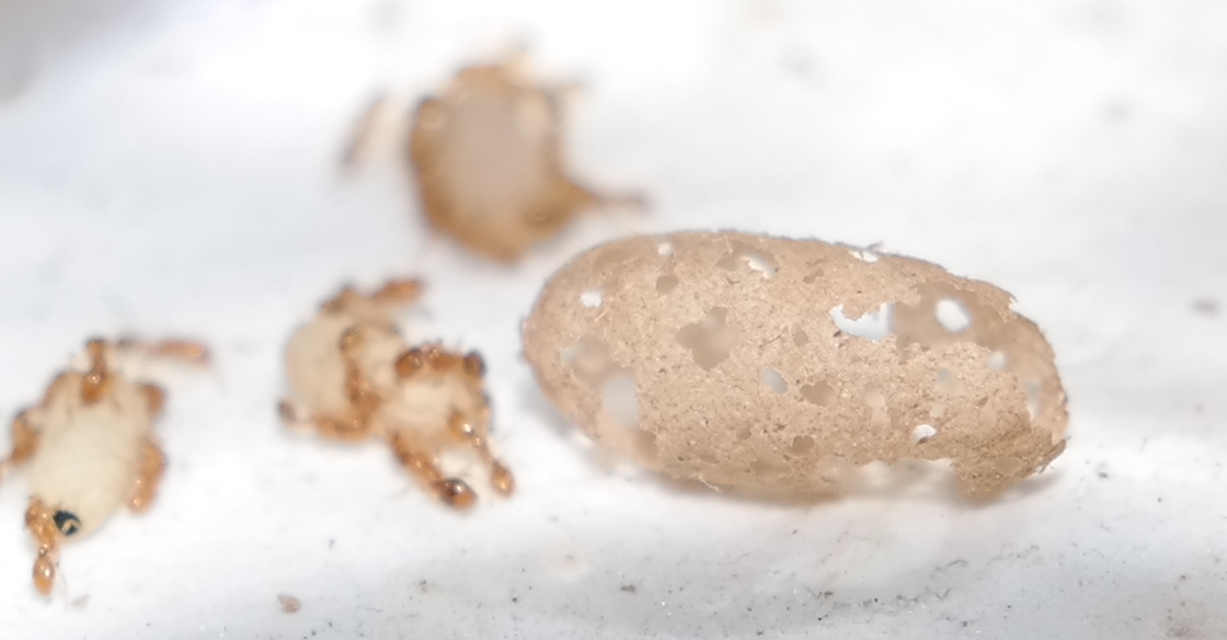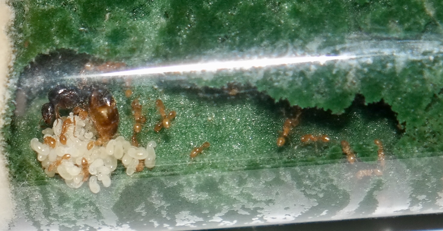 Die beiden gemeinsam grĂŒndenden Gynen vertagen sich nach wie vor super, und ihr Larvenberg ist, verglichen mit dem der Anderen, deutlich gröĂer.