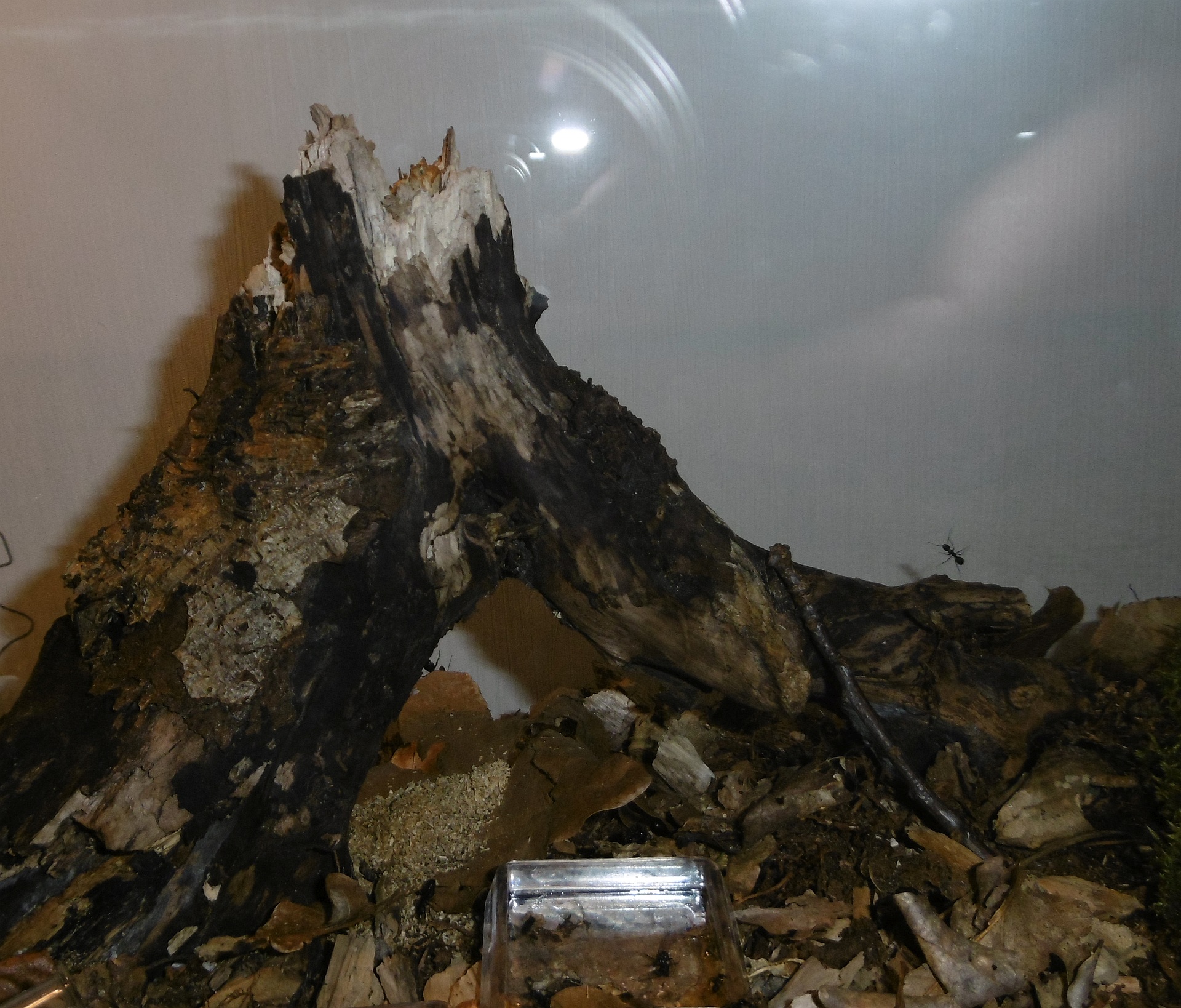 Eine große Schwierigkeit bei Waldbecken i.A. ist der Umstand, das die meisten Ameisen sich dann gerne in der Arena eingraben und fortan nichtmehr zu sehen sind. Das habe ich natürlich bedacht, und ich bin der Meinung das die Kolonie inzwischen eine Größe erreicht hat, wo es kein Problem ist für mich als Halter, wenn sie den ein oder anderen Stützpunkt in der Arena errichten. Z.B. das Stück Korkrinde ist prädestiniert dafür, und sie sammeln sich bereits jetzt auf diesem Geländestück im warmen Schein der Lampe. Dadurch das die Farmen beheizt werden und die C. vagus es gerne trocken haben, gehe ich davon aus das der Großteil der Kolonie in den Farmen bleiben wird und damit weiter gut beobachtet werden kann. Mit anderen Arten, besonders feuchtigkeit liebenden Arten, dürfte sich das alles etwas schwieriger gestalten.