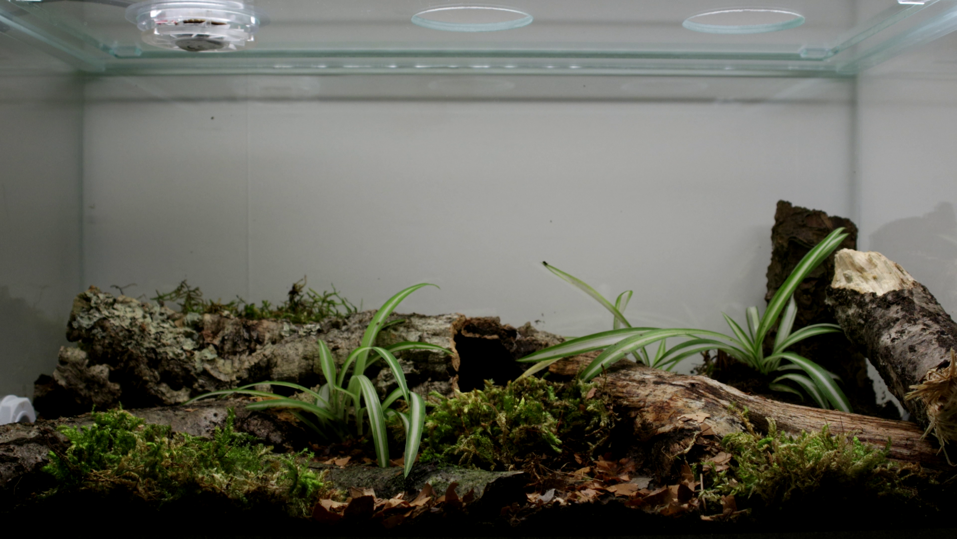 Die Arena wurde mit Moos, Wurzeln, Kork, und drei kleinen Grünlilien eingerichtet. Der Regalboden wird tagsüber mit einer LED Leiste beleuchtet. Für das Moos konnte ich die Luftfeuchtigkeit nicht gut genug halten, aber den Grünlilien ginge es gut - wenn nicht die Ameisen wären, aber dazu gleich mehr.