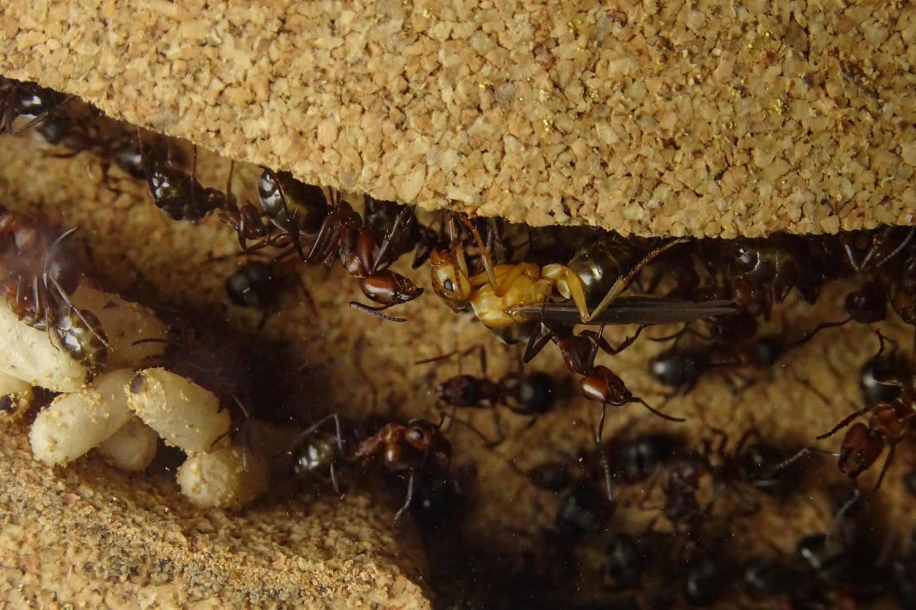 Der Kolonie geht es großartig! Nach 3 Jahren wurde das erste Männchen aufgezogen, und nun, nach knapp 4 Jahren seit der Gründung, schlüpfen die ersten Jungköniginnen aus ihren Kokons.