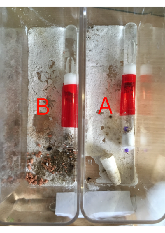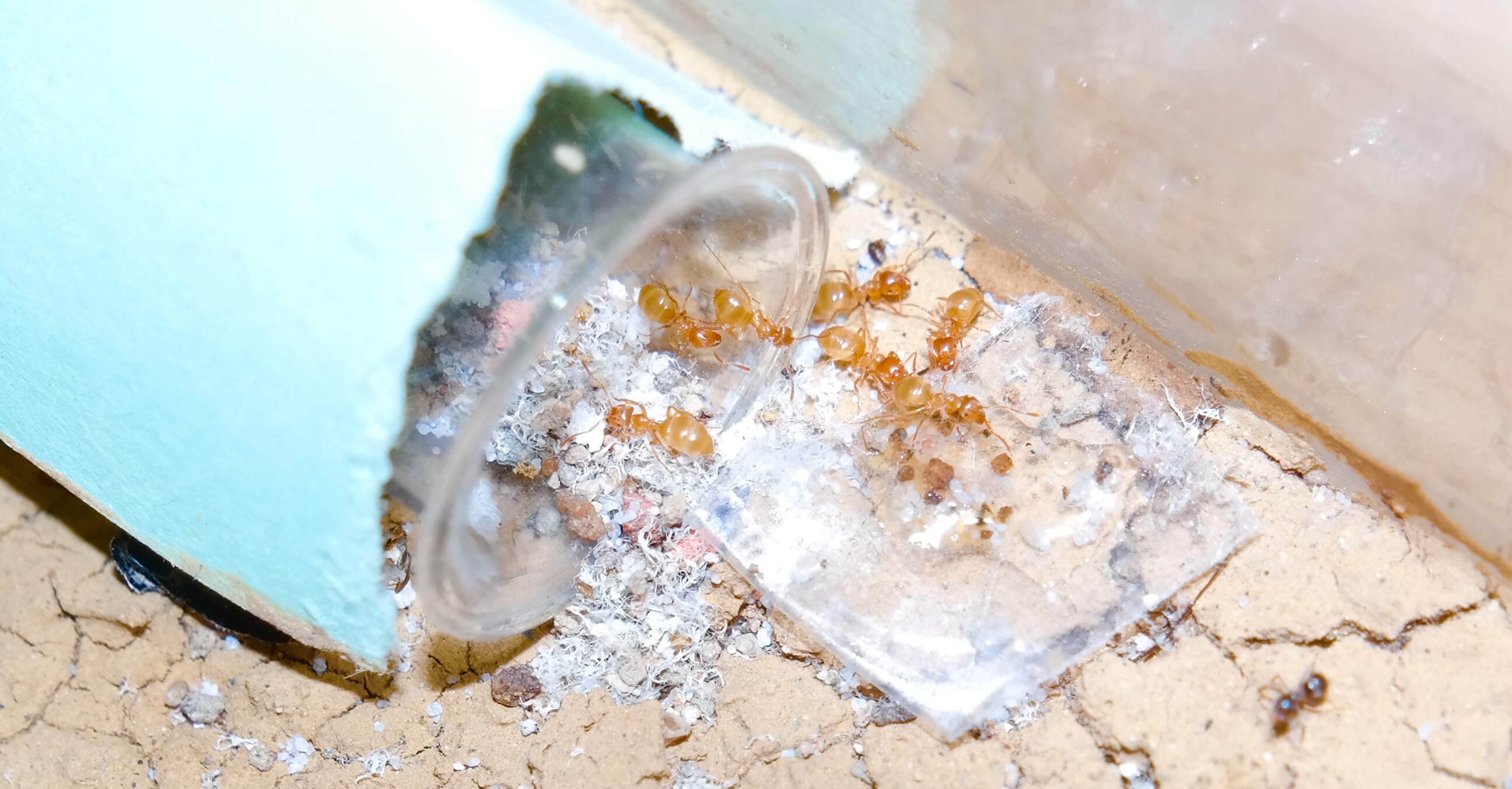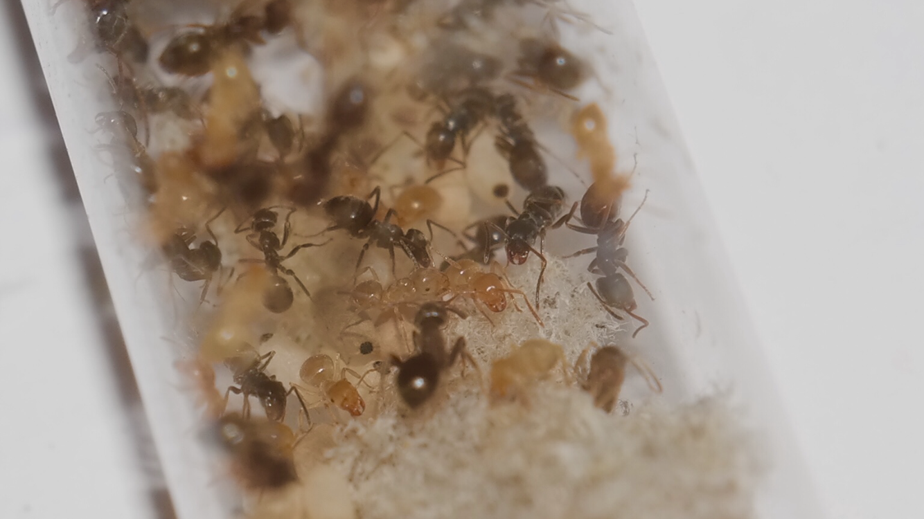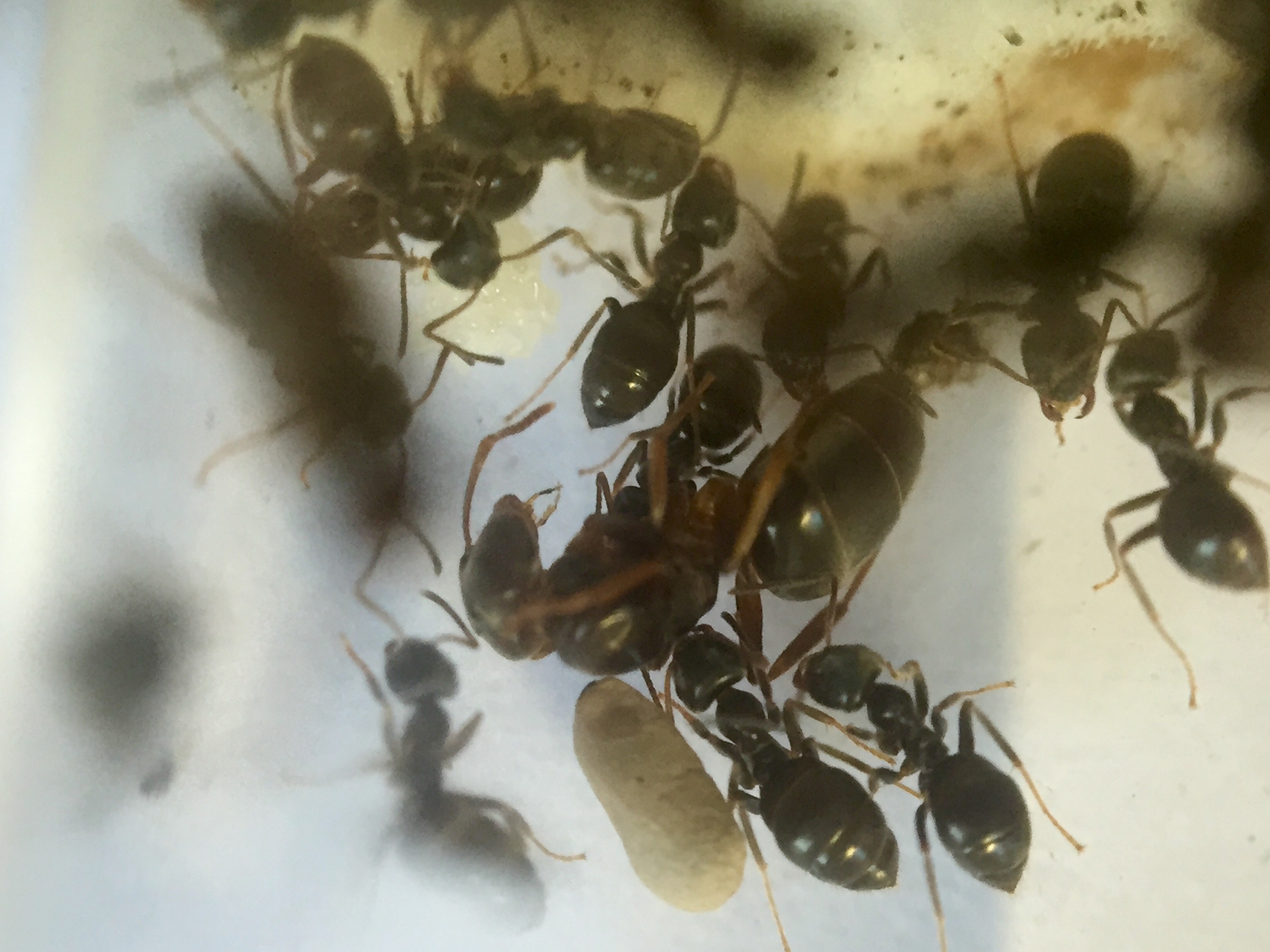 Sie lief direkt in das Nest der Wirtsarbeiterin, und diese verhielten sich erstaunlich friedlich. Eine der Arbeiterinnen verbiss sich zwar in ihrem Bein, doch der Rest zeigte keinerlei Aggression.