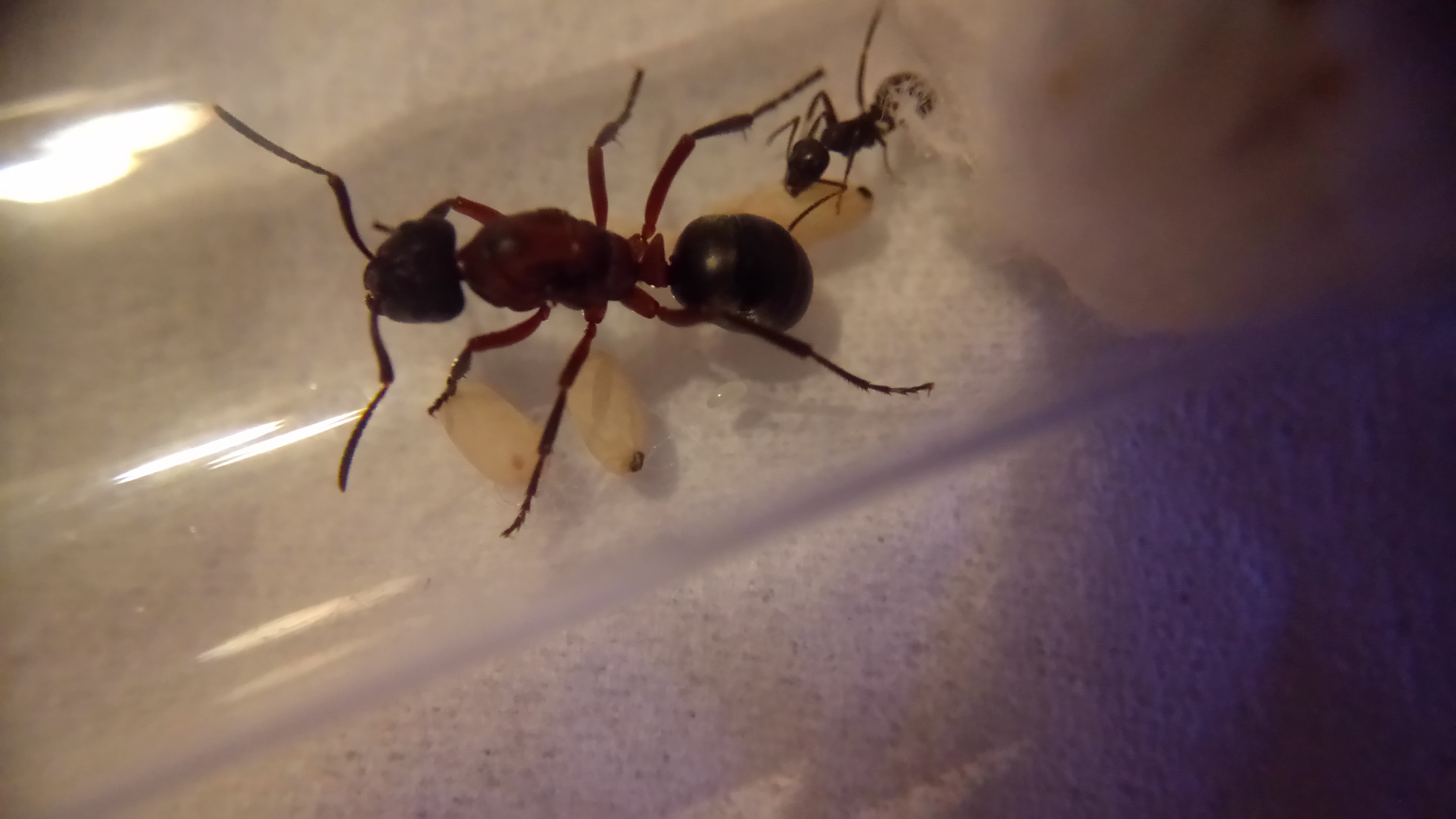 Es gibt weiterhin eine Arbeiterin. Die scheinbar ziemlich schnell mit Versorgung der Gyne begonnen hat! Die Arbeiterin selbst hat ein gut gefülltes Gaster, die Gyne weist eine Physogastrie auf. Kann man auf Eier hoffen?