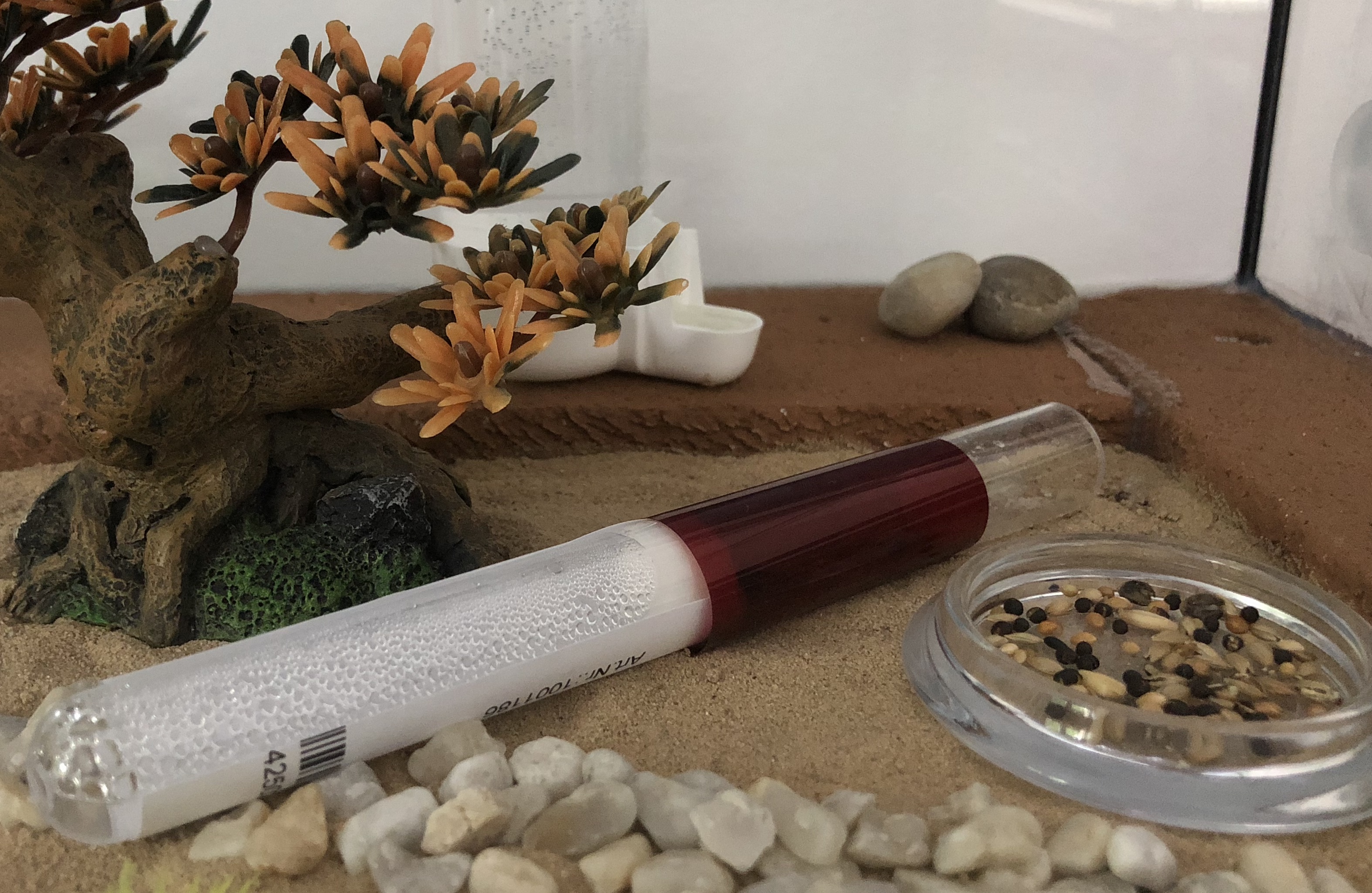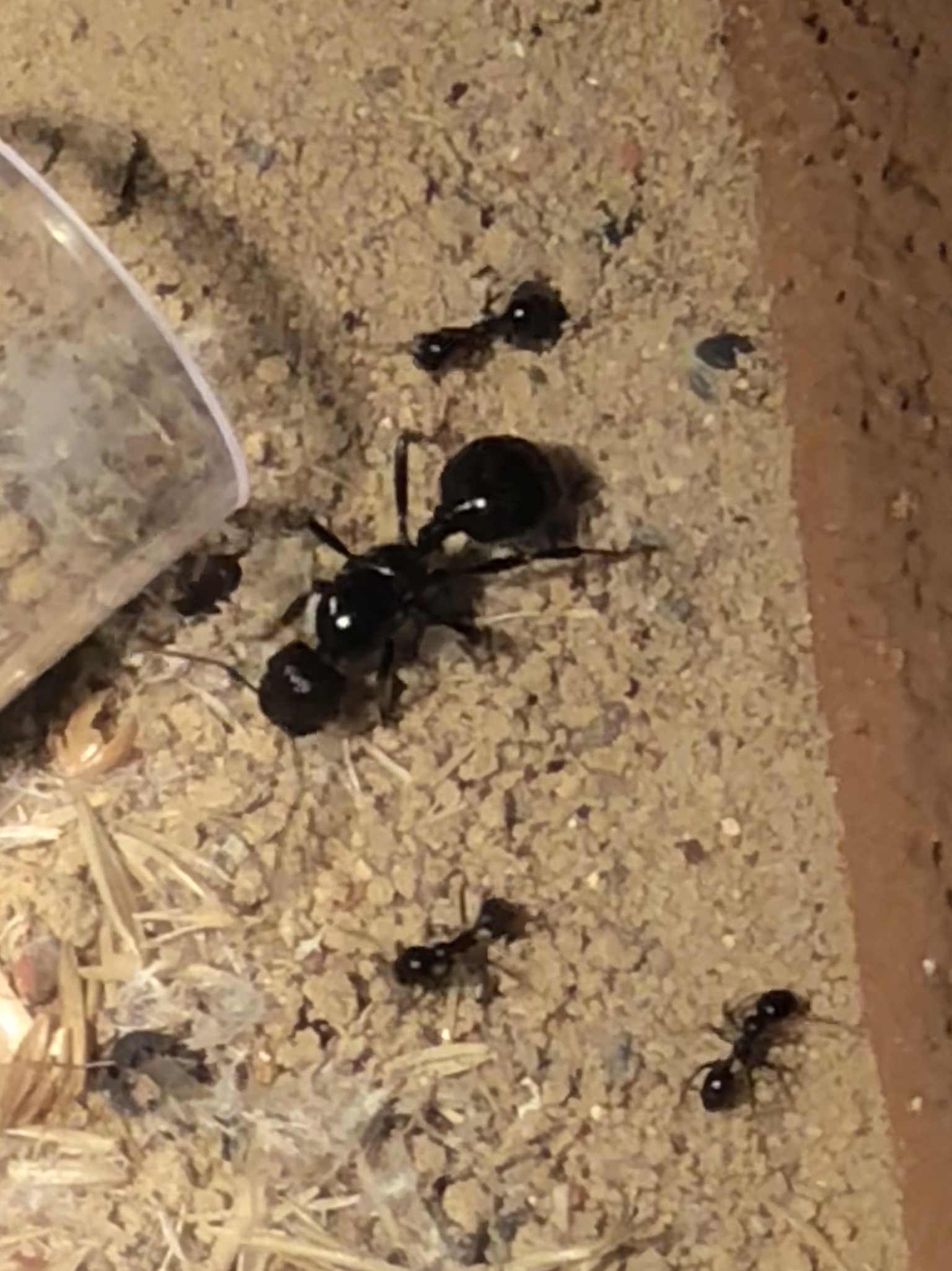Jetzt aber zu meinen Problemen, die Kolonie schätze ich auf nur noch ca 10 Arbeiterinnen mit Brut, es sterben immer wieder zahlreiche Arbeiterinnen und ich kann mir nicht erklären warum. Ich habe alles mögliche versucht. Becken noch besser belüftet durch abnehmen des Deckels. Alle 2 Tage zusätzlich Obstfliegen angeboten (werden auch sofort genommen). Seit einiger Zeit biete ich jetzt für die Arena für einige Zeit am Tag zusätzlich ein Wärmespot an. Noch vielfältigere Körner die ich hilfsweise schon zerdrücke.