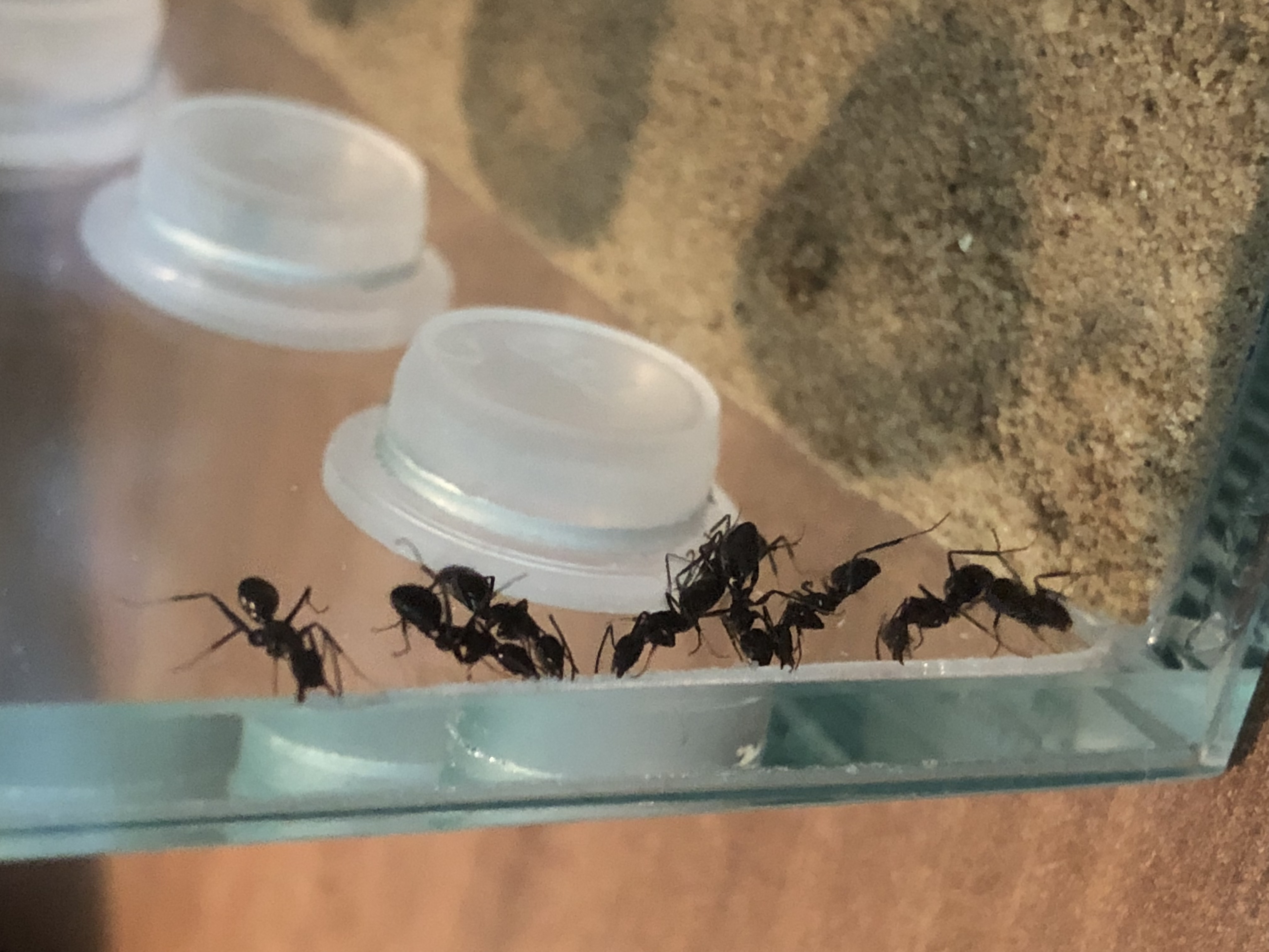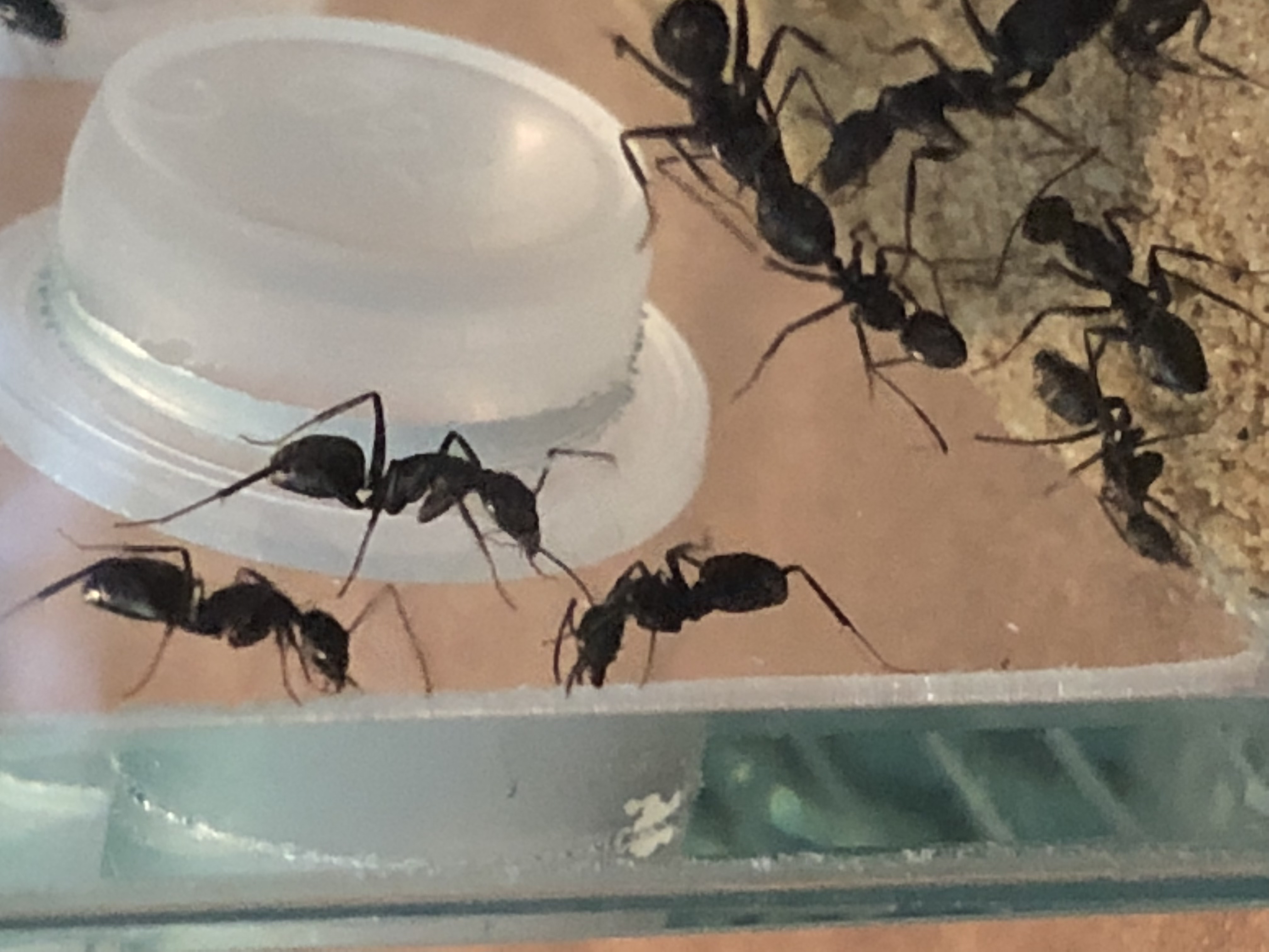 Meine Camponotus rufoglaucus feae versuchen sich durchzubeißen, es fing an das in der Arena vom antstore ein ganz Mini Zipfel Silikon an dieser Stelle hing. Den fanden sie total interessant, aber jetzt sitzen sie teilweise zu 10 da und bearbeiten die Seite.