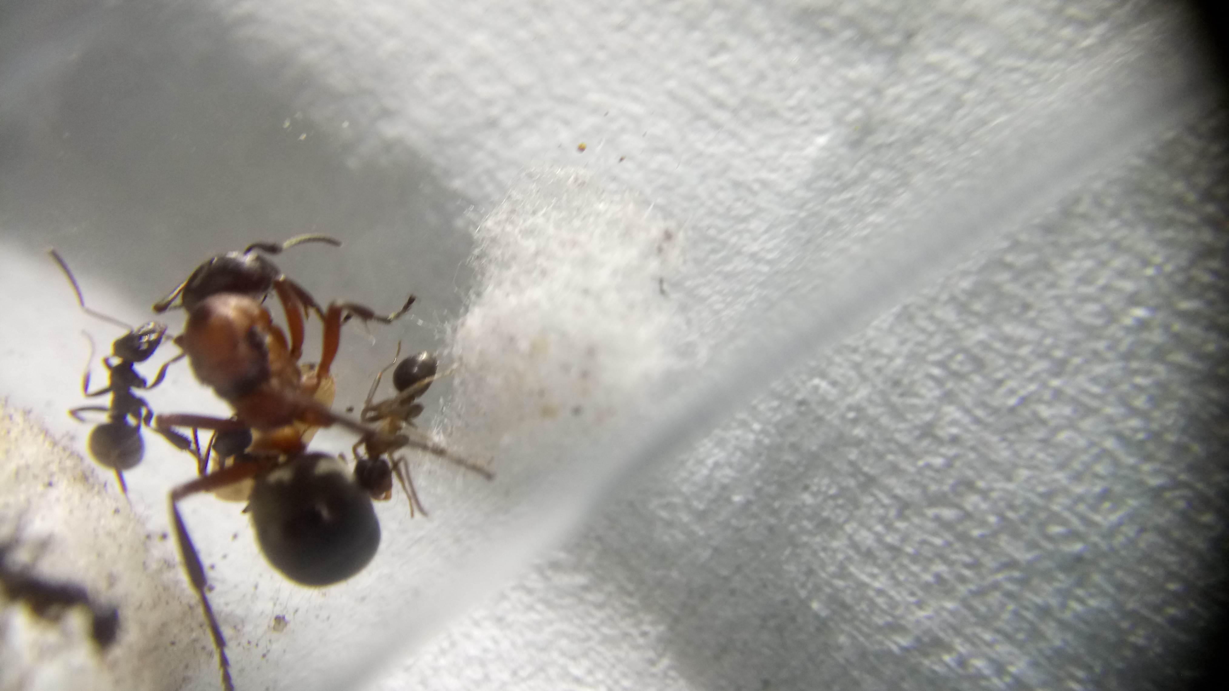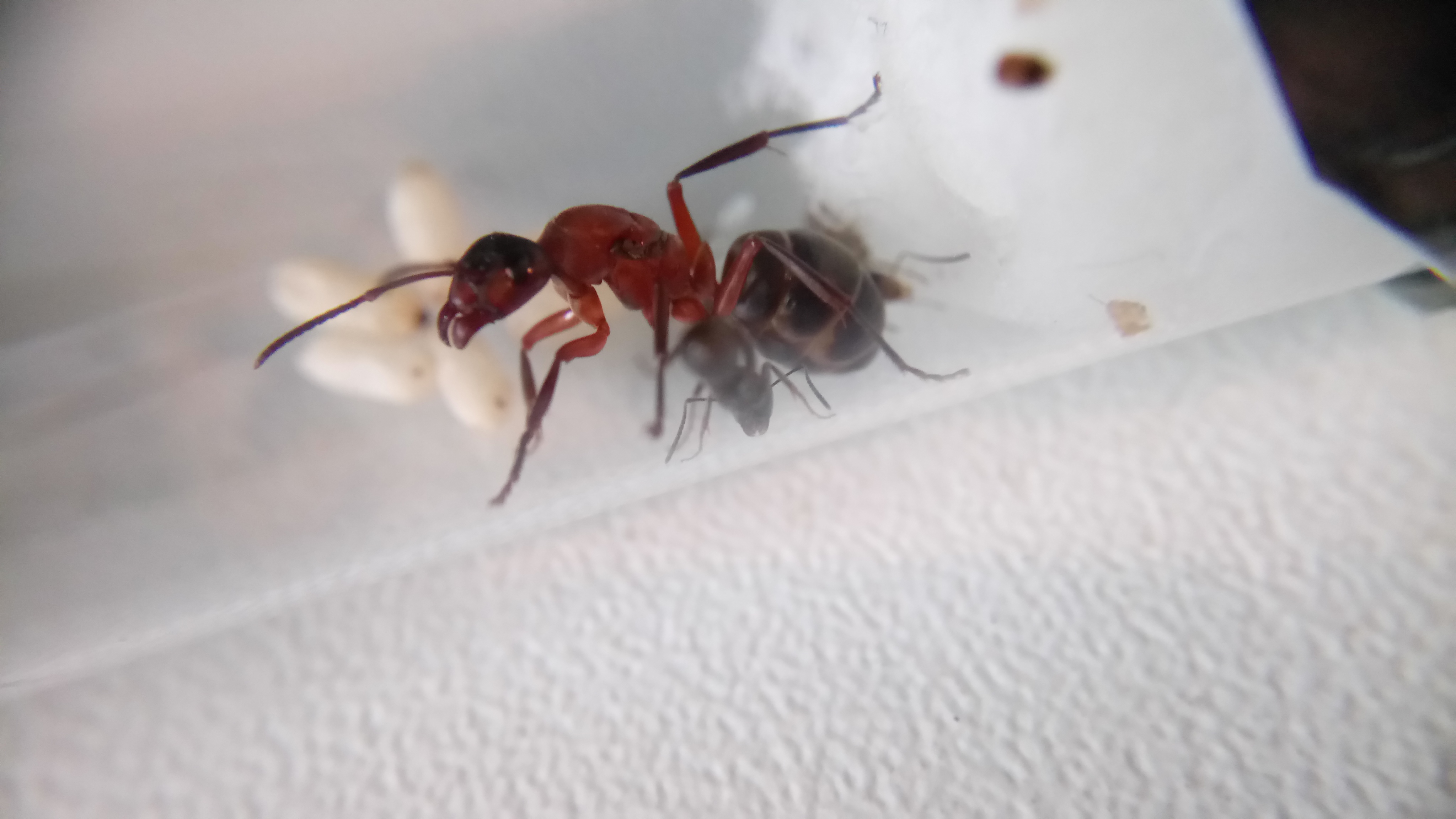 20.06.2018Es ist eine zweite Serviformica Arbeiterin geschlüpft! Gegen 6 Uhr morgens habe ich nochmal nach ihr gesehen und tatsächlich, eine zweite Arbeiterin. Das Bild stammt von Nachmittag, wo die Arbeiterin bereits etwas gefärbt war. Man sieht, dass die