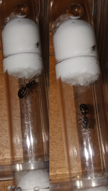 Ich habe heute meinen Kontrollbesuch bei zwei meiner Königinnen gemacht. Dabei öffne ich die Schublade immer kurz und fotografiere mit meinem Handy den aktuellen Stand. Nun ist mir aufgefallen wie auf dem ersten Bild noch Eier zu sehen sind auf dem zweiten (welches ca. 15 sek danach gemacht wurde) nicht mehr! Ich habe die Sorge, dass sie durch den Stress die Eier gefressen hat... oder hat sie die Eier nur in die Mitte in gebracht und sich darauf gelegt um sie zu schützen?