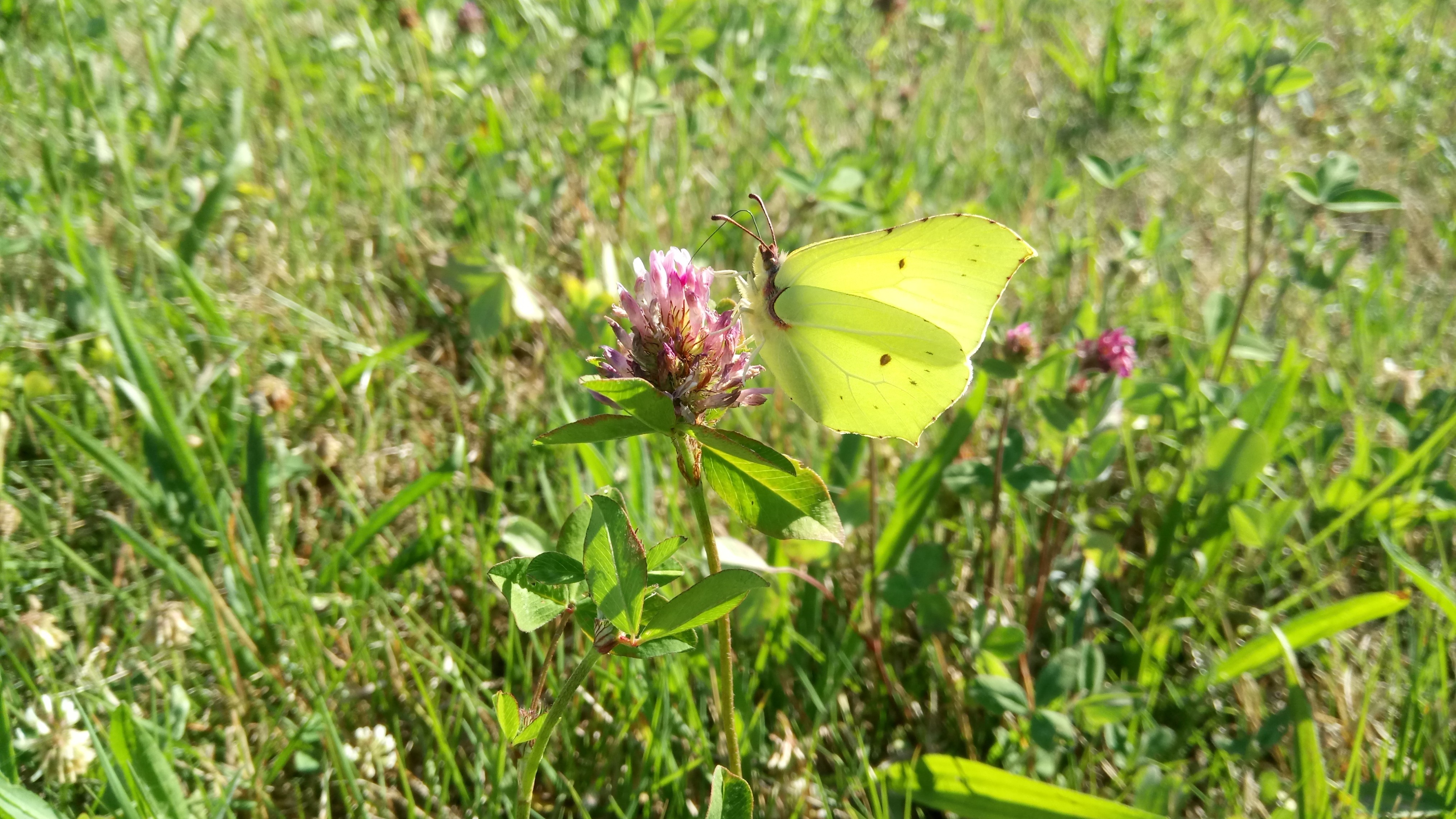 Der Zitronenfalter (Gonepteryx rhamni) ist mit seiner intensiv gelben bis grĂŒnen FĂ€rbung (bei MĂ€nnchen) und seiner GröĂe tatsĂ€chlich ziemlich auffĂ€llig.