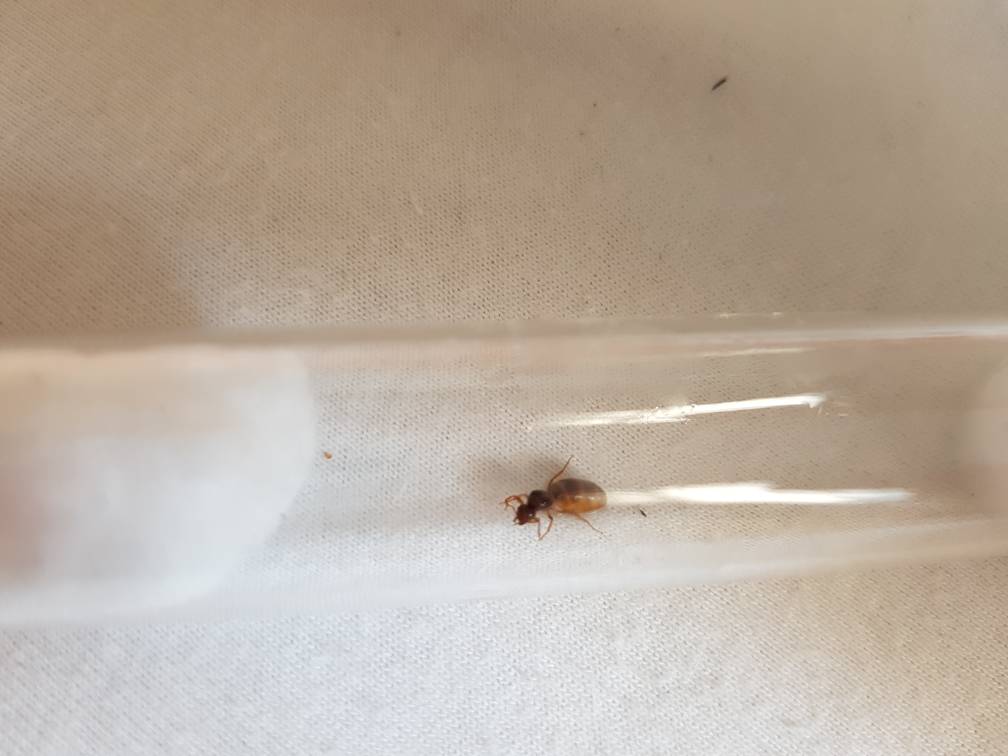 Königin gefunden. 16.07.2018, 17:30 - 18:30 auf einem Asphaltweg zwischen den Feldern. Sie hatte bereits keine Flügel und war schon auf der Suche. Sie ist ca. 9 mm lang und wirkt im richtigen Licht gelblich.