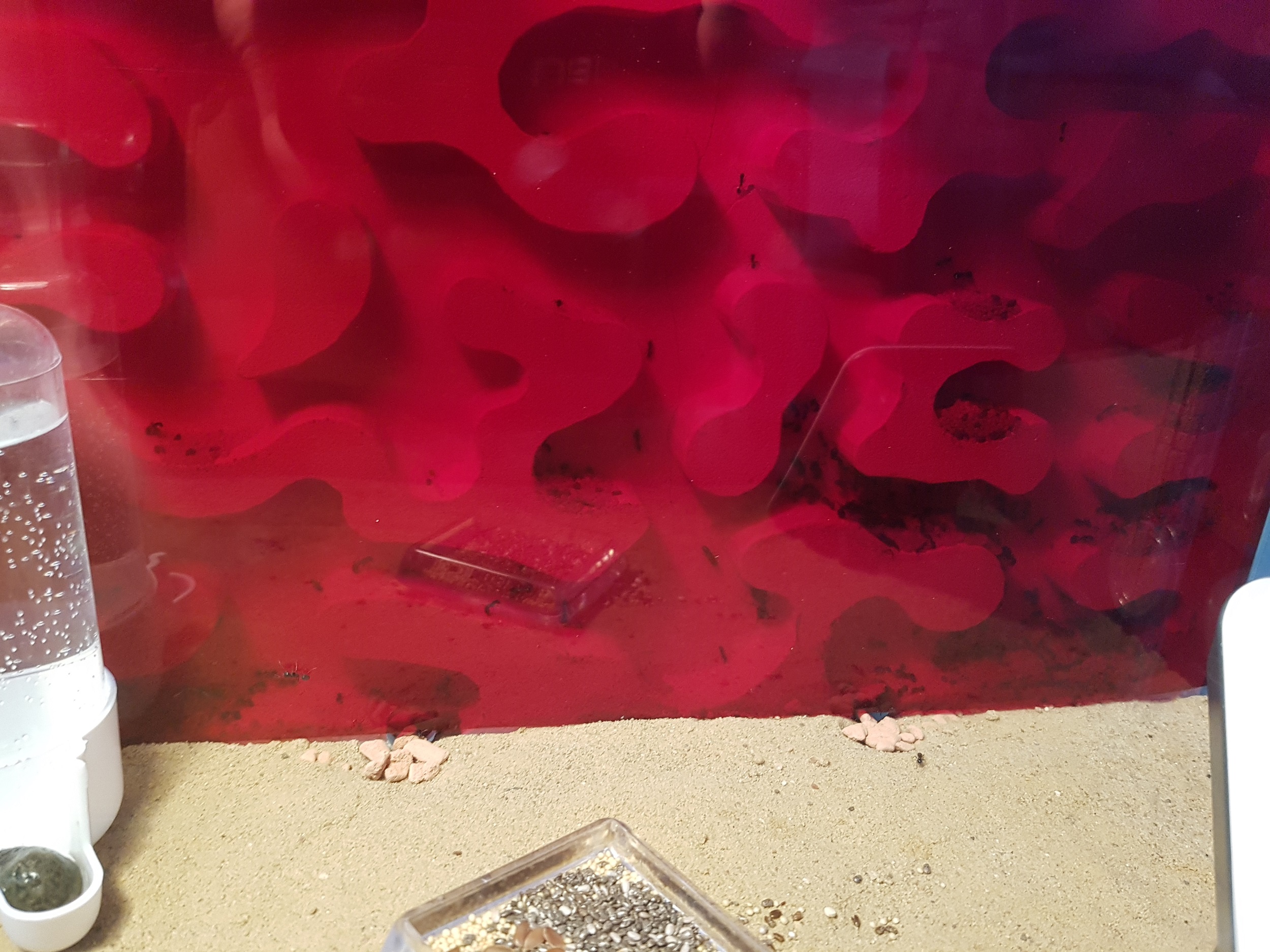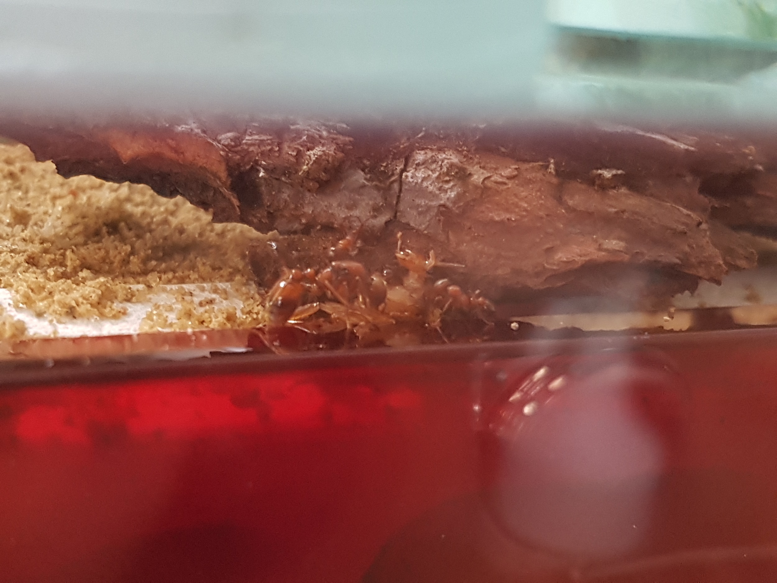 Myrmica rubra: Meine Myrmica rubra machen mir leider etwas Sorgen, da es nicht mehr so gut läuft, wie am Anfang. Zuerst ist die Kolonie aus dem Acrylnest ausgezogen und unter ein großes Holzstück in der Arena gezogen. Da ich den Ameisen jedoch die Wahl lasse, was sie lieber haben, störte mich dies nicht weiter. Nach einigen Tagen bemerkte ich sehr viele Geschlechtstiere in der Arena (so wie es für mich aussah nur Männchen), welche versuchten sich mit den Arbeiterinnen zu paaren, was die Arbeiterinnen natürlich nicht mochten und sich wehrten. Seitdem bemerke ich immer wieder, wie manche Arbeiterinnen nun andere Arbeiterinnen angreifen und diese töten und dann mit den toten Arbeiterinnen in der Arena herumlaufen. Ich habe natürlich gleich versucht, im Internet etwas über dieses Verhalten in Erfahrung zu bringen und bin auf ähnliche Beobachtungen bei dieser Art gestoßen. Jedoch konnte ich keine Erklärung finden, weshalb ich einfach abwarten werde, bis das Verhalten aufhört.