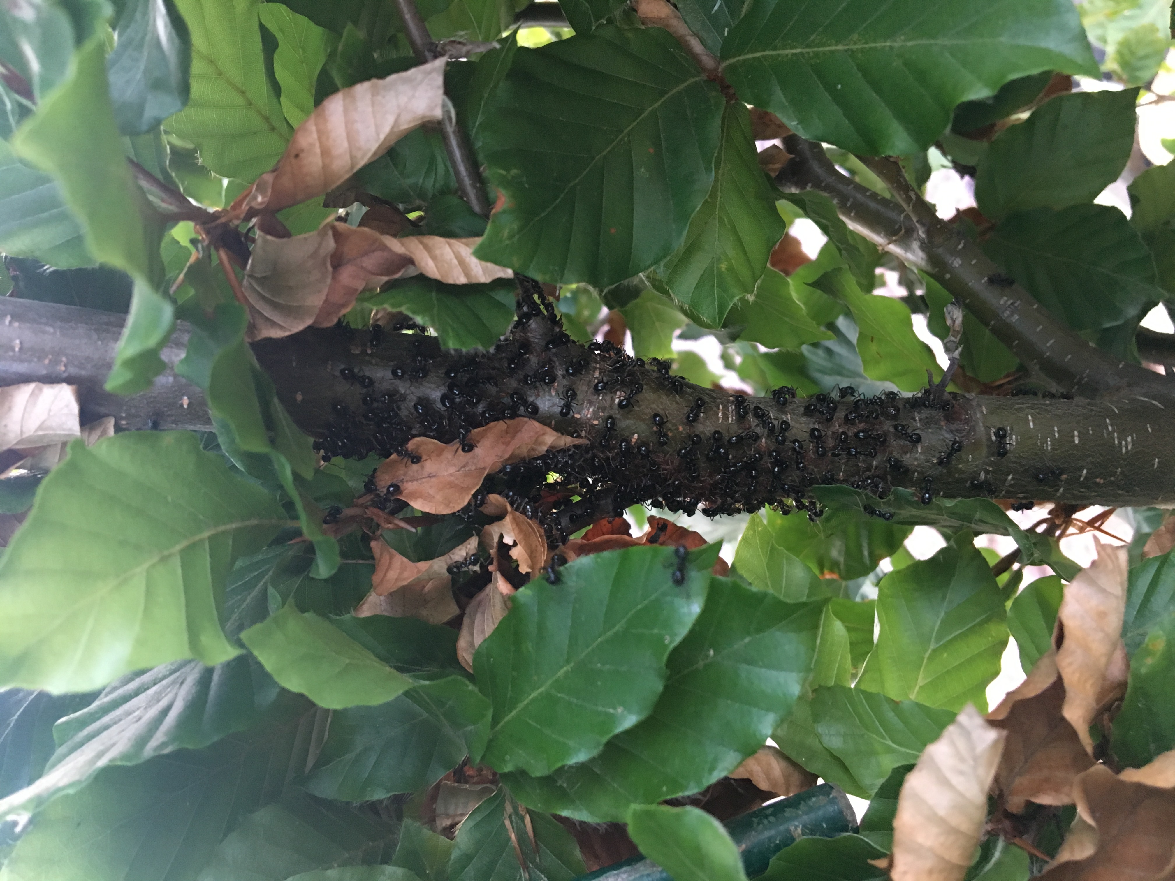 eine AnhÀufung von verweilenden Ameisen am Stamm meiner Rotbuchenhecke.