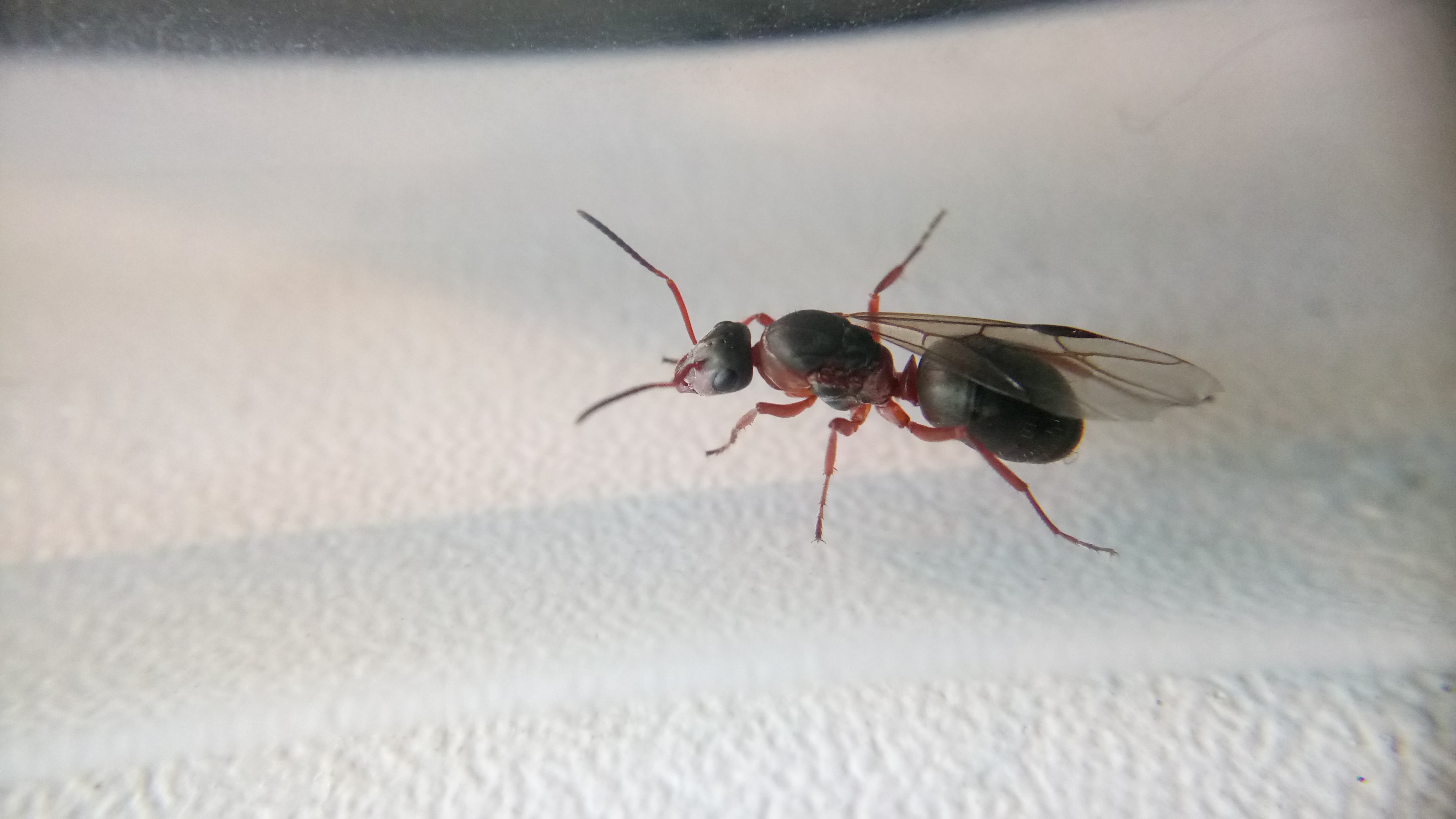 Gefunden habe ich sie in einer Stadt, als ich auf dem Weg zum Zug war. Provisorisch eingepackt habe ich sie, mit einem kleinen angefeuchtetem Stück Taschentuch, nach Hause transportiert. Dass es sich um Lasius emarginatus handelt und nicht um Lasius brunneus, konnte ich sofort feststellen. Im Gegensatz zu Lasius brunneus, die farblich teils an Lasius niger erinnern kann (markant ist hierbei dann das länglichere Gaster von Lasius brunneus), ist meine Gyne deutlich rötlich am Thorax gefärbt und weist ein schönes hellbraunes Gaster auf.