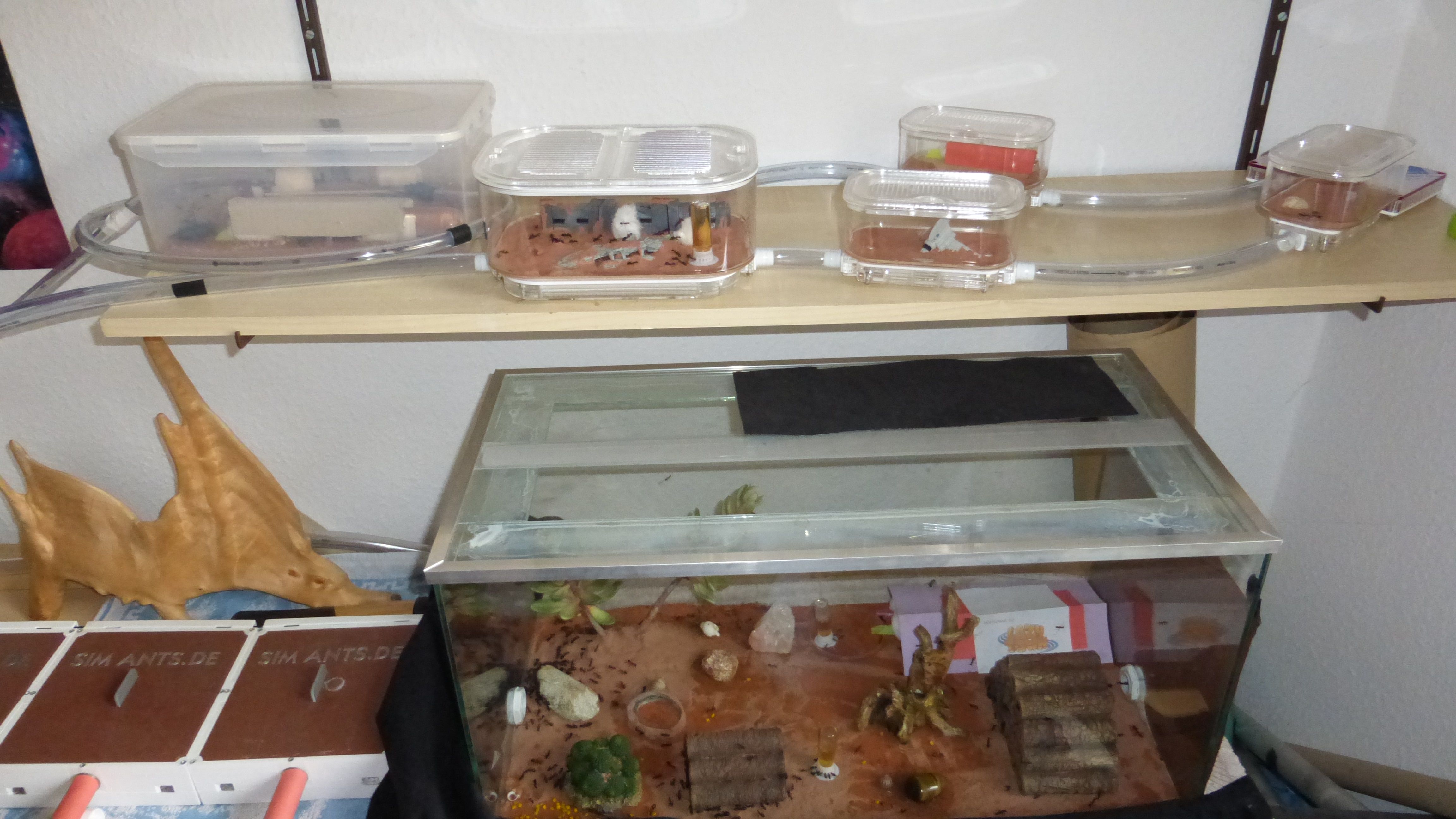 Das Antkit Size8 und seine vorgeschobene Arena am neuen Platz. Hinten kann man den mit Watte verstopften Port einer Miniarena sehen, die später mit der alten Arena 2 (der Plastikbox, die an der rechten Ecke der Kommode stand) verbunden werden sollte.