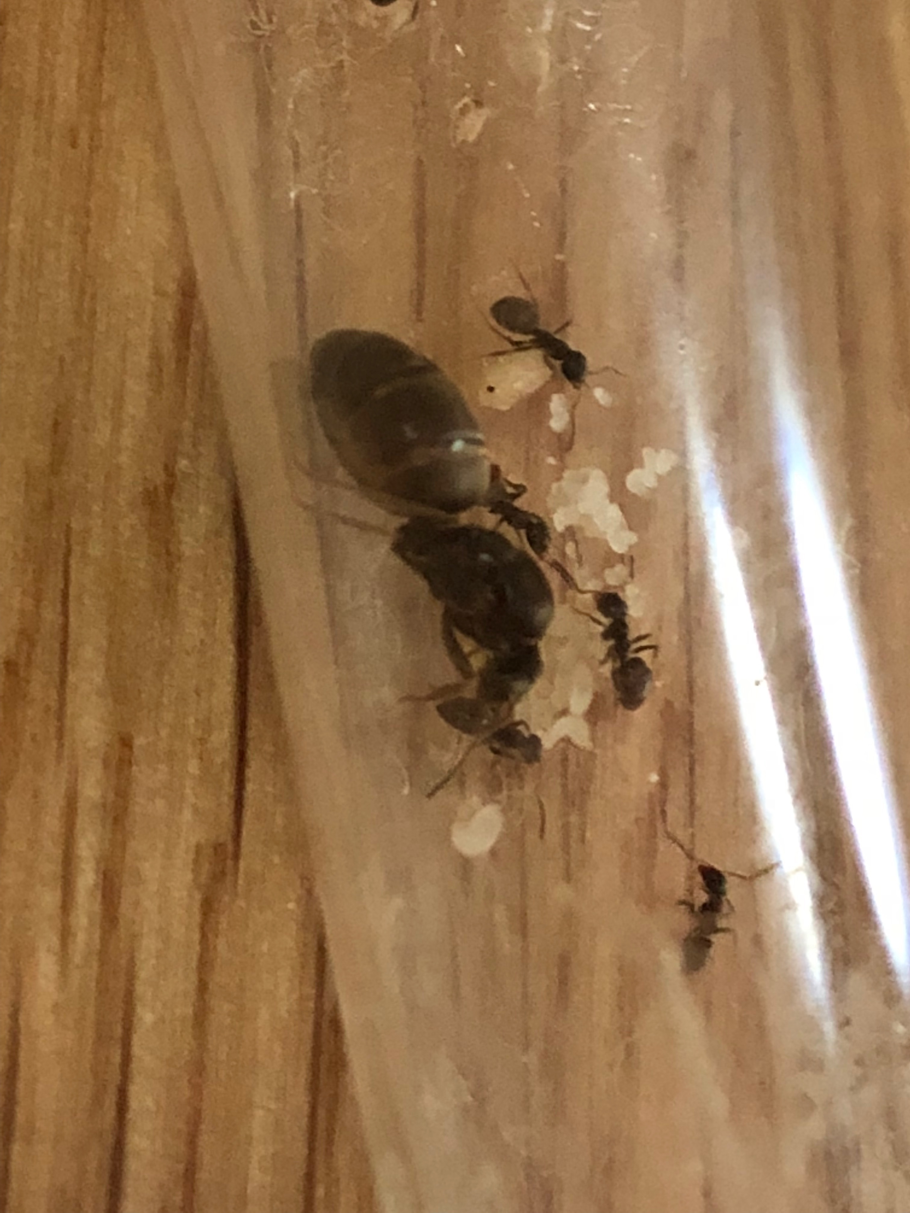 vor ca. einem Monat hatte ich auf dem Gehweg jede Menge dieser Ameisen gesehen und eine Königen in einem Regenzglas mit viel Wasser gehalten. Vor rund einer Wochen erwachten dann die ersten Arbeiterinnen. Ich bot schon ein wenig Zuckerwasser an, aber dies war nicht so beliebt. Nun zu meiner Frage, um was für eine Königen handelt es sich hier? Nicht das diese unter Artenschutz steht :huh: