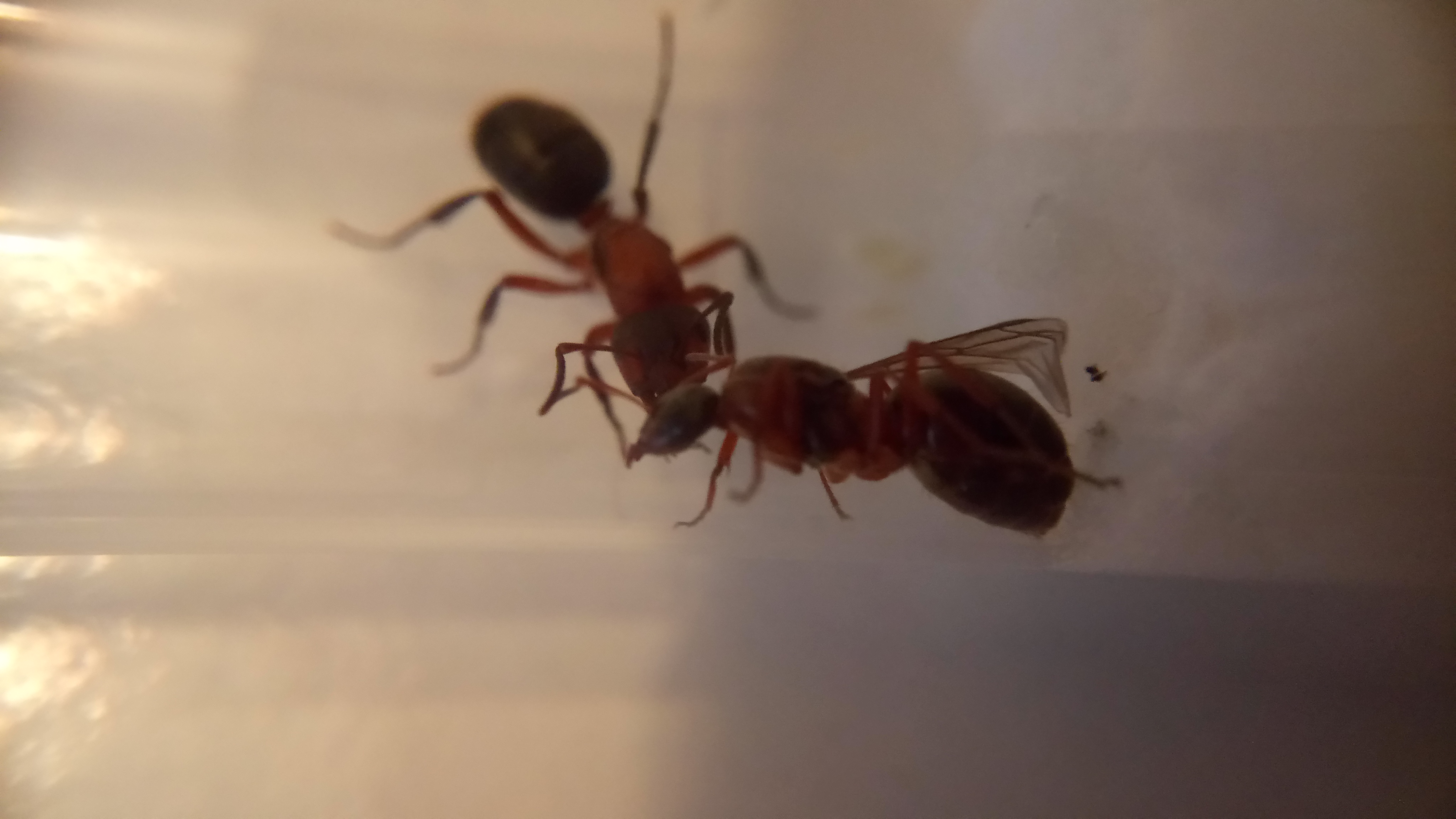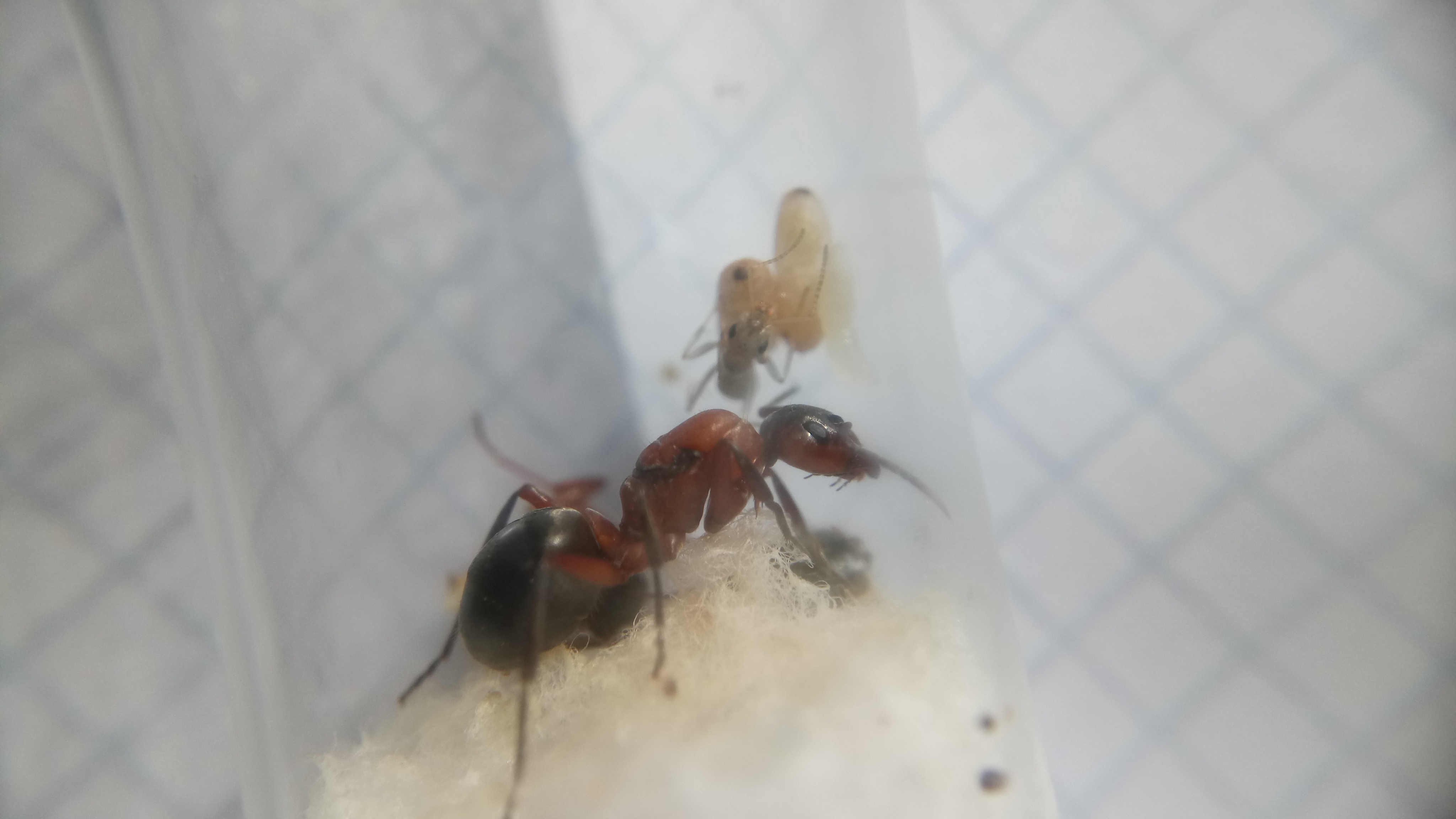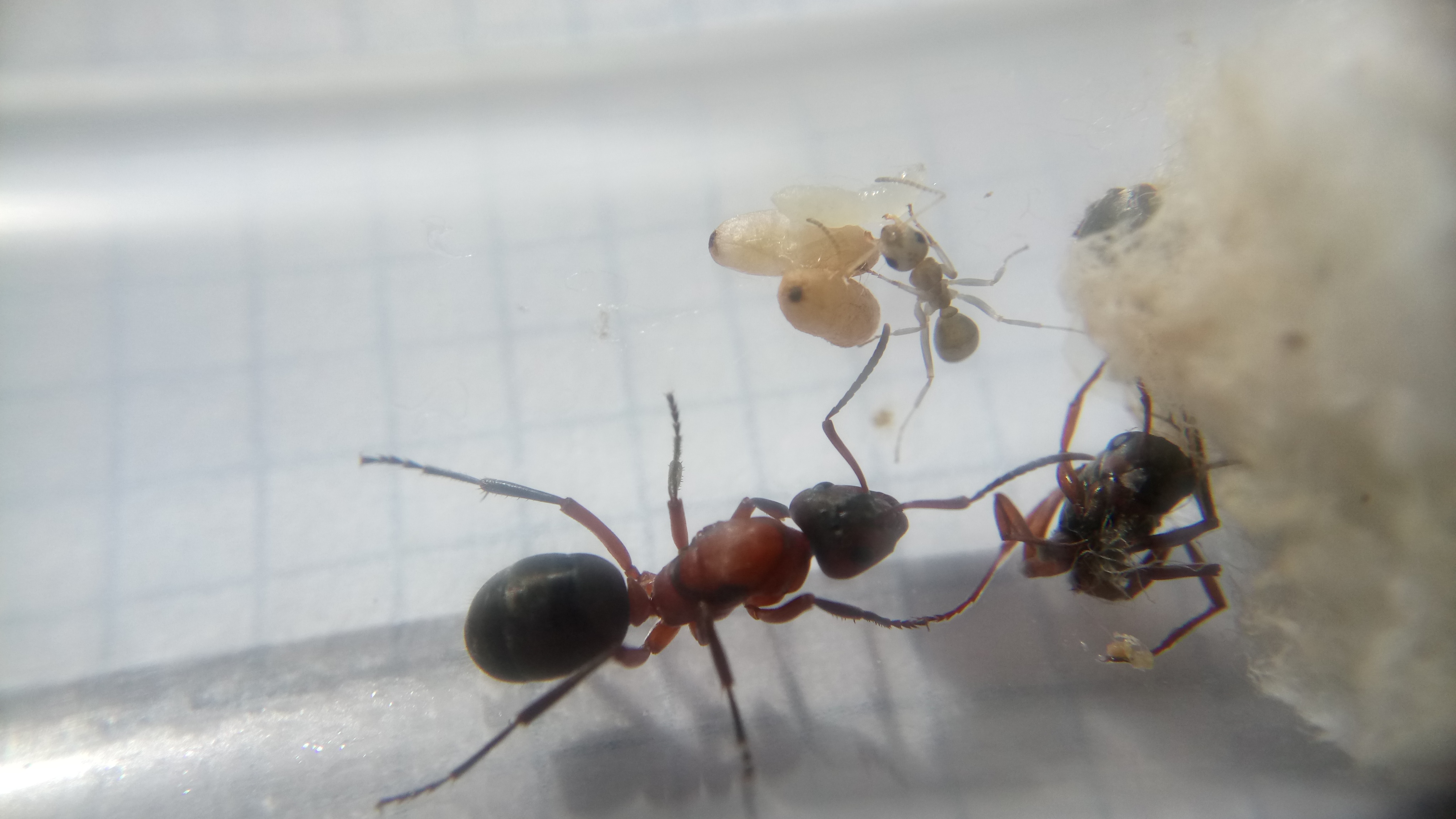 Die F. cunicularia Gyne war zuerst entspannt und blieb auf ihrer Watte sitzen, die Raptiformica Gyne war äußerst aufgebracht und rannte sofort ins zweite RG.