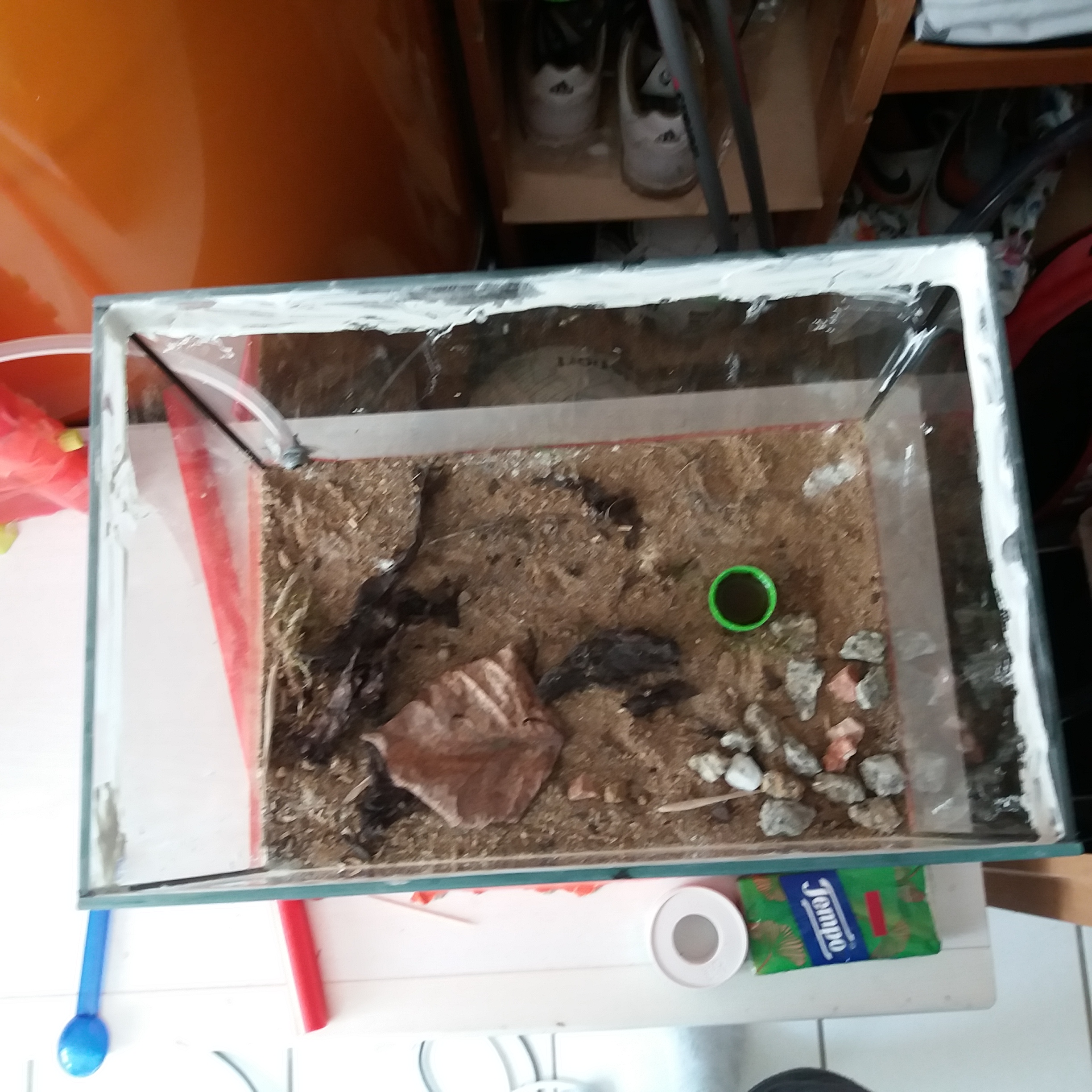 Was ich noch sagen muss, das Nest hatte ein paar Luftlöcher drinnen, damit das Nest belĂŒftet ist und durch die sind dann Arbeiterinnen durchgekommen. Hab sie aber dann mit Tesa zugeklebt bis auf 4 Kleinere, die oben am Deckel sind.