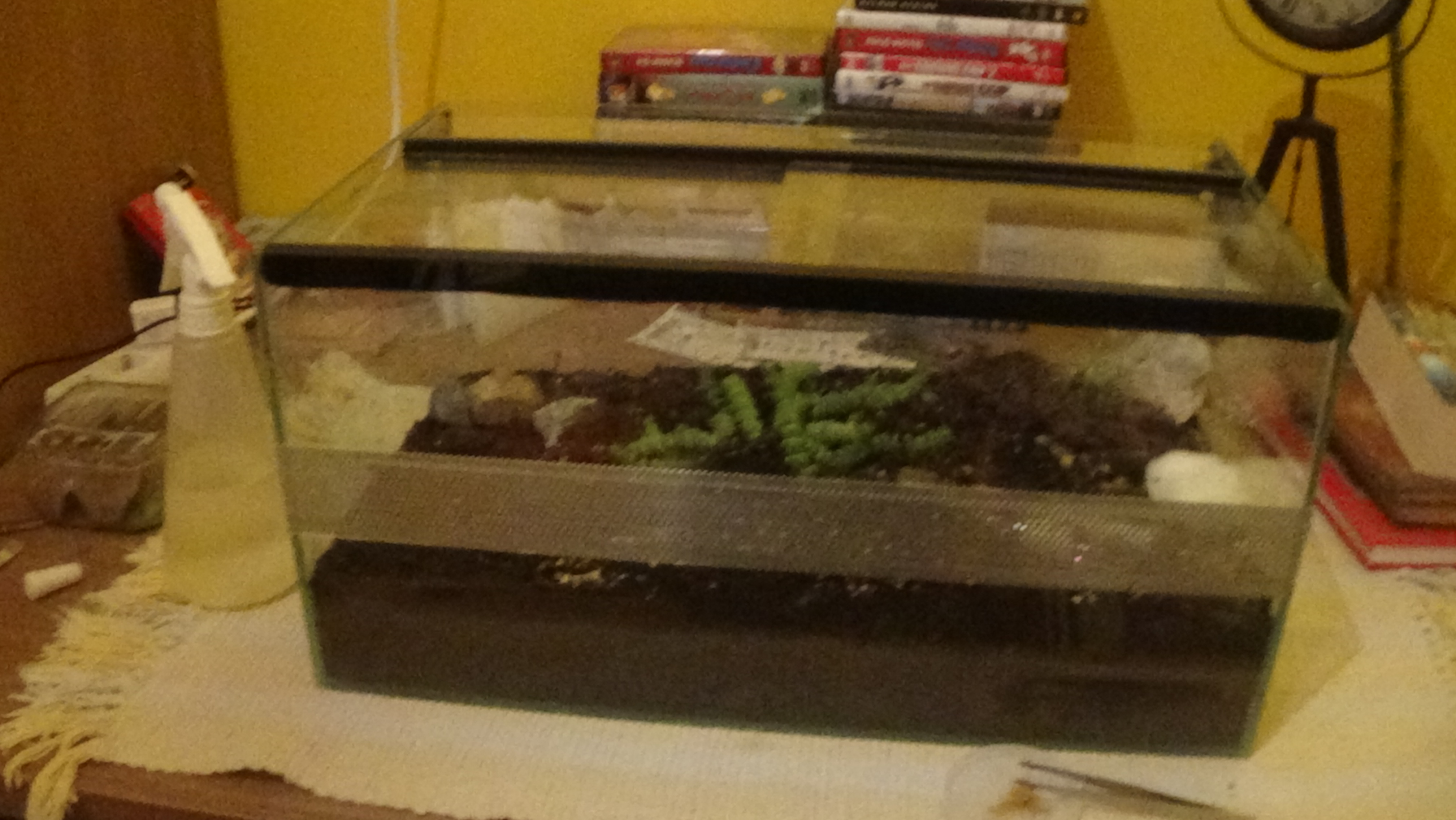 Als Futter hatte ich, tote und lebendige Kurzflügelgrillen, Honig auf Löffel, einen Apfel und Wasser in einem Reagenzglas.