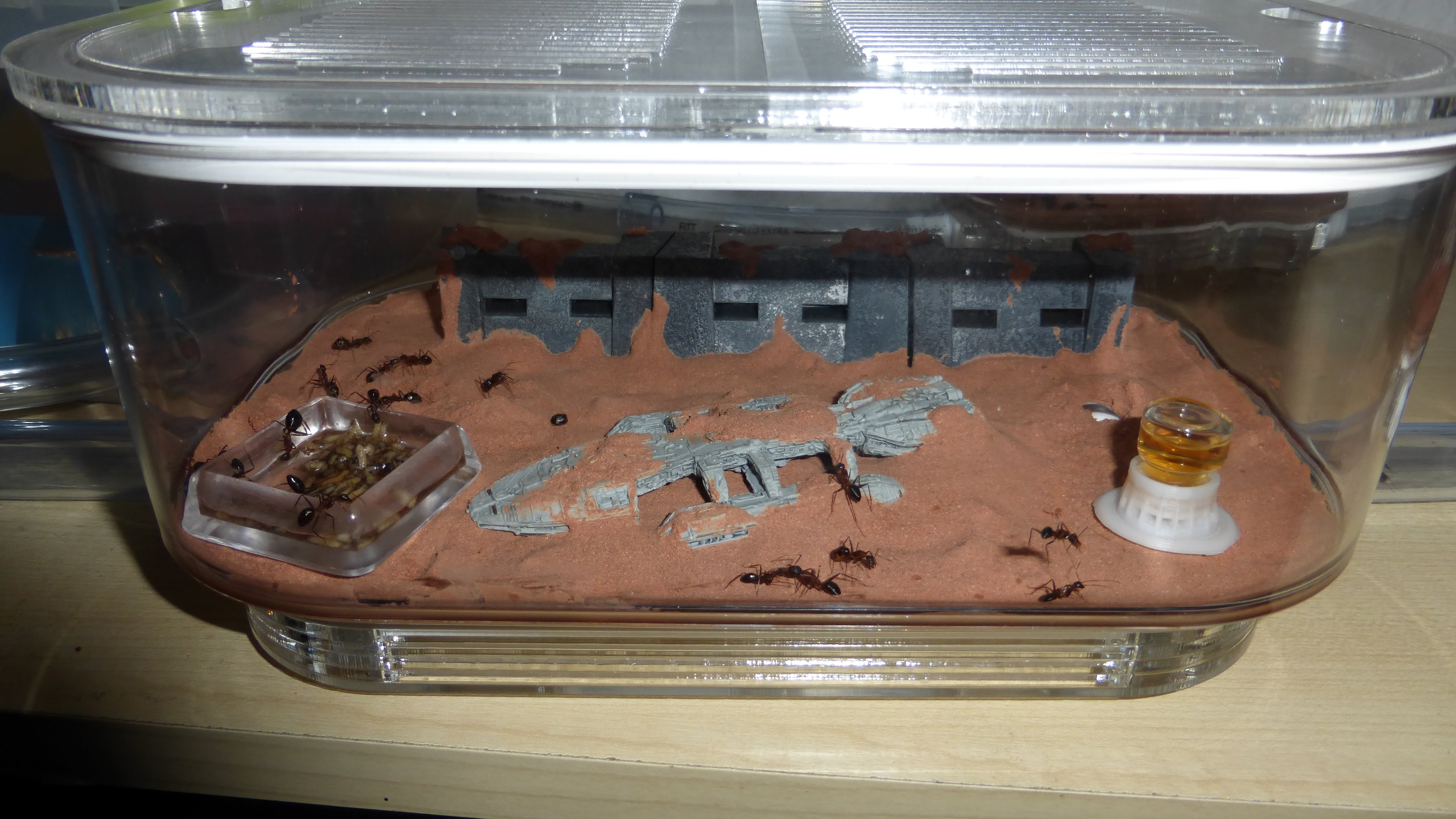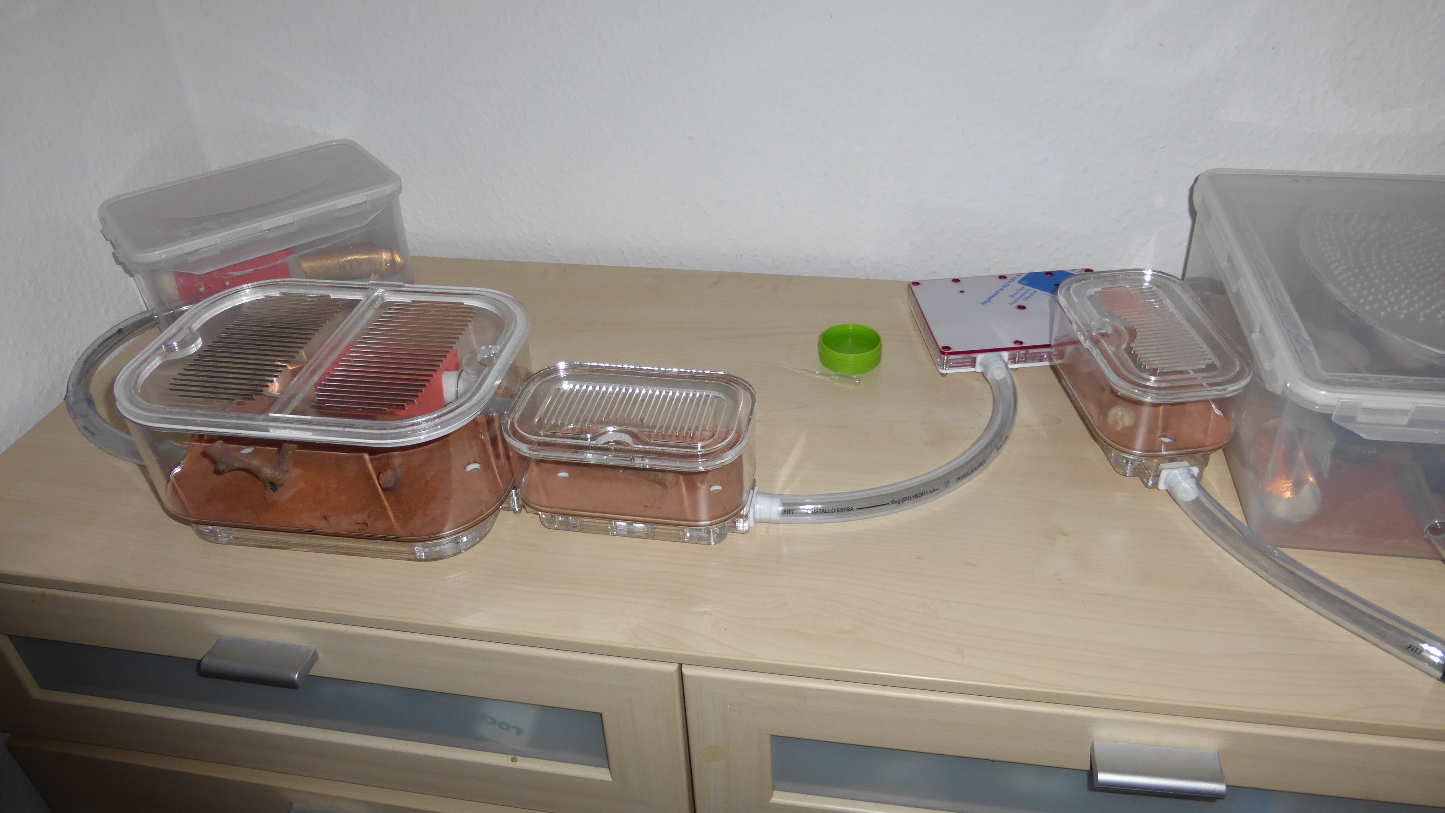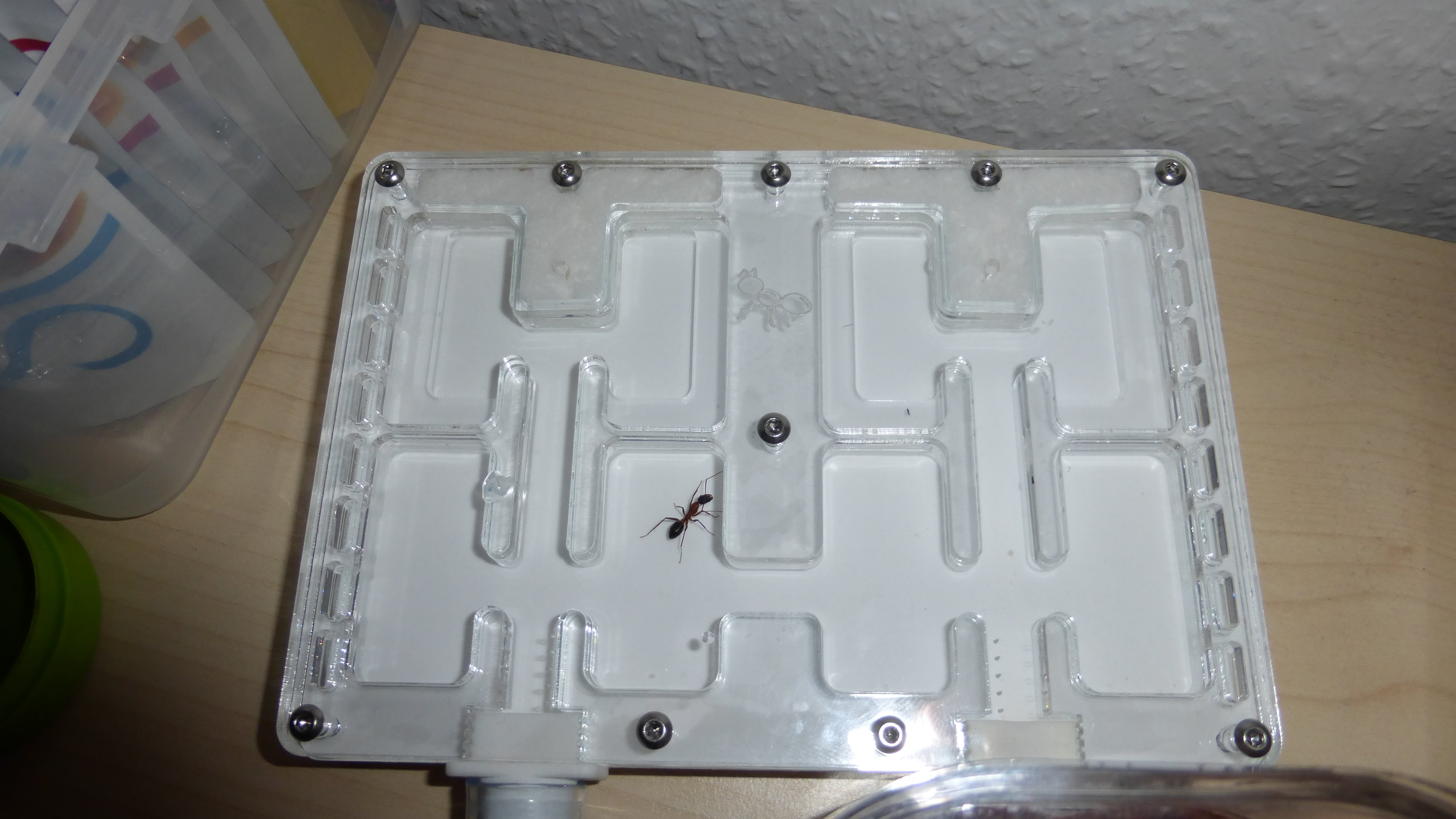 Das Antkit Size8 und seine vorgeschobene Arena am neuen Platz. Hinten kann man den mit Watte verstopften Port einer Miniarena sehen, die später mit der alten Arena 2 (der Plastikbox, die an der rechten Ecke der Kommode stand) verbunden werden sollte.