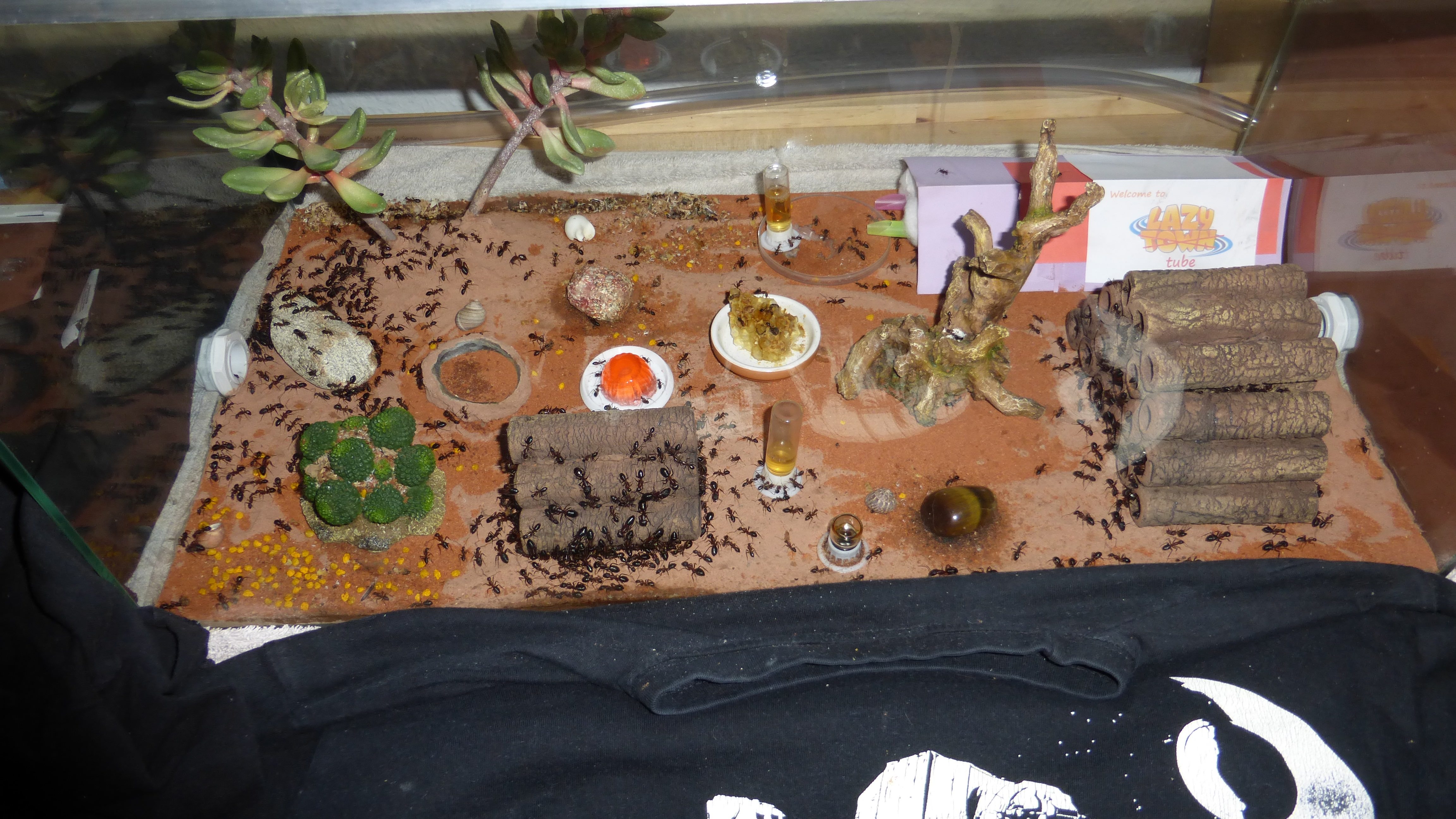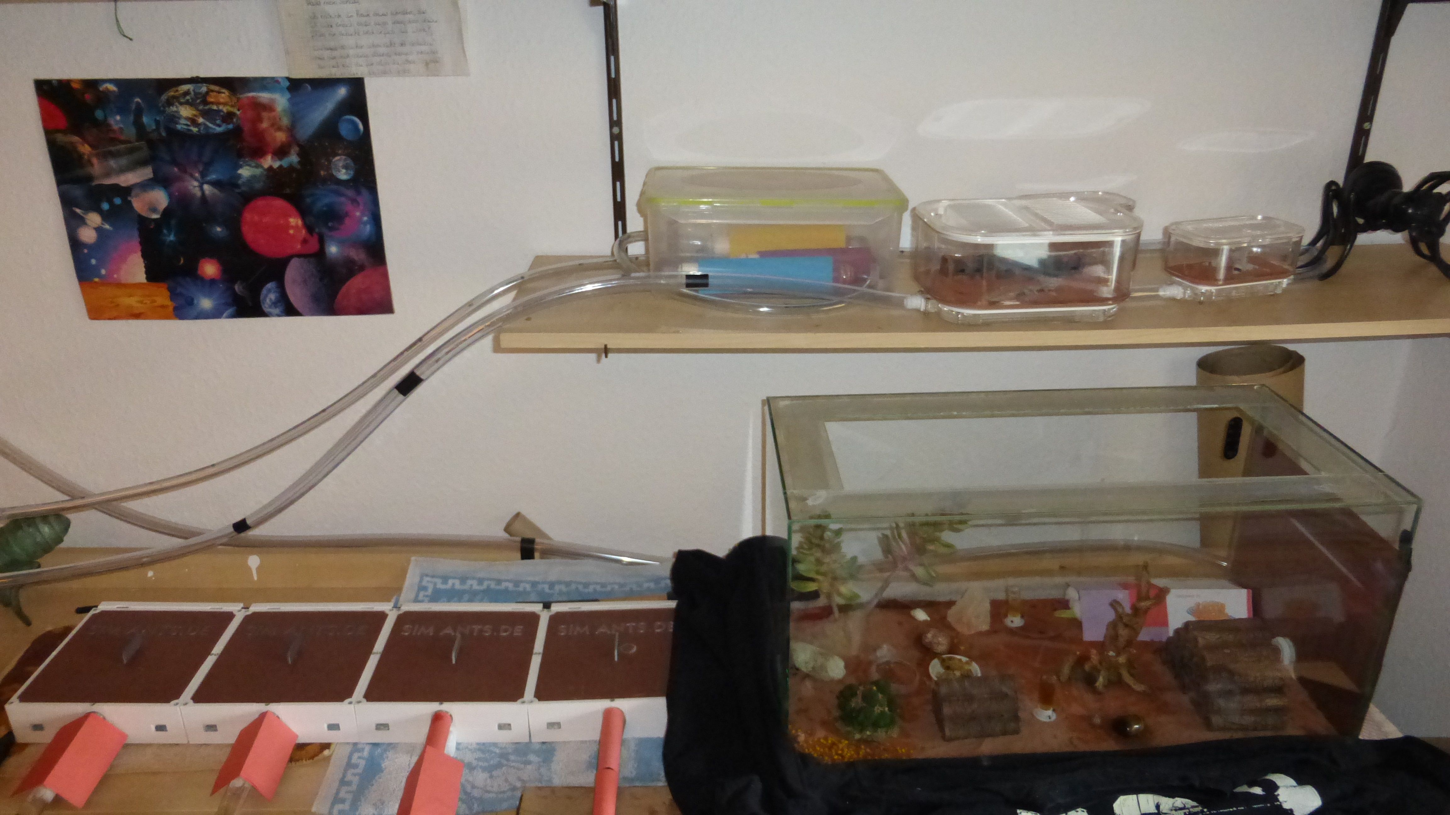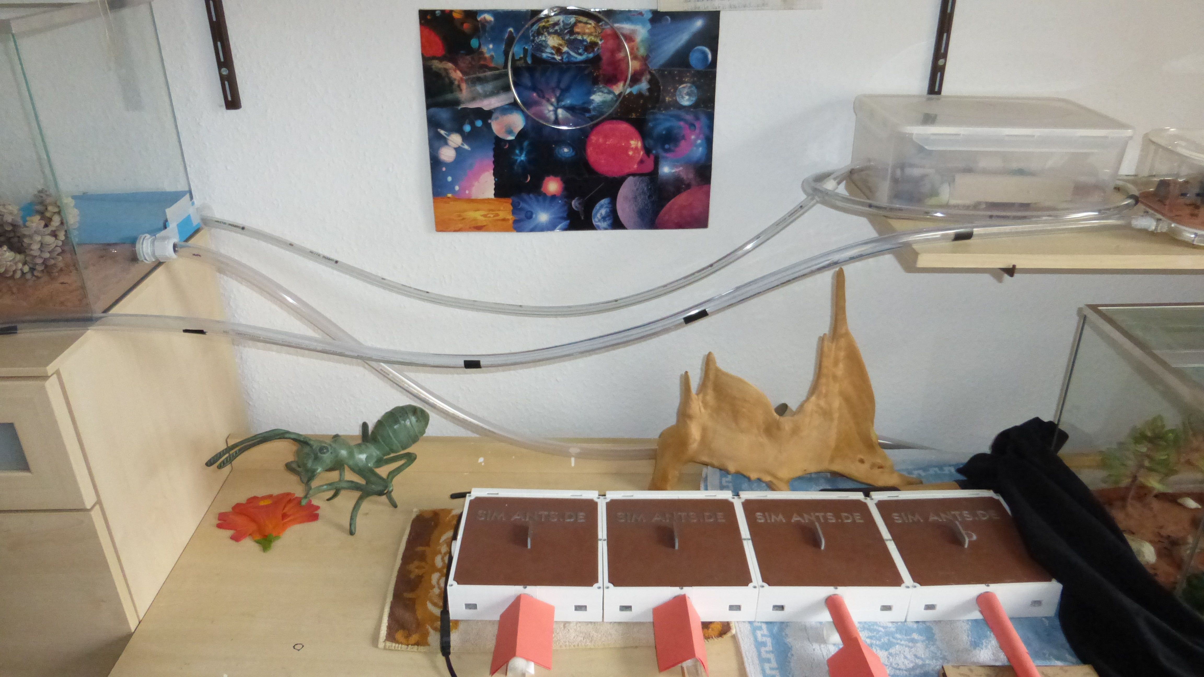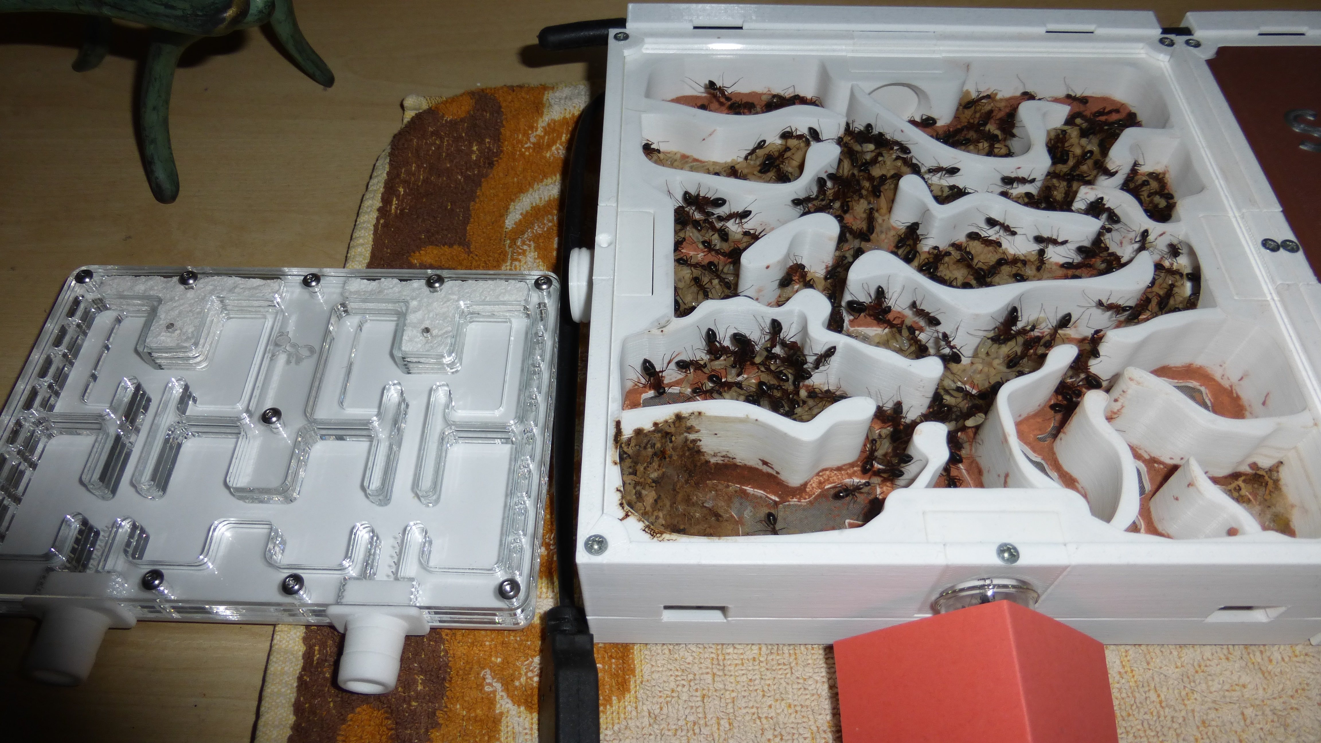 Das Antkit Size8 und seine vorgeschobene Arena am neuen Platz. Hinten kann man den mit Watte verstopften Port einer Miniarena sehen, die später mit der alten Arena 2 (der Plastikbox, die an der rechten Ecke der Kommode stand) verbunden werden sollte.
