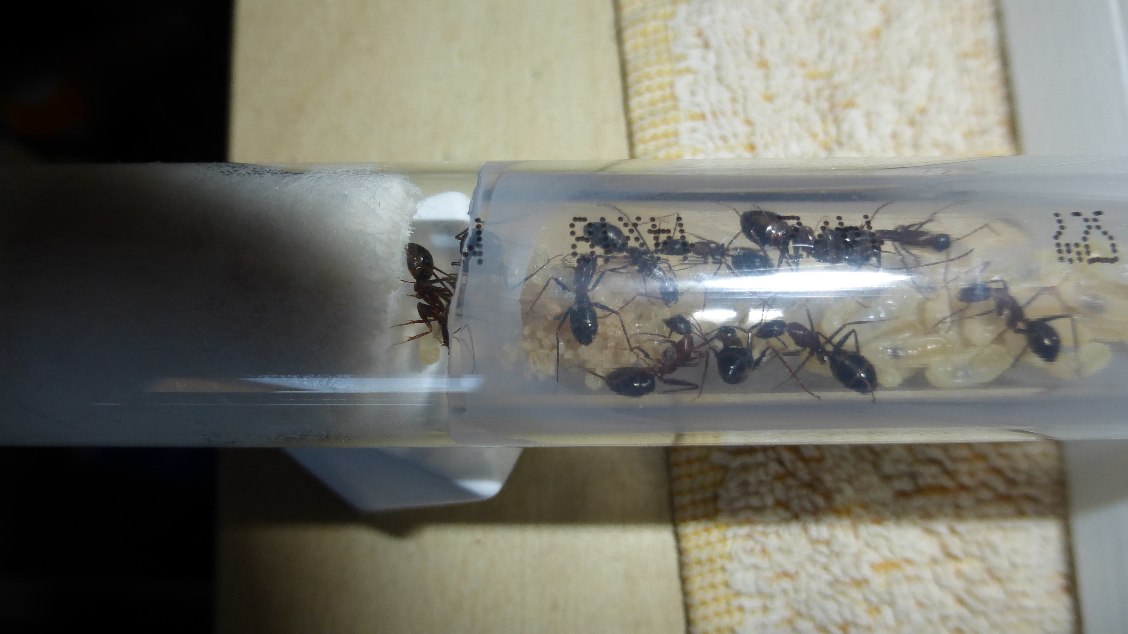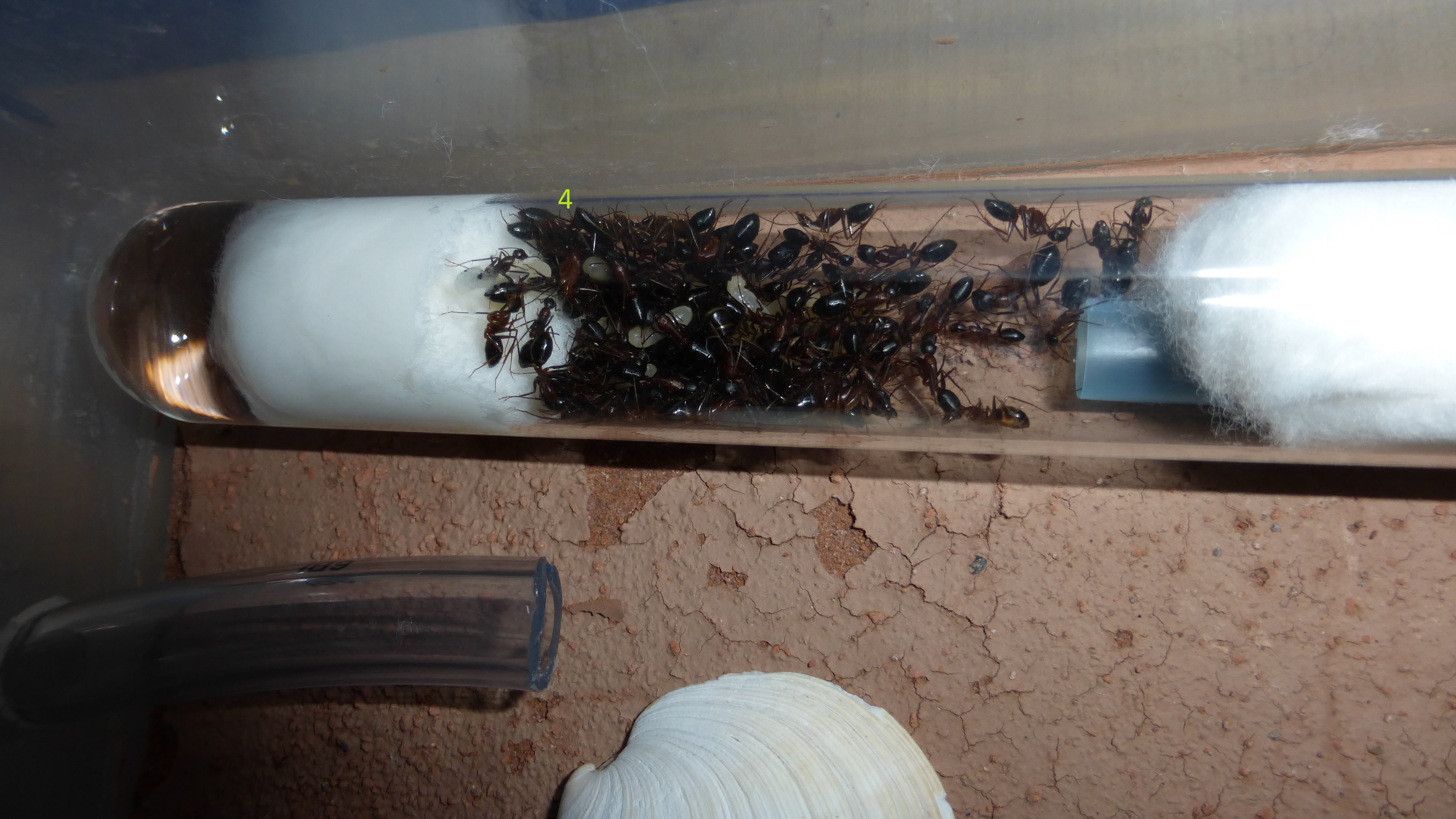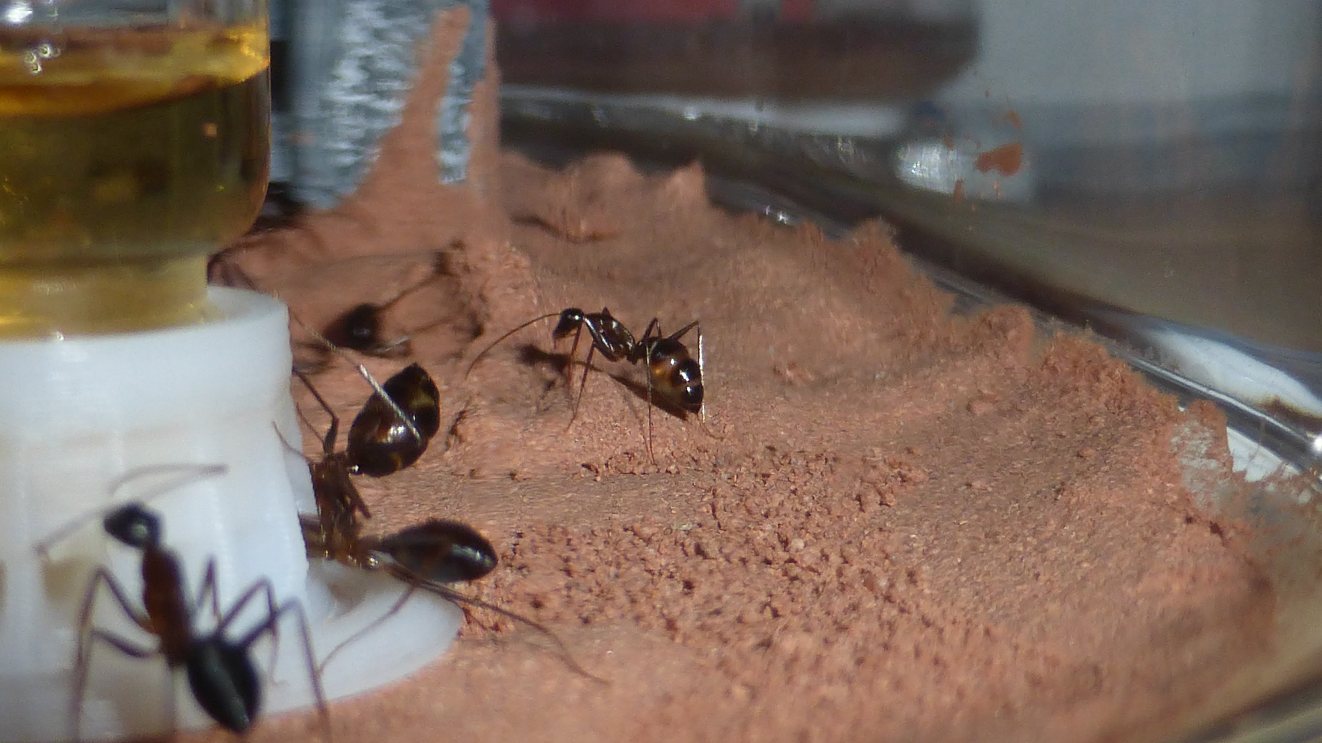 Jetzt begann der spannende Teil - zuerst kam das neue Becken auf die Kommode, dann mussten 3 Reagenzgläser voller Ameisen von der auszumusternden Plastikbox in das neue Becken verlegt werden. Hab am Ende einfach ganz pragmatisch die komplette Box in das neue Becken gestellt, Rahmen aufs Becken gelegt, Deckel der Box abgenommen und die RGs von Hand in die vorgefertigten Vertiefungen umgelegt - das hatte den zusätzlichen Vorteil, dass Ameisen die aus der Plastikbox gekrabbelt sind direkt im neuen Becken landeten. Am Ende mussten dann nur noch eine Handvoll Arbeiterinnen umgesiedelt werden, die den Weg aus der Box nicht selber fanden (ging auch per Hand).