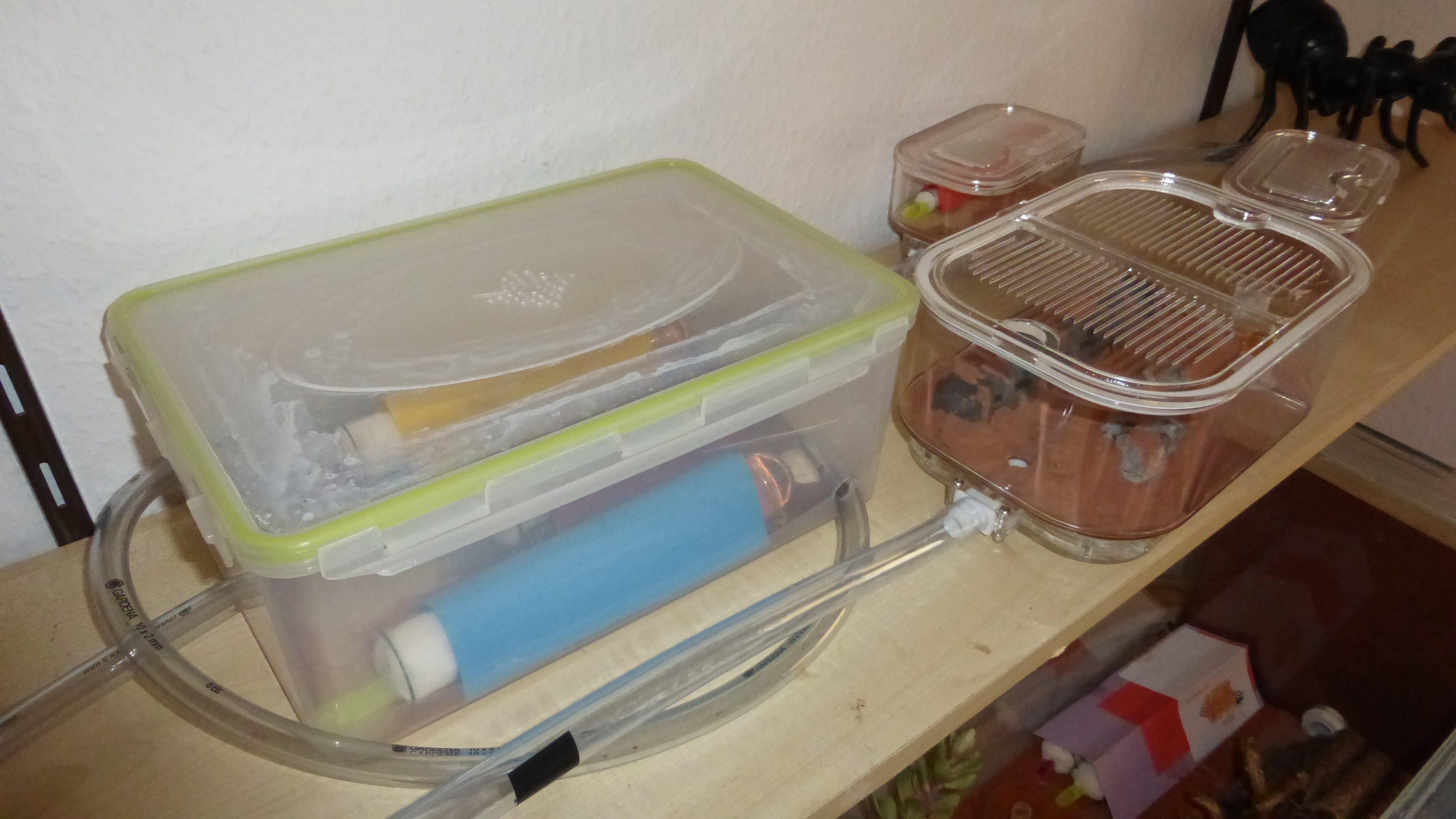 Als erstes kam das Antkit Size8 Acrylnest vom Netz, das ganz an die andere Seite wandern würde. Nachdem das erledigt war (siehe Bild weiter unten) wurde die alte Arena 2 (Plastikbox) rausgeschnitten, an deren Platz (rechts auf der Kommode) der neue Tank stehen sollte. Als letztes musste dann die alte Arena 3 (zweite Plastikbox) entfernt werden - die war zur Ausmusterung bestimmt, da eine ausgelaufene Tränke und ein Müllhaufen die Box doch ziemlich versaut hatten.