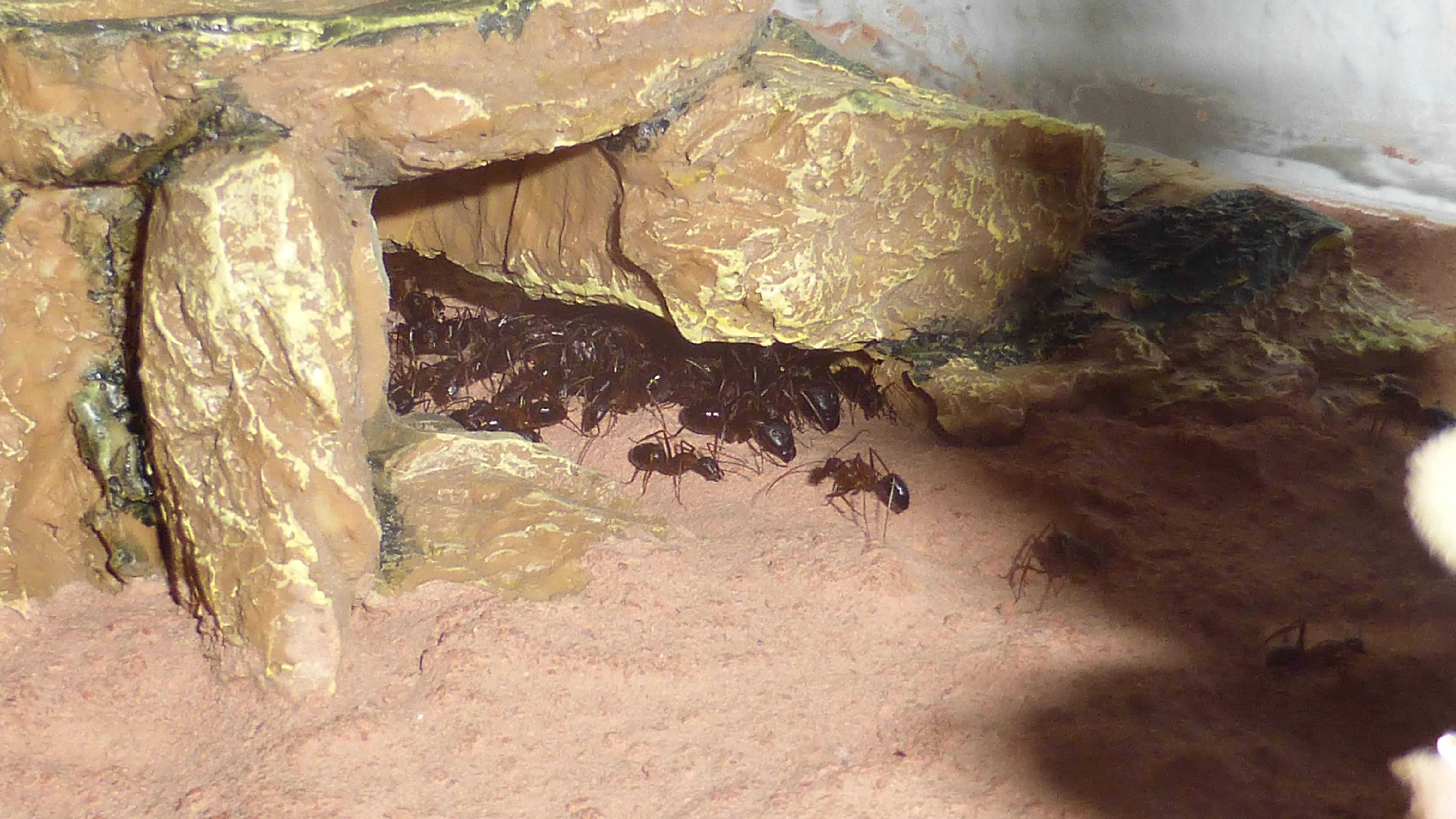 Die aufgescheuchten Arbeiterinnen suchten erstmal unter dem Dekofelsen Schutz.